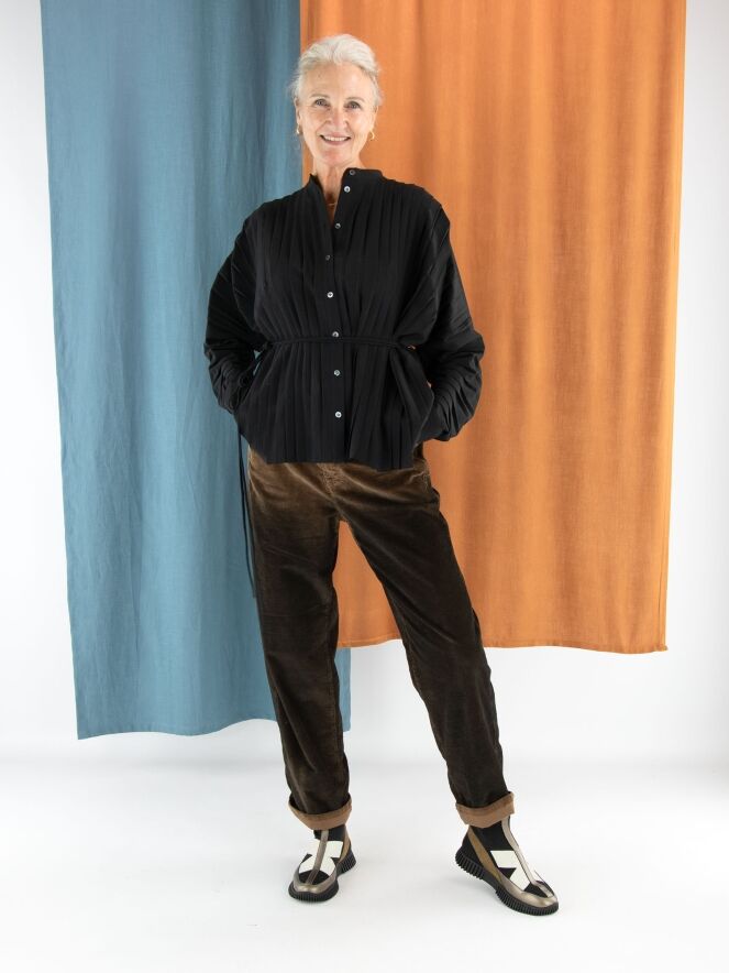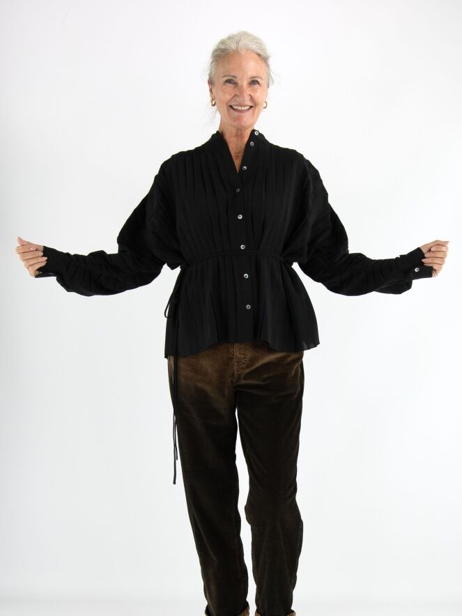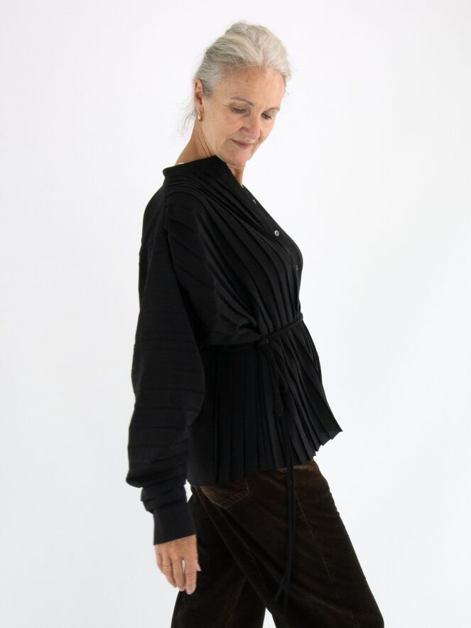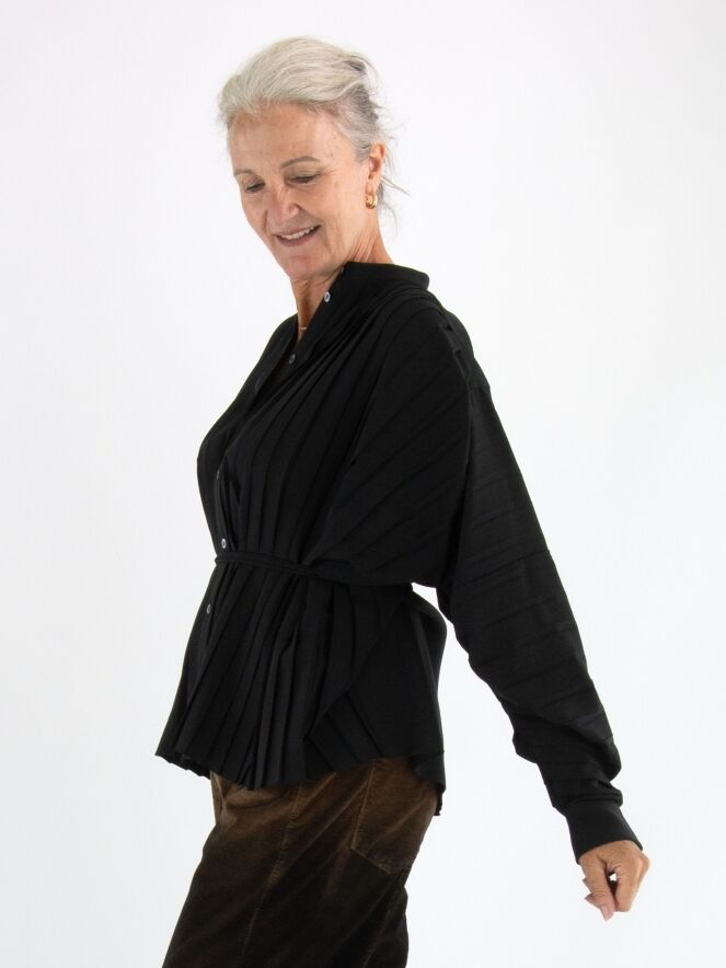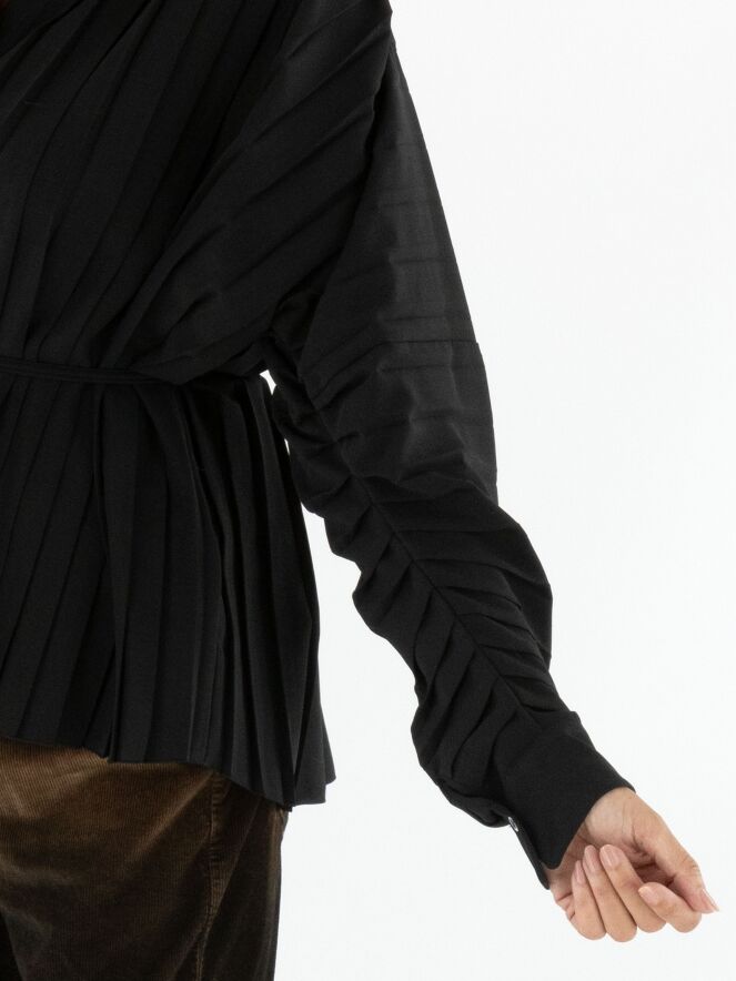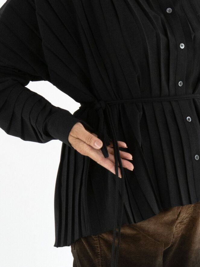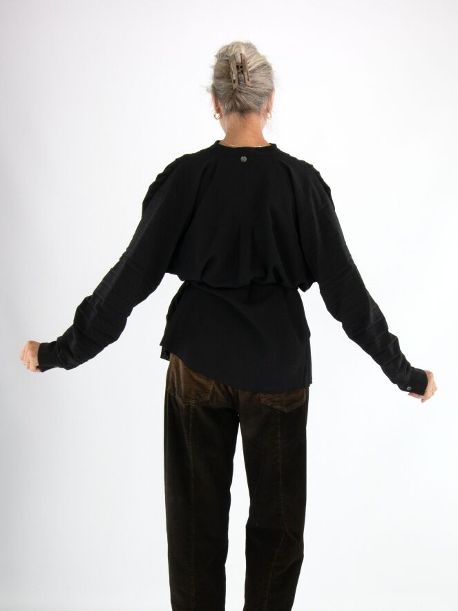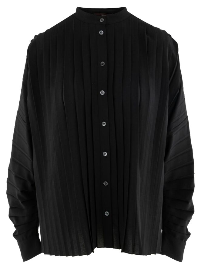 Un chemisier de la marque High en noir. Le devant du chemisier est confectionné dans une structure plissée. Le long de la couture au bas des manches longues, le tissu est froncé dans un effet plissé vers les manches. Ce chemisier doit être lavé à la main.