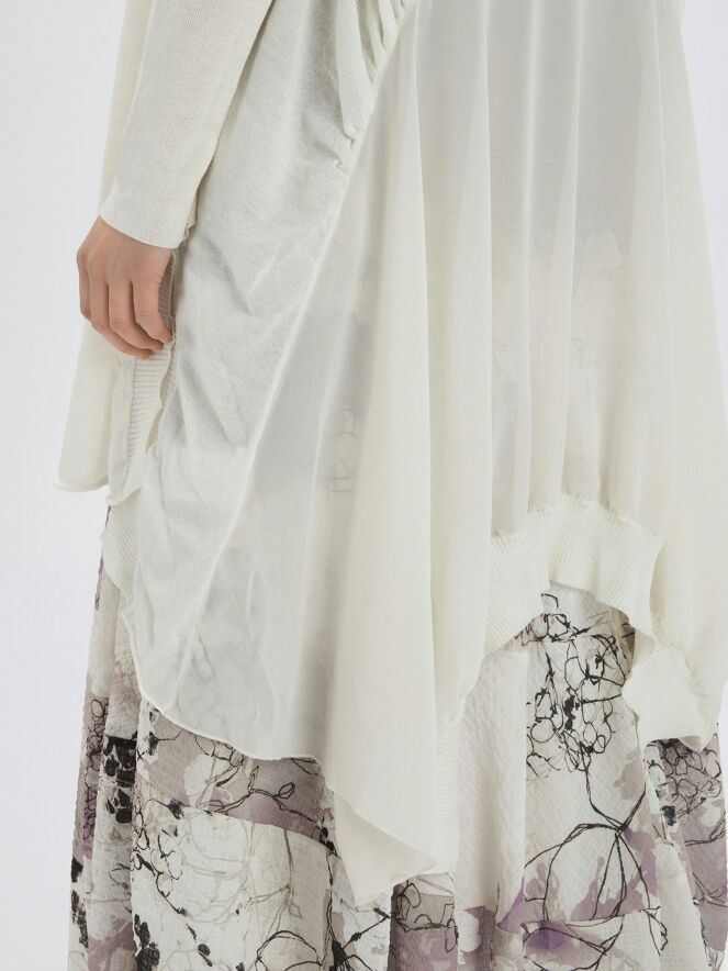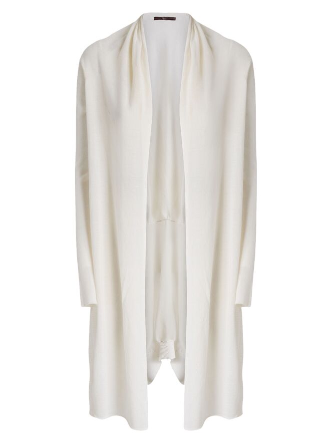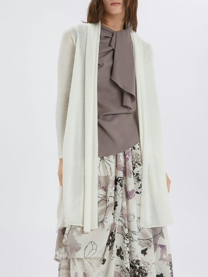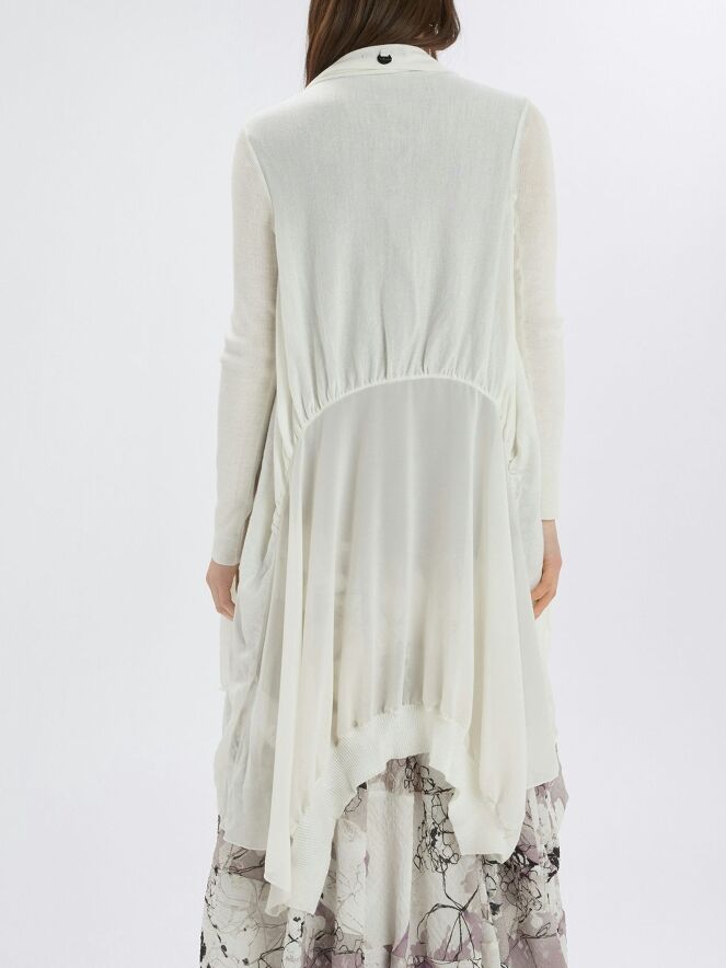 Un long gilet luxueux de High en blanc crème. Le gilet présente un col châle et ne possède pas de fermeture. À l’arrière, une couture arrondie au niveau de la taille dévoile un empiècement de tissu transparent. Ce gilet peut être lavé à la main.