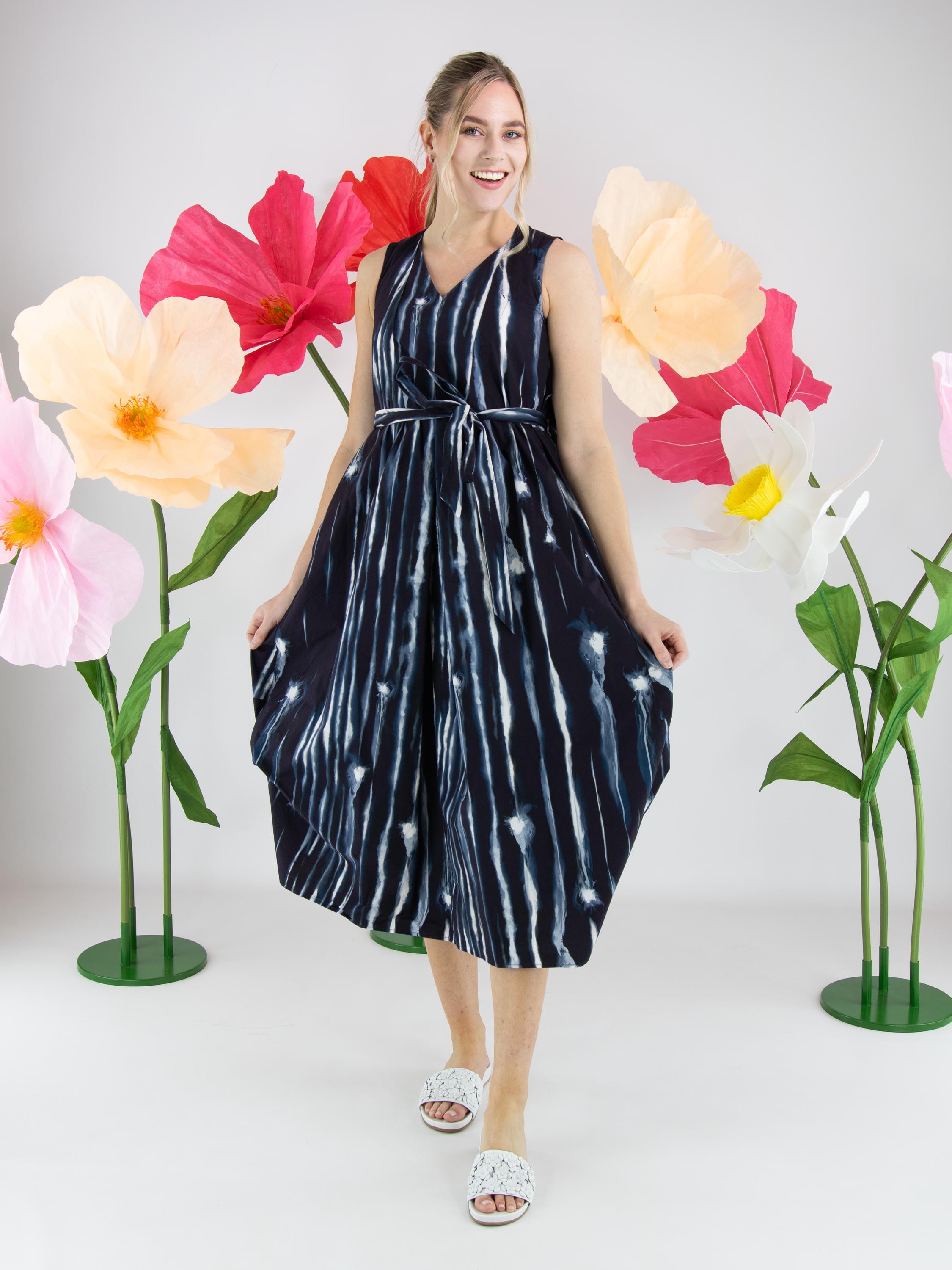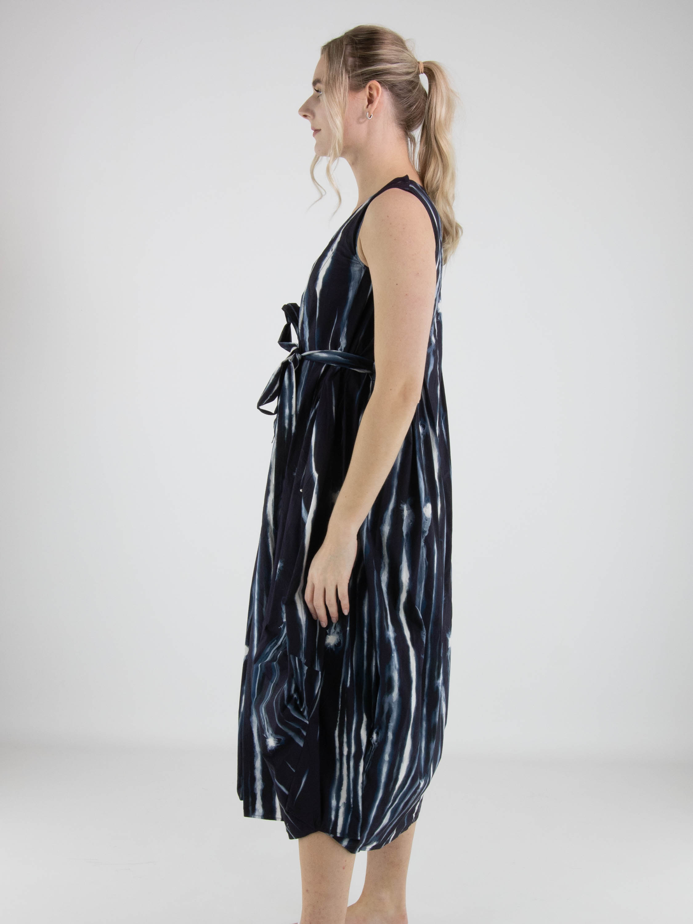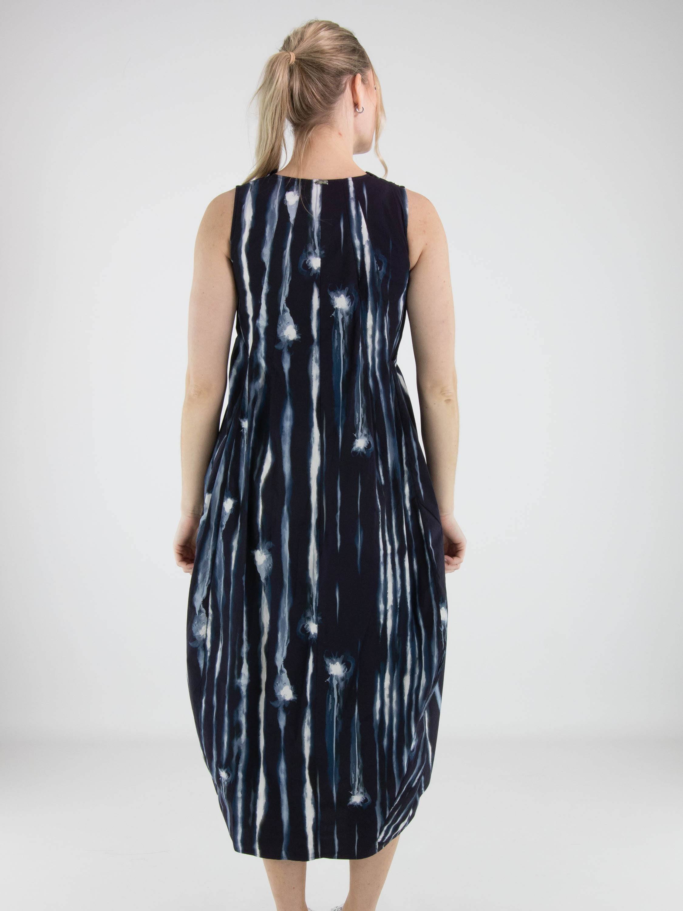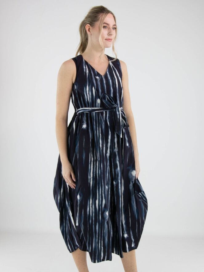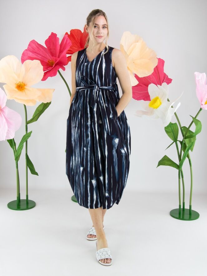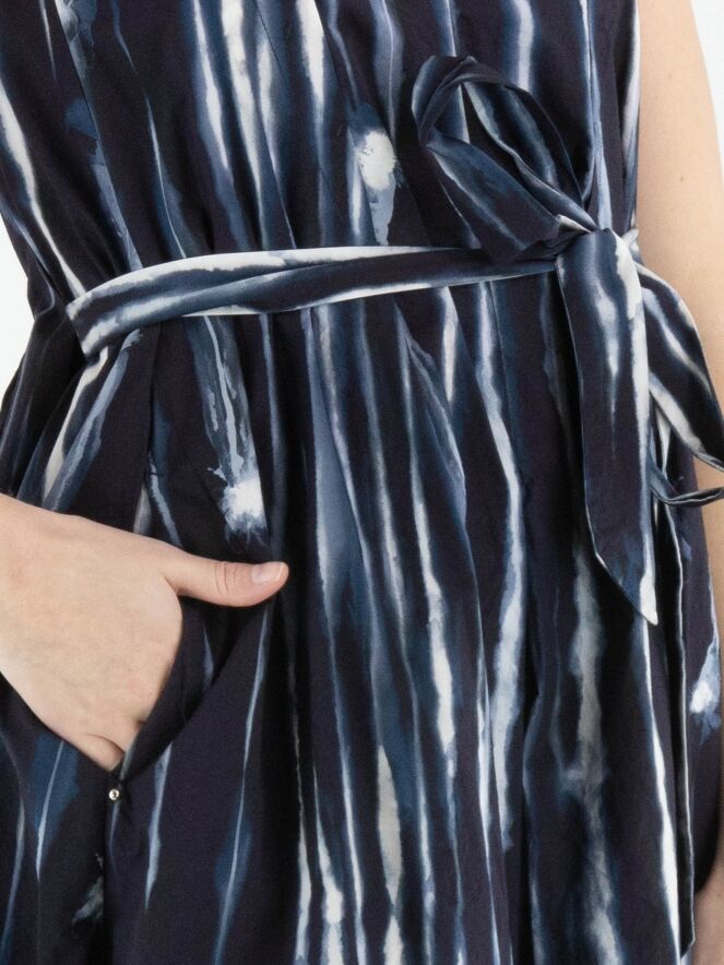 Robe de High avec un imprimé graphique effet peinture composé de lignes verticales blanc crème sur un fond de plusieurs nuances de bleu marine. À la taille, une ceinture dans le même tissu que la robe se prolonge à l’intérieur dans le dos. À partir de la taille, la robe adopte une légère forme ballon, créant une silhouette contemporaine et féminine. Des poches sont intégrées à hauteur de taille. Cette robe peut être lavée à 30 degrés.