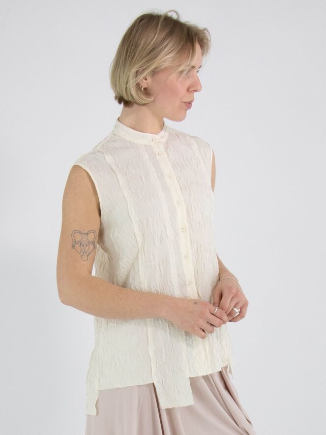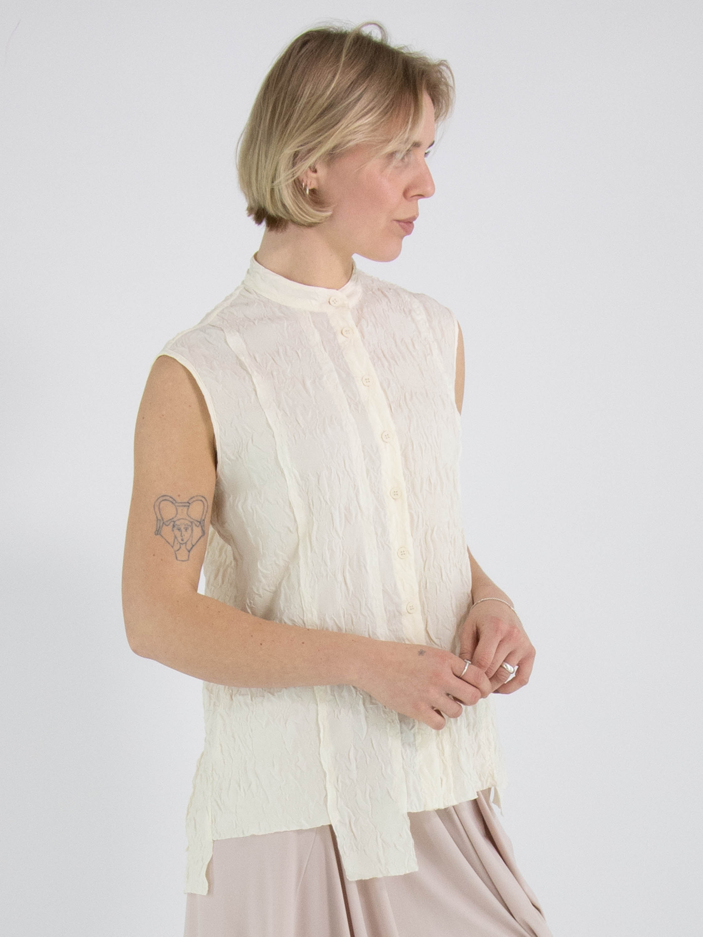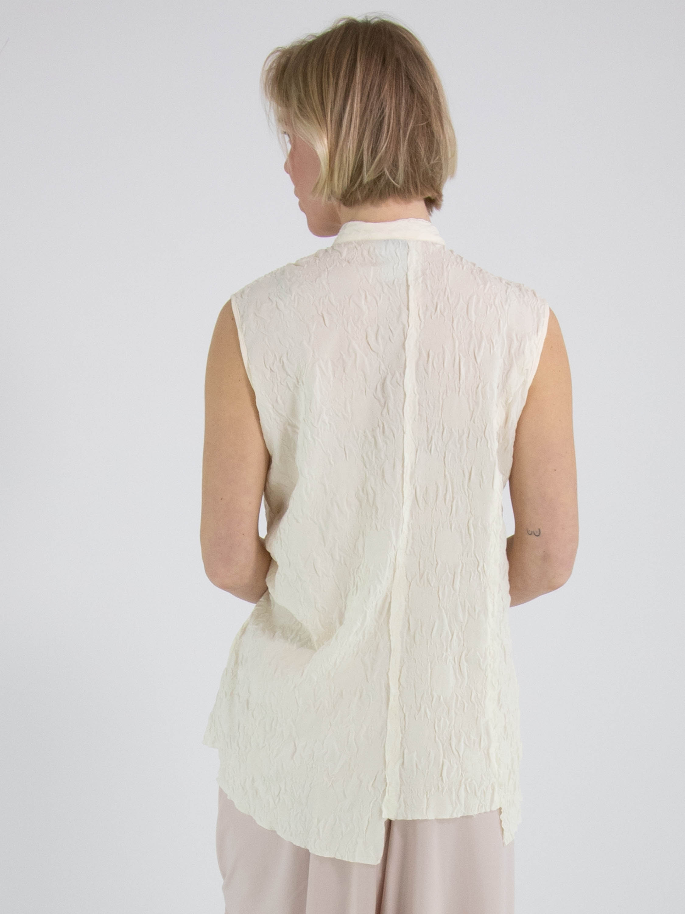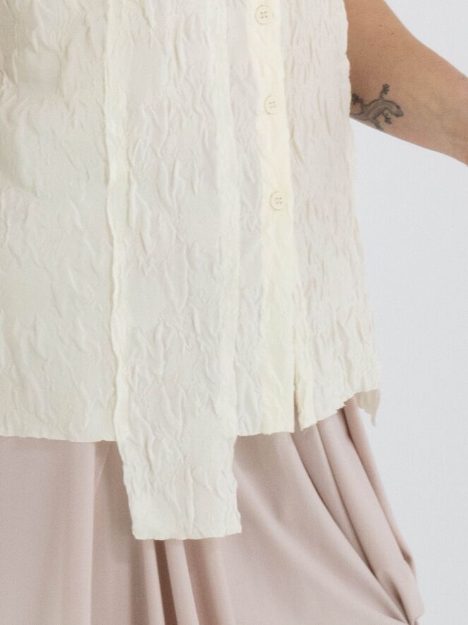 Un gilet smocké de High Lab en noir. Le gilet possède une fermeture à boutons et une couture inversée au centre du dos. Ce gilet peut être lavé à la main.