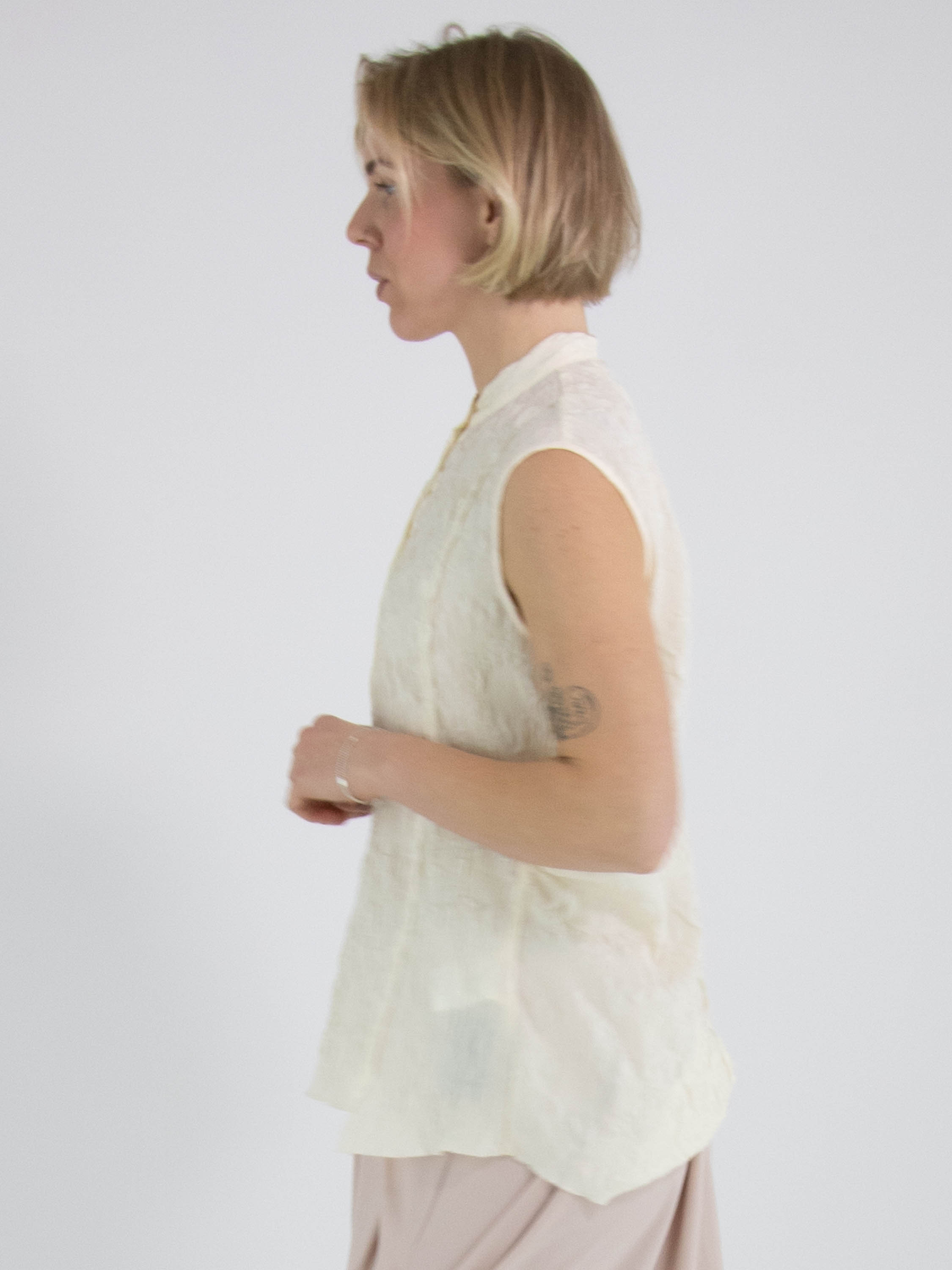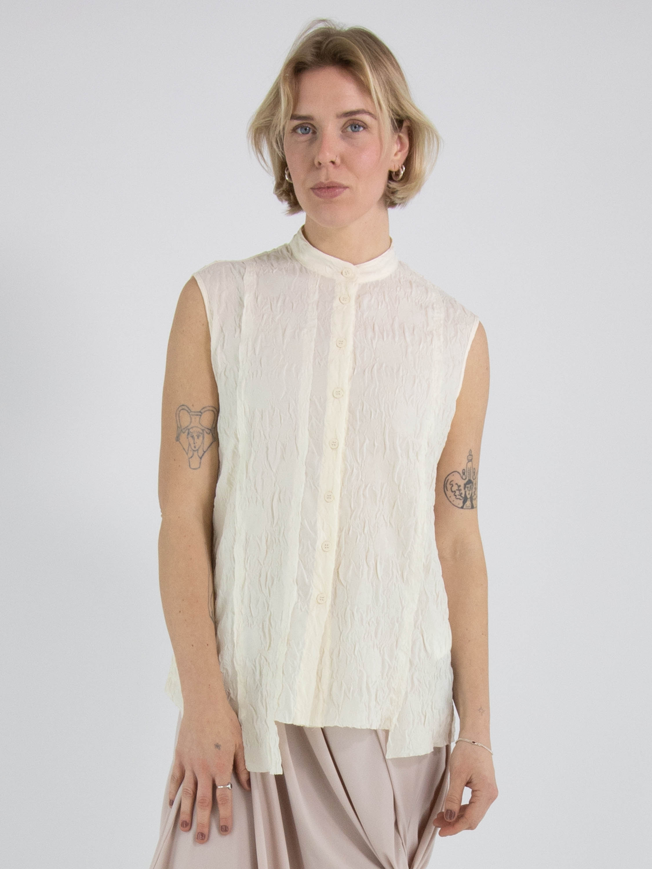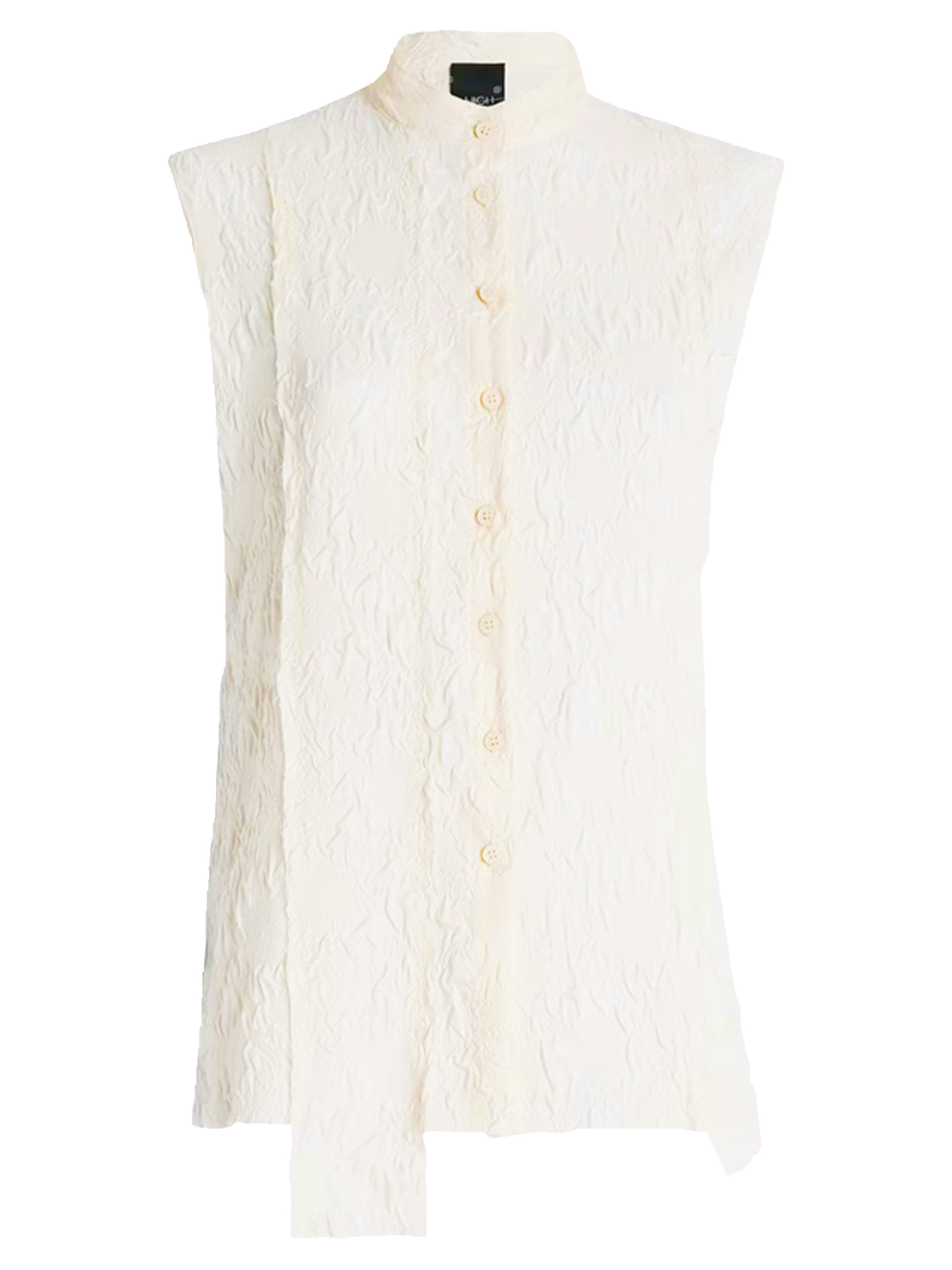 Un gilet smocké de High Lab en noir. Le gilet possède une fermeture à boutons et une couture inversée au centre du dos. Ce gilet peut être lavé à la main.