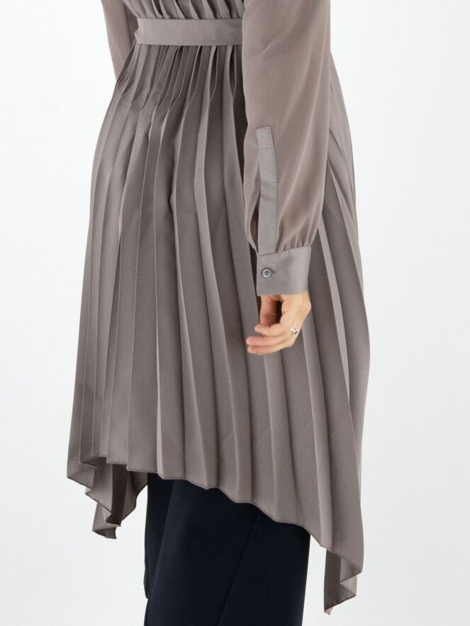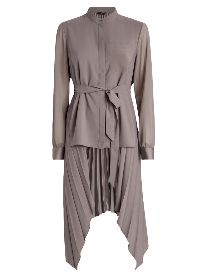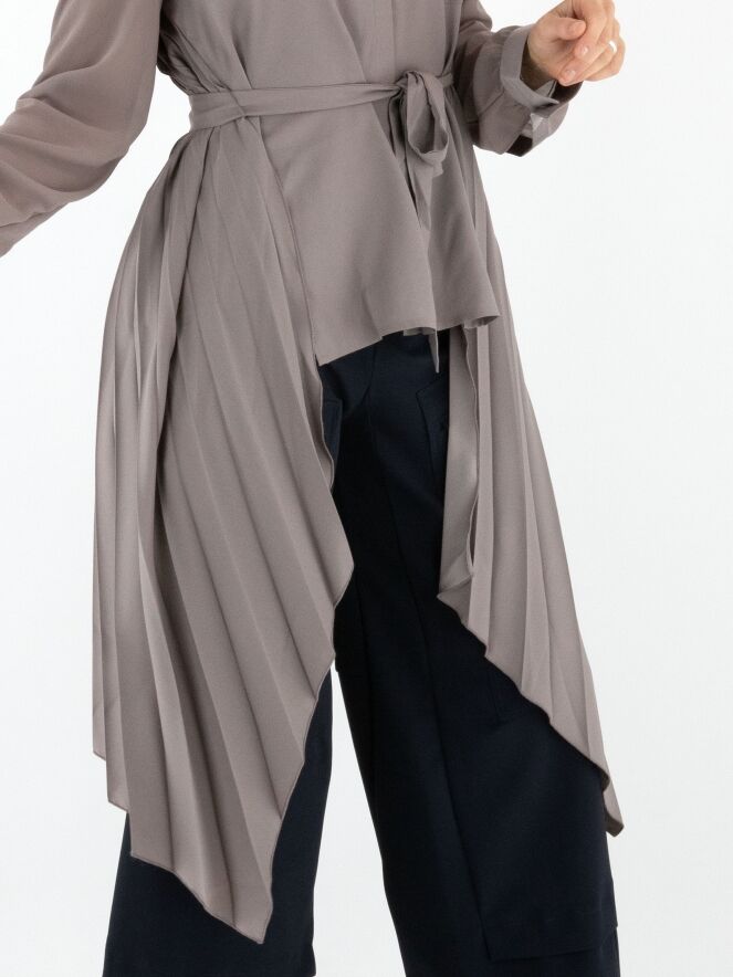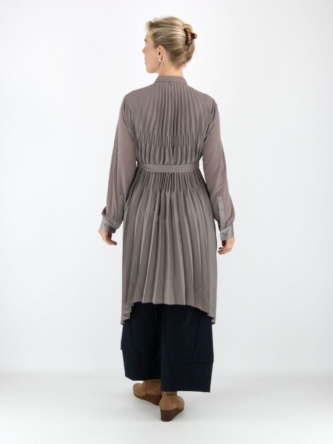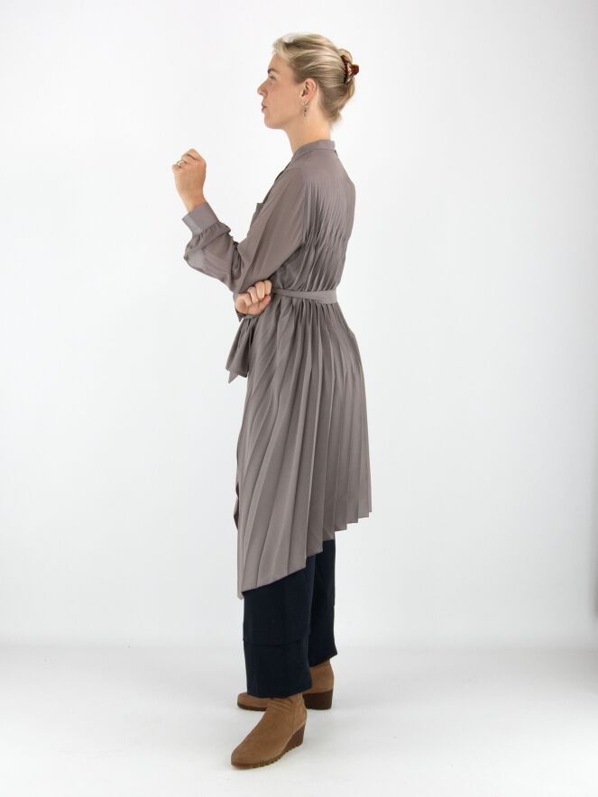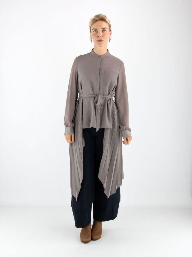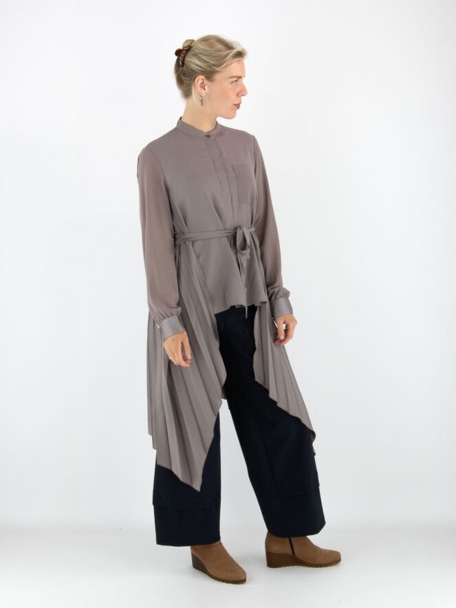 Blouse ou tunique de couleur grise. Le devant est en tissu uni avec une fermeture à boutons dissimulée. Le dos présente un fin plissé partant de l'encolure. À la taille, une ceinture dans le même tissu que la blouse vient souligner la silhouette. Cette blouse se lave à la main.