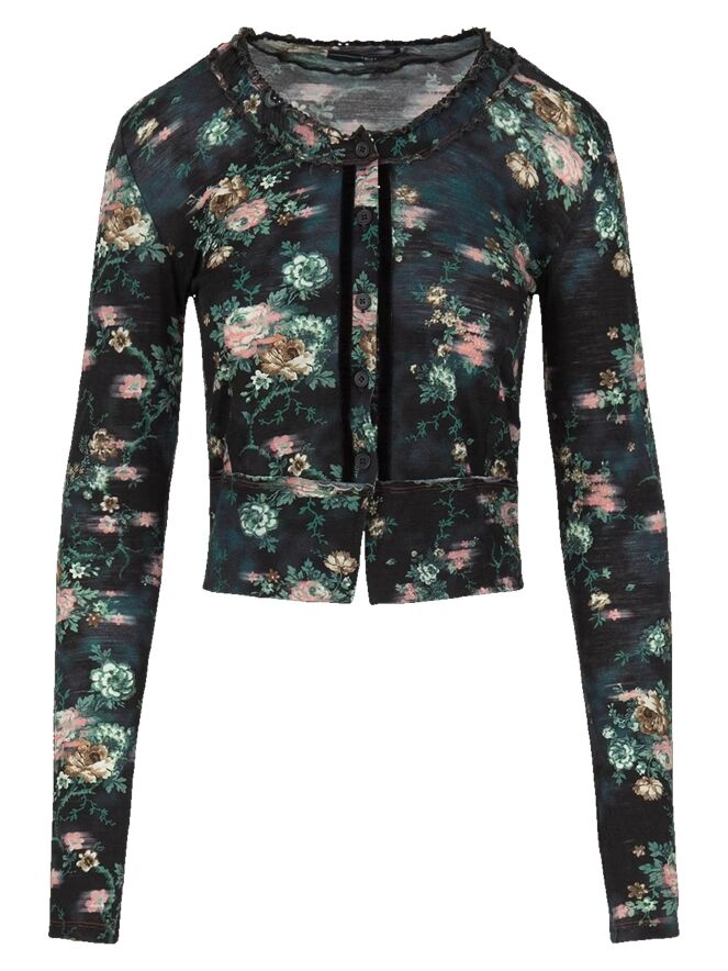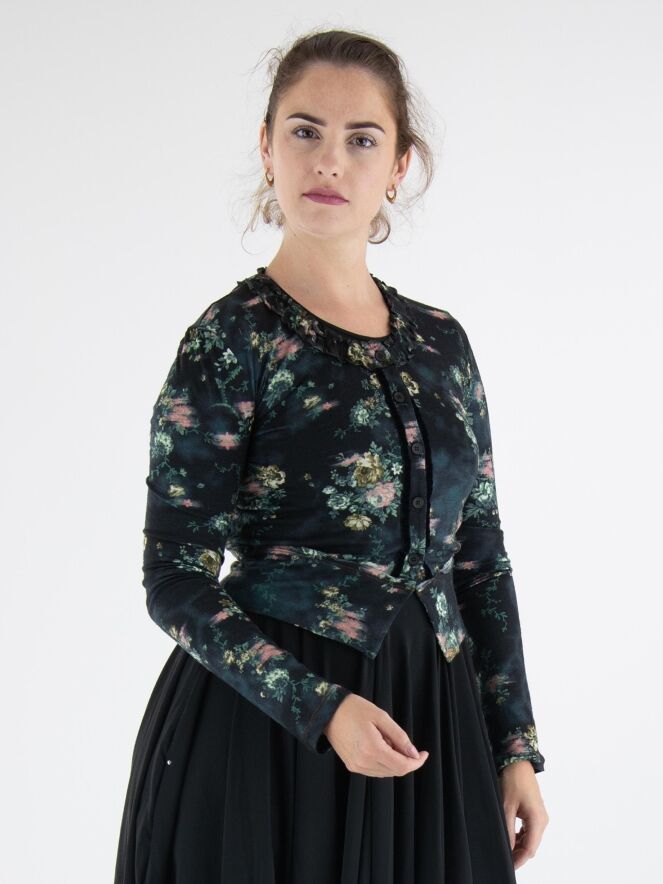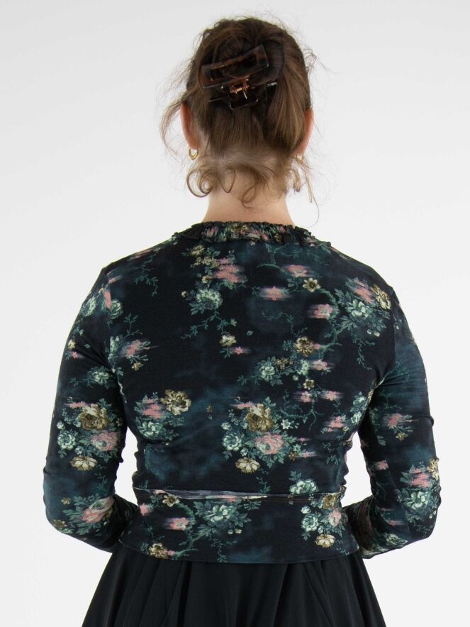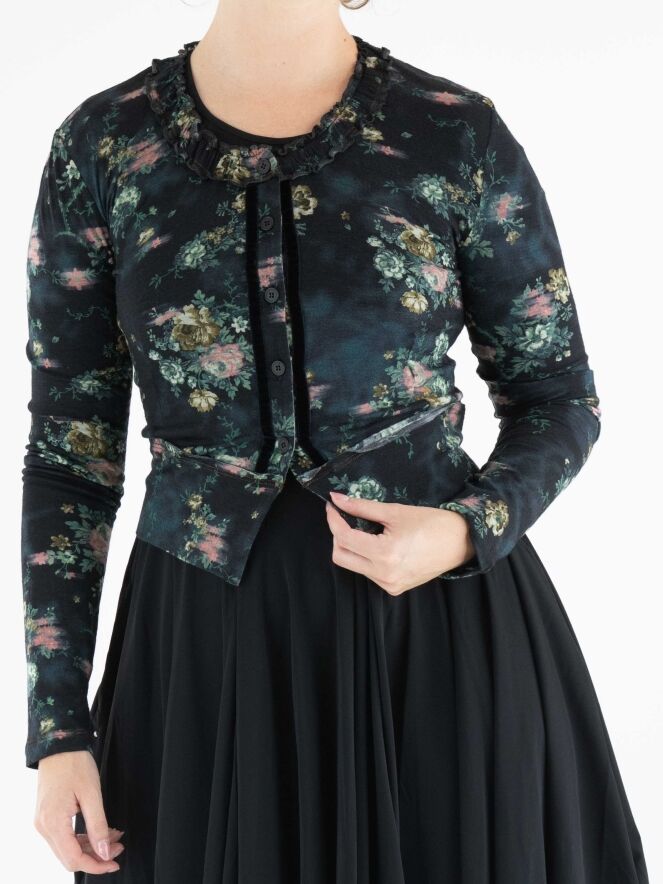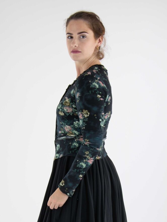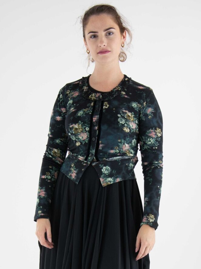 Un gilet court de High dans un imprimé floral avec plusieurs nuances de vert, taupe et rouge sur un fond bleu marine. Autour du col rond se trouve un passepoil où le tissu est finement plissé sur les deux bords. Le long de la fermeture boutonnée, il y a une bordure en velours des deux côtés. Ce gilet peut être lavé à la main.