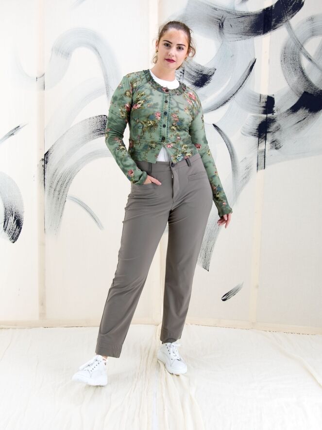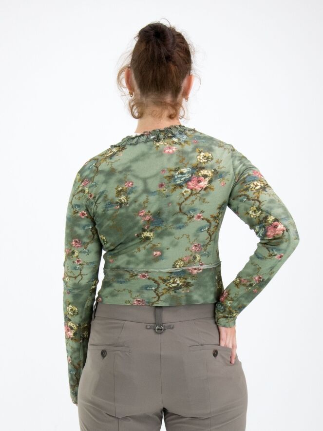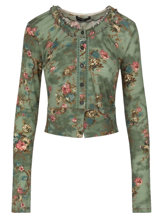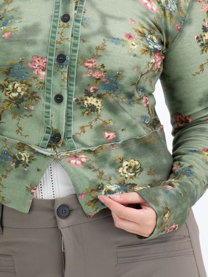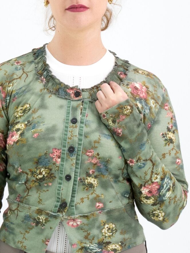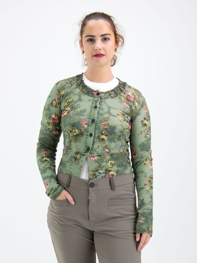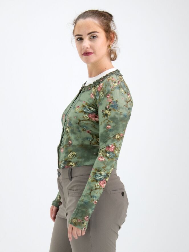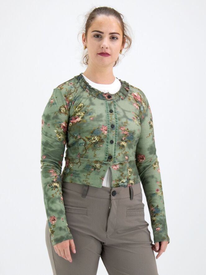 Un cardigan court de High dans un imprimé floral avec plusieurs nuances de bleu, taupe et rouge sur un fond vert olive. Le long du col rond, il y a une bordure où le tissu est finement plissé sur les deux bords. Le long de la fermeture à boutons, une bordure en velours est présente des deux côtés. Ce cardigan peut être lavé à la main.