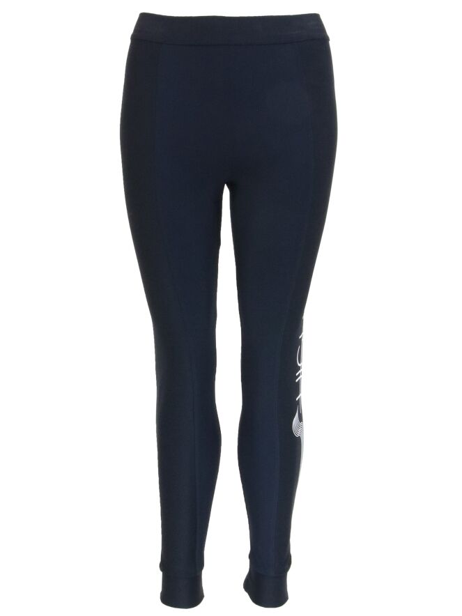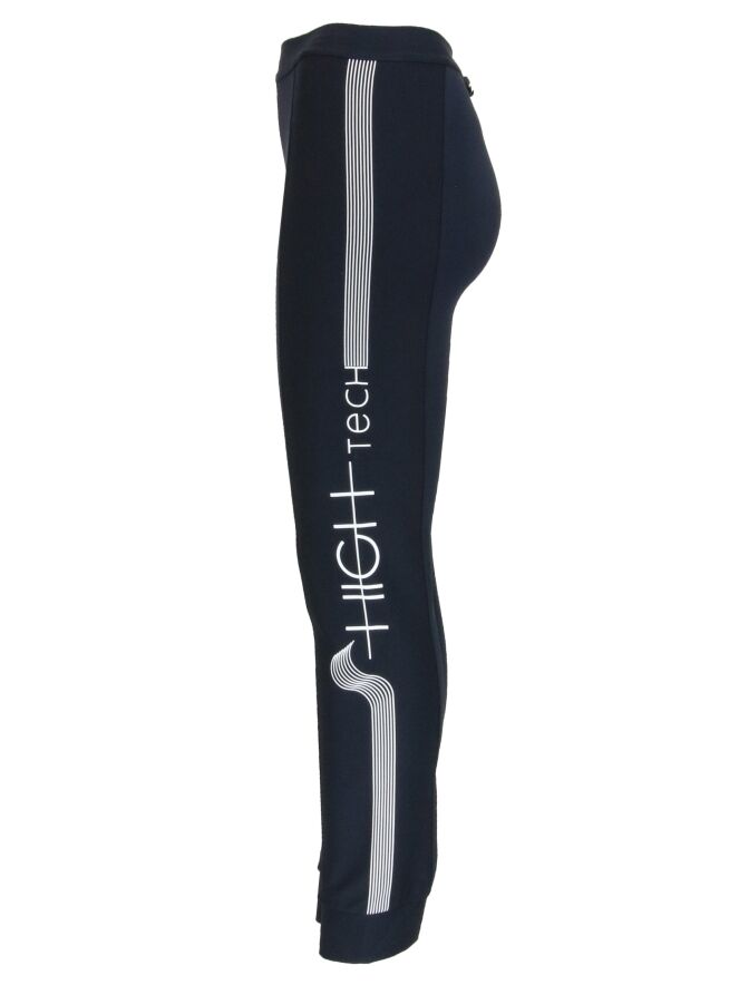 Legging de luxe de la marque High, de couleur noire. Il est équipé d'une bande élastique à la taille. Les côtés extérieurs sont composés d'un tissu élastique finement côtelé, dont celui de gauche orné d'un texte blanc traité de manière graphique. Lavage à la main.