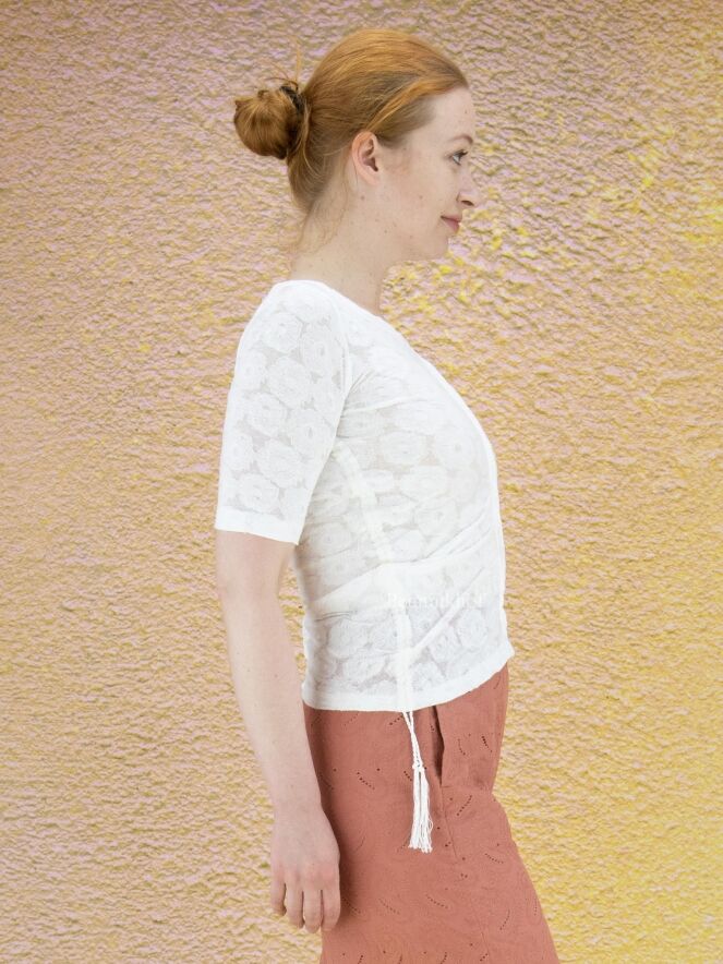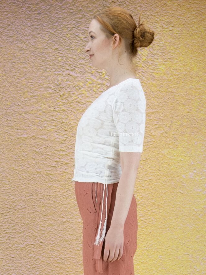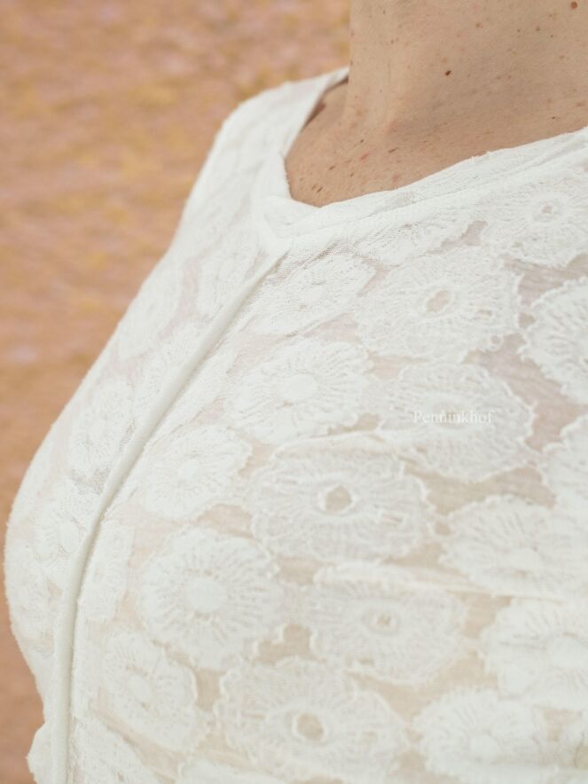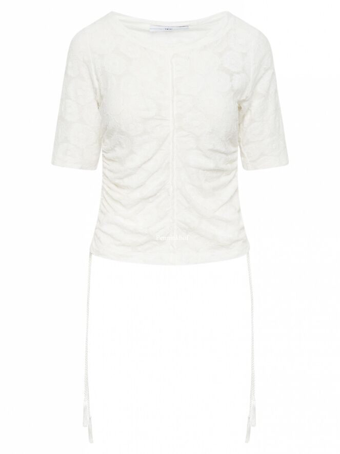 Chemise légèrement transparente de la marque High, à motif jacquard floral , de couleur blanc crème. Le large décolleté est bordé du même tissu. Le devant possède une couture renversée centrale. Sur les côtés, à partir de l'aisselle, un cordon peut être utilisé pour créer un effet plissé. Lavage à la main.