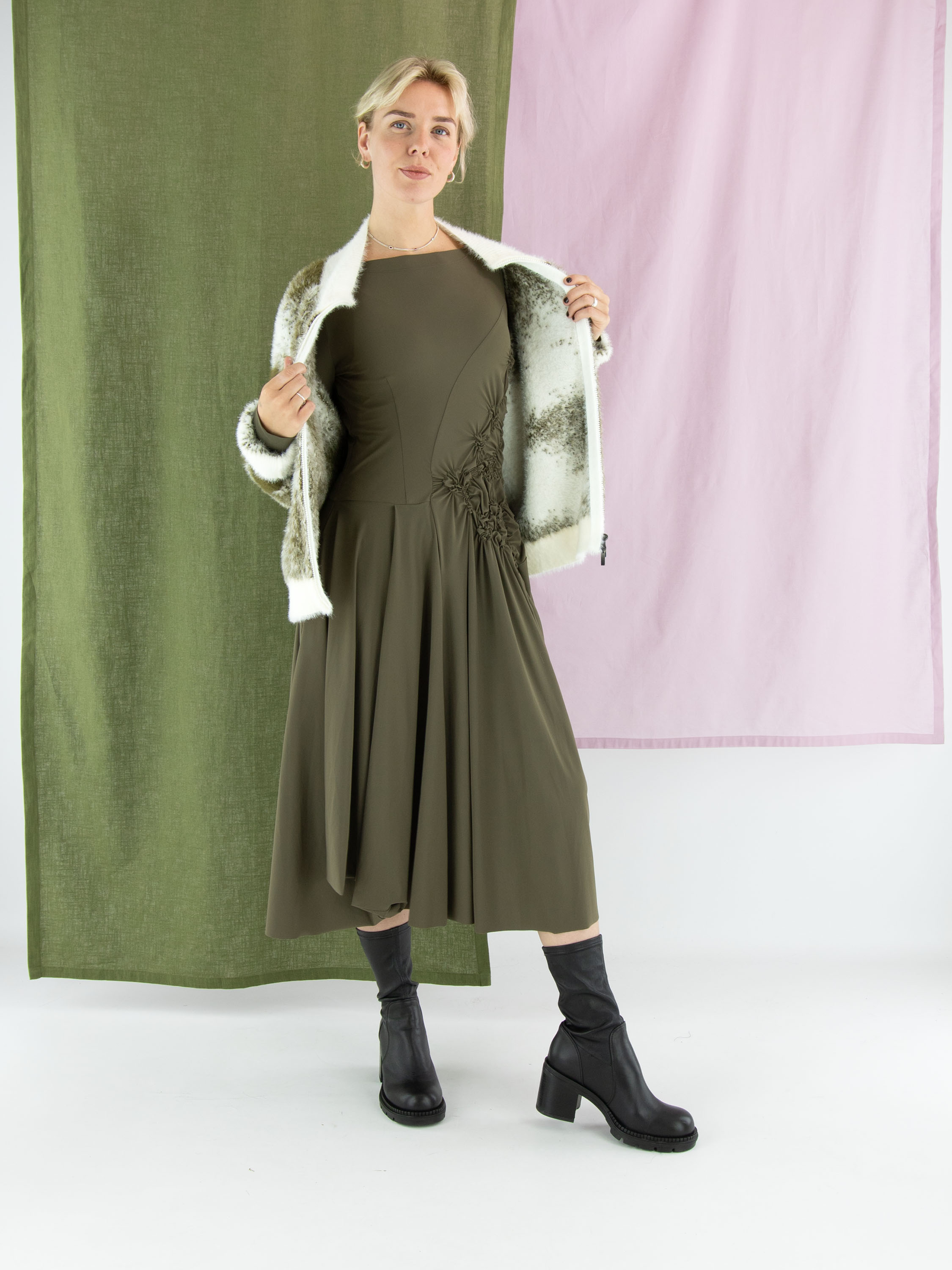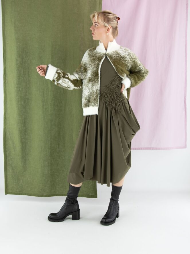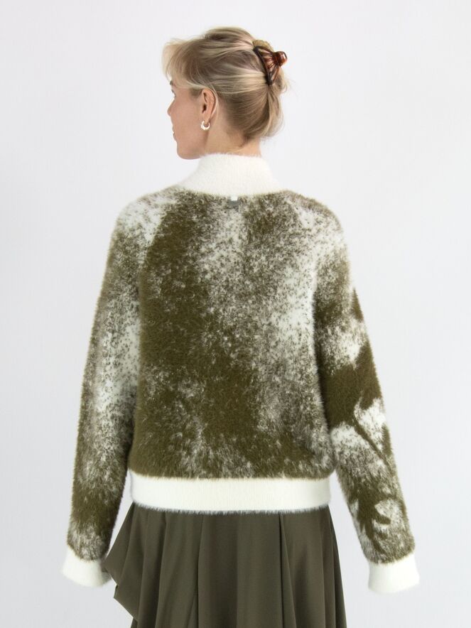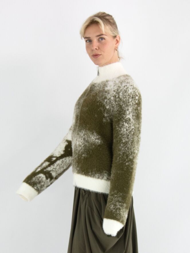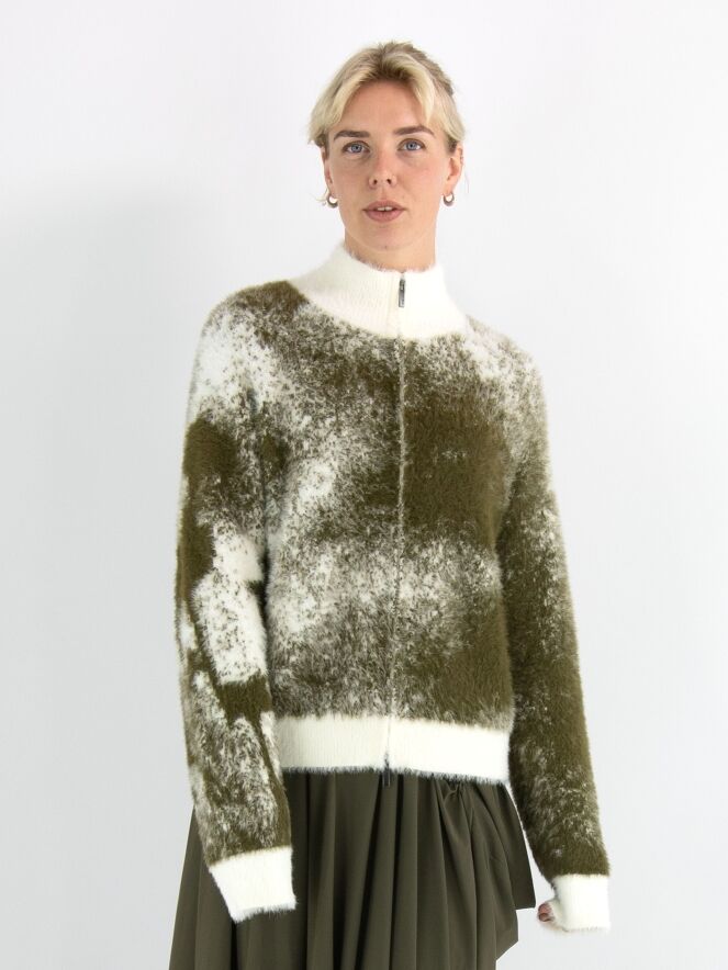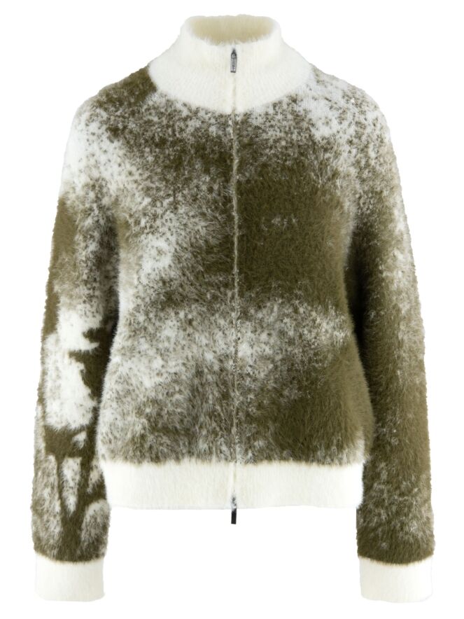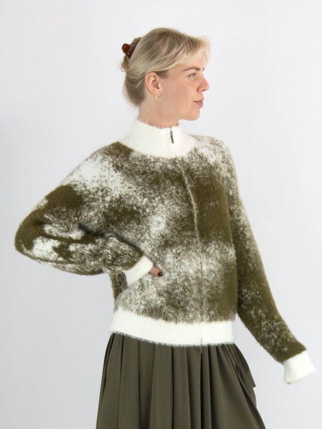 Veste de la marque High avec un imprimé graphique dans les tons vert olive et blanc cassé. Elle est dotée d’un col montant style "turtle neck" et d’une fermeture zippée. Le tissu est extensible et doit être lavé à la main.