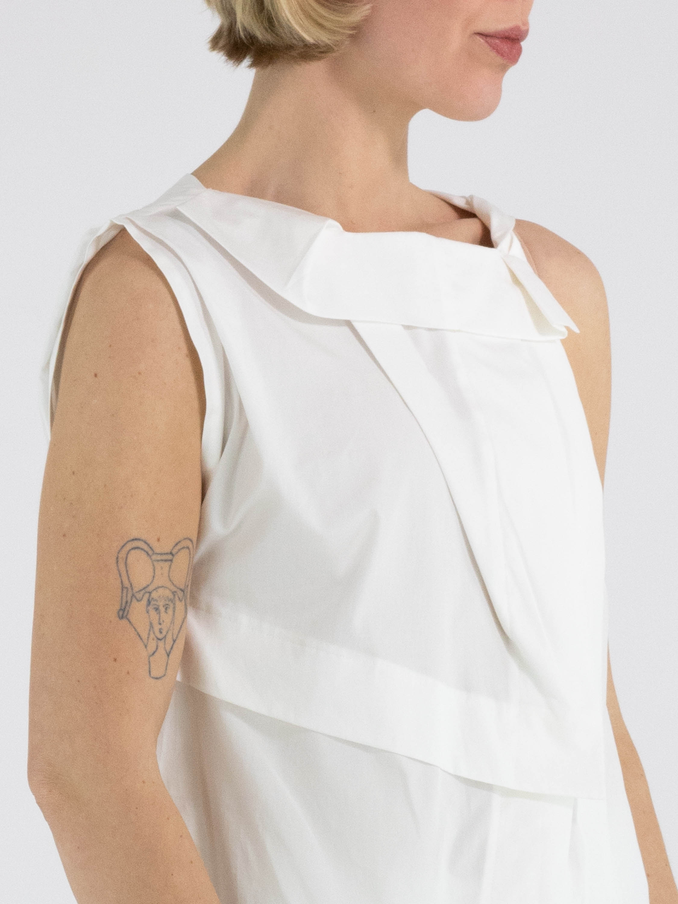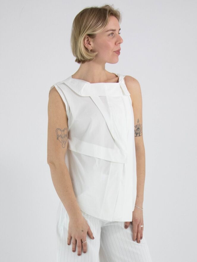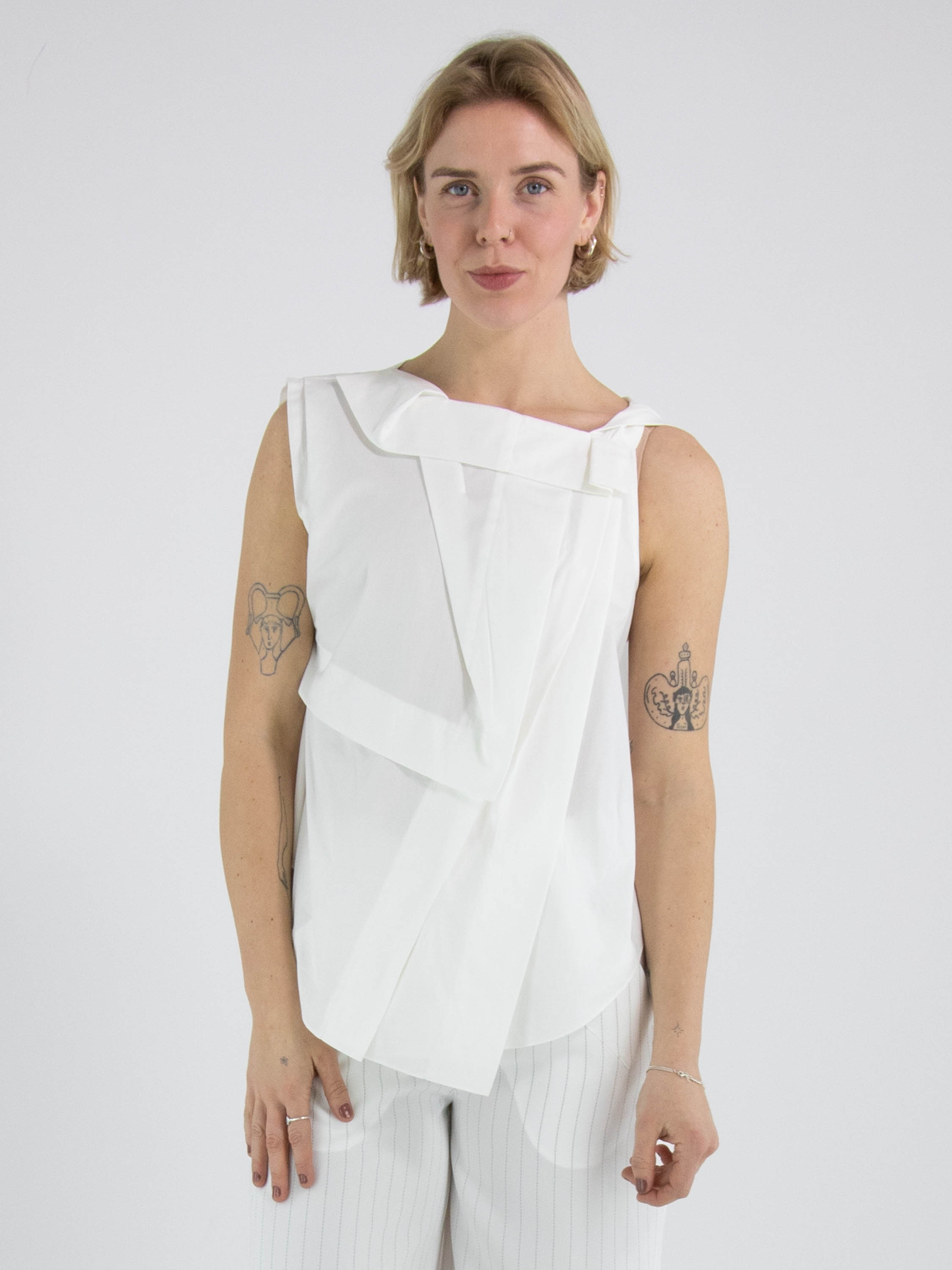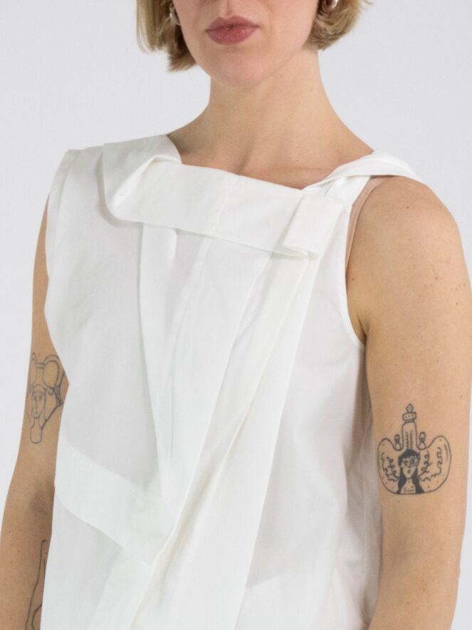 Un haut de High de couleur blanc cassé. Le haut présente plusieurs plis plissés, notamment au niveau de l’épaule et à l’avant de l’encolure. Depuis l’épaule gauche, certains plis descendent en diagonale vers le centre du bas. Le haut a une coupe en A et peut être lavé à la main.