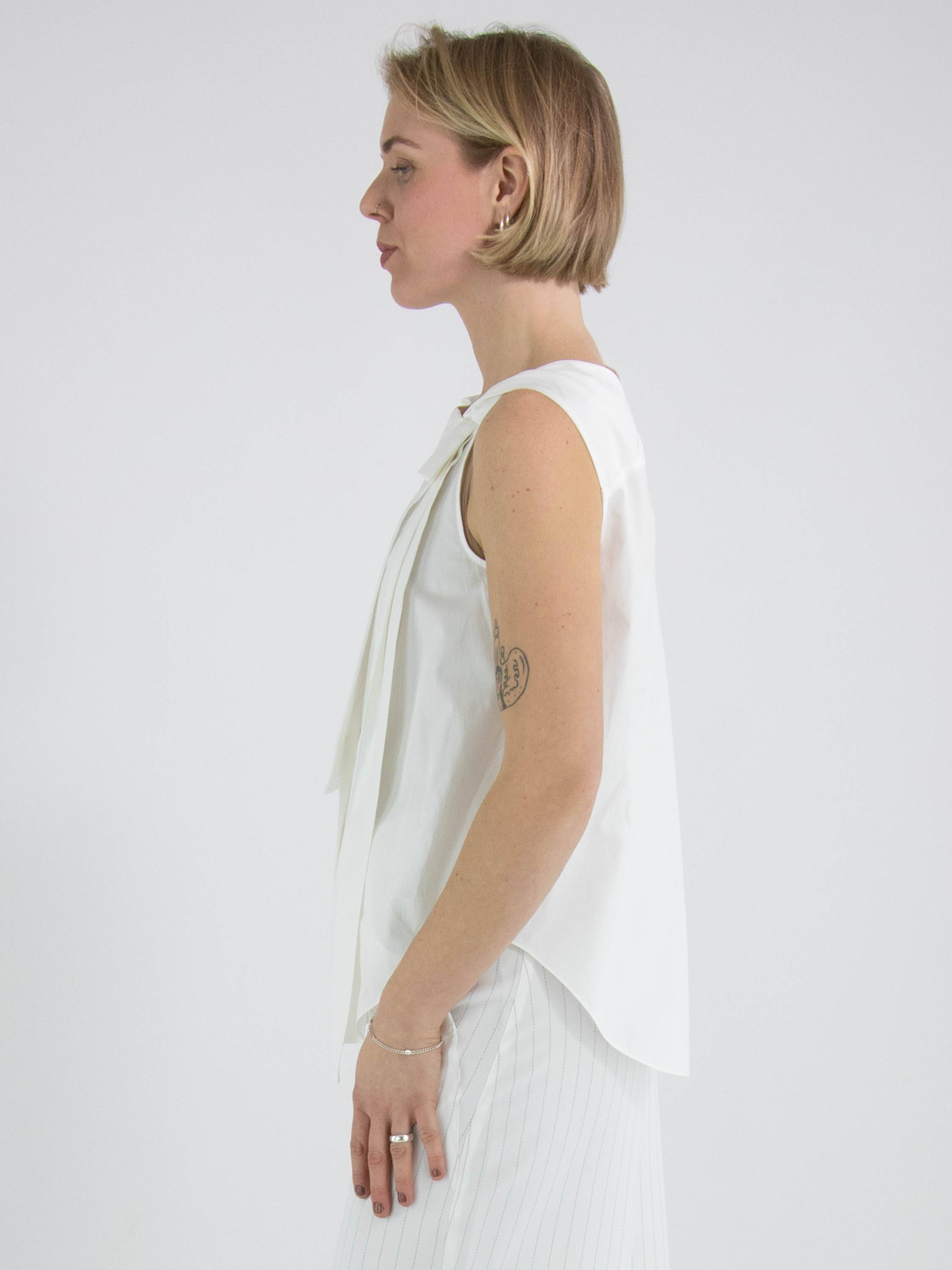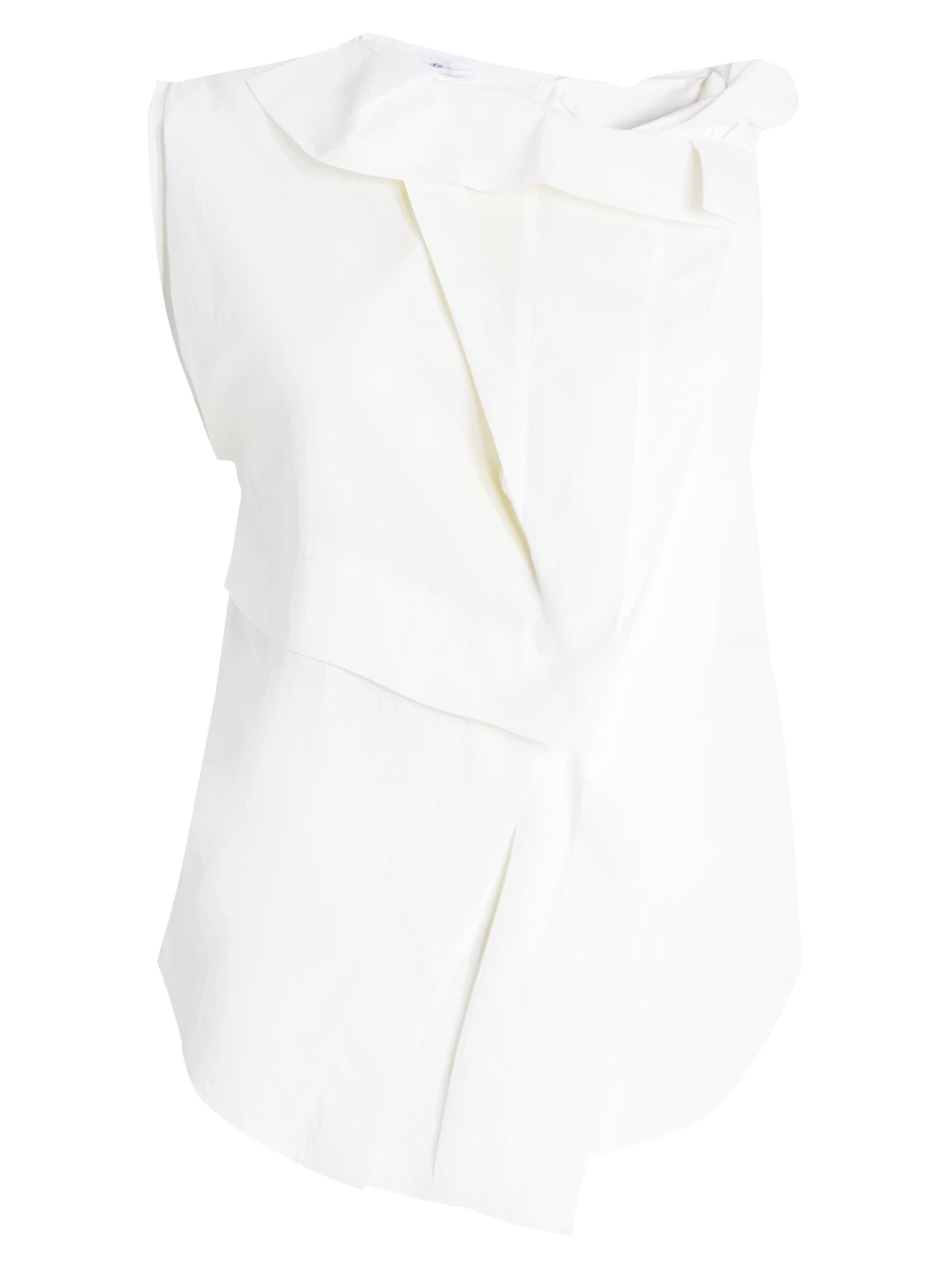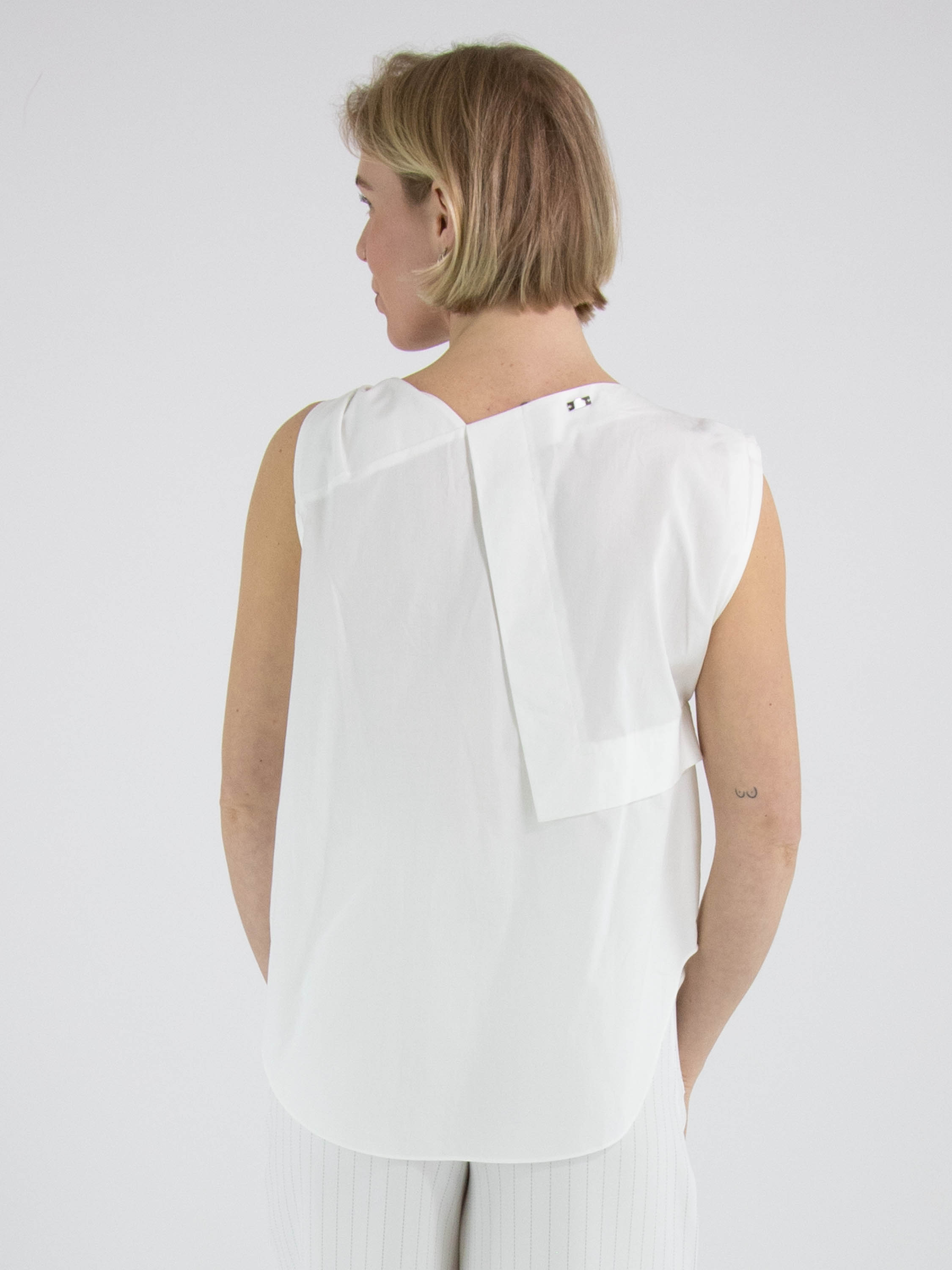 Un haut de High de couleur blanc cassé. Le haut présente plusieurs plis plissés, notamment au niveau de l’épaule et à l’avant de l’encolure. Depuis l’épaule gauche, certains plis descendent en diagonale vers le centre du bas. Le haut a une coupe en A et peut être lavé à la main.