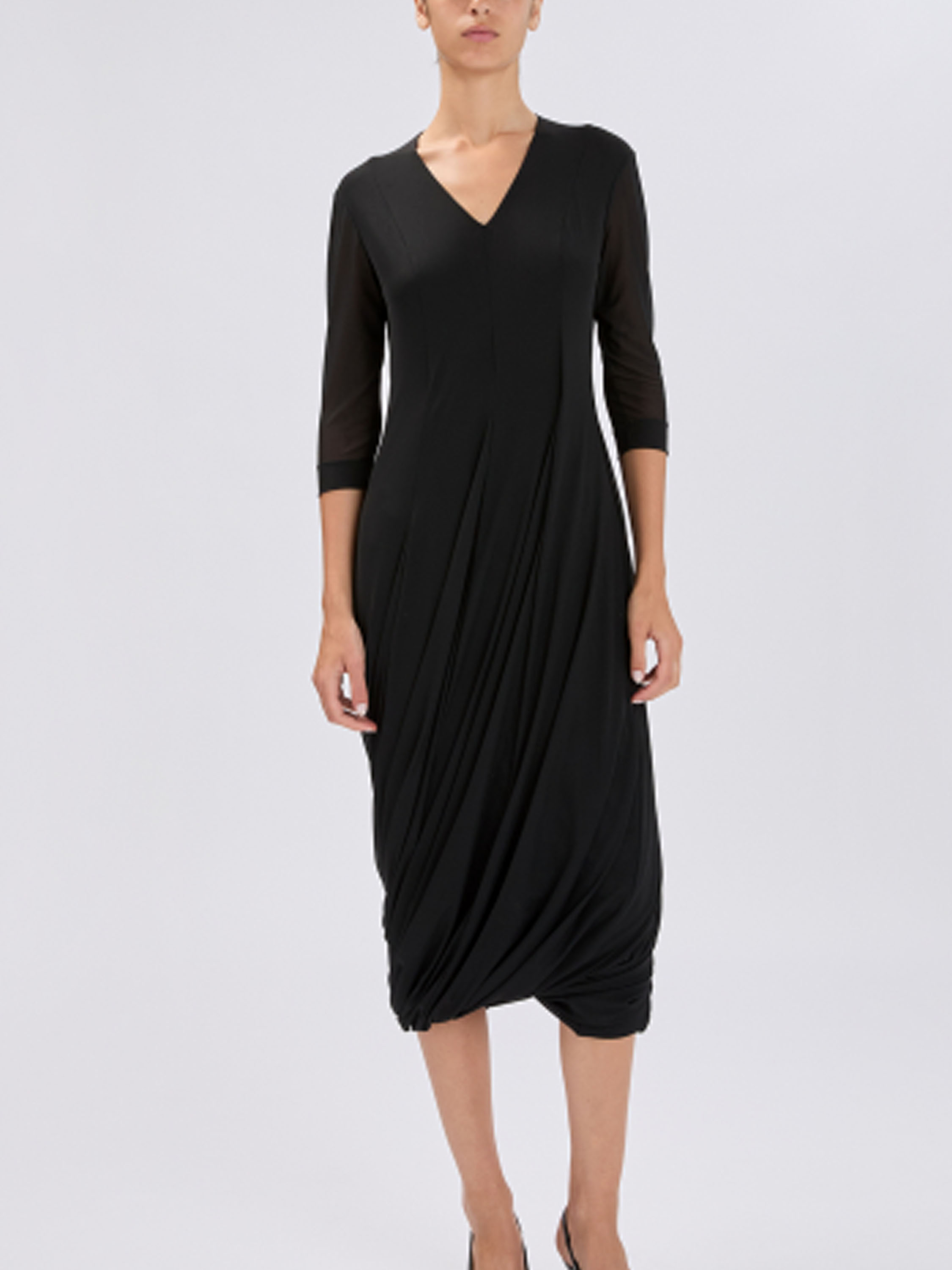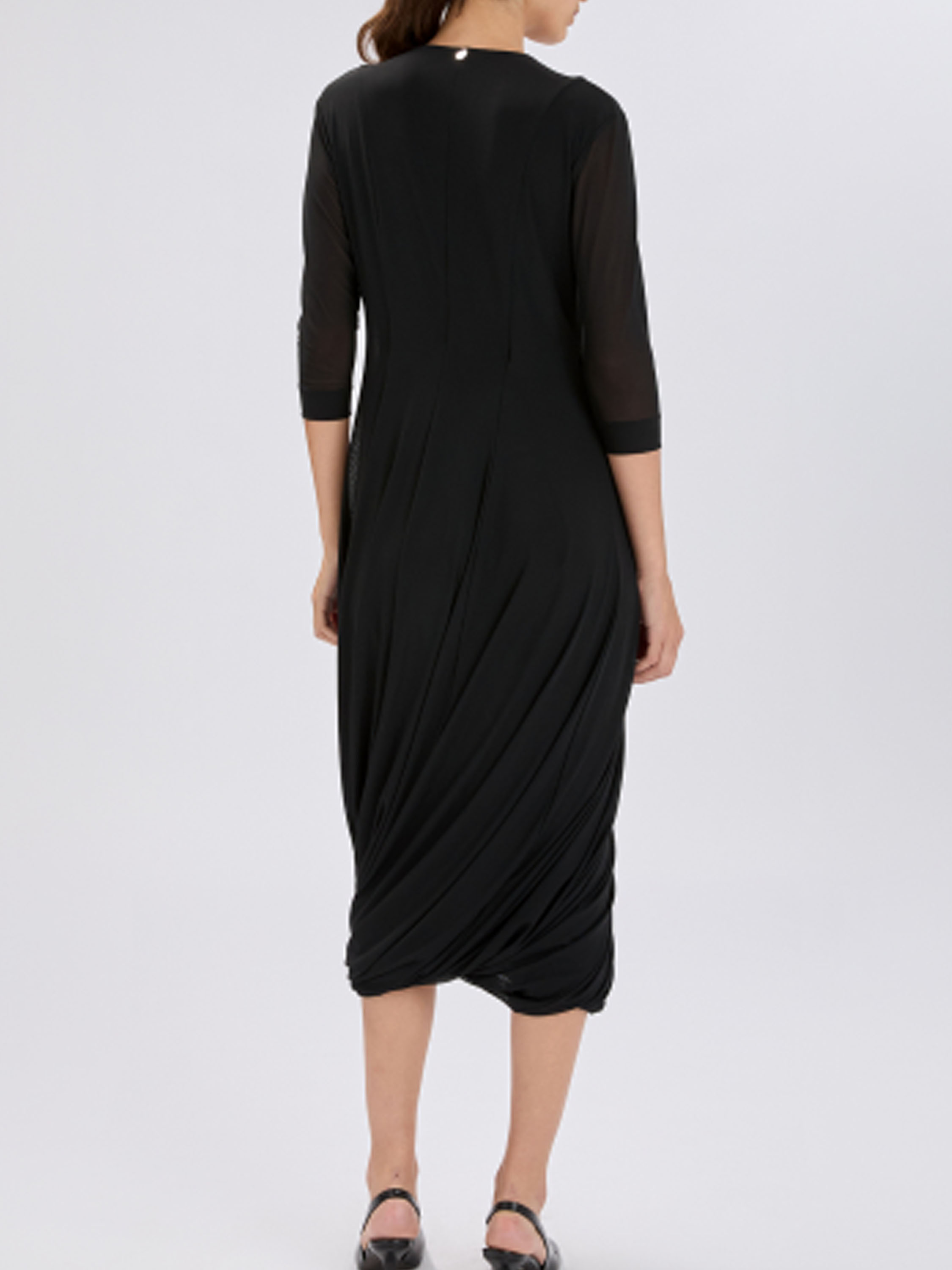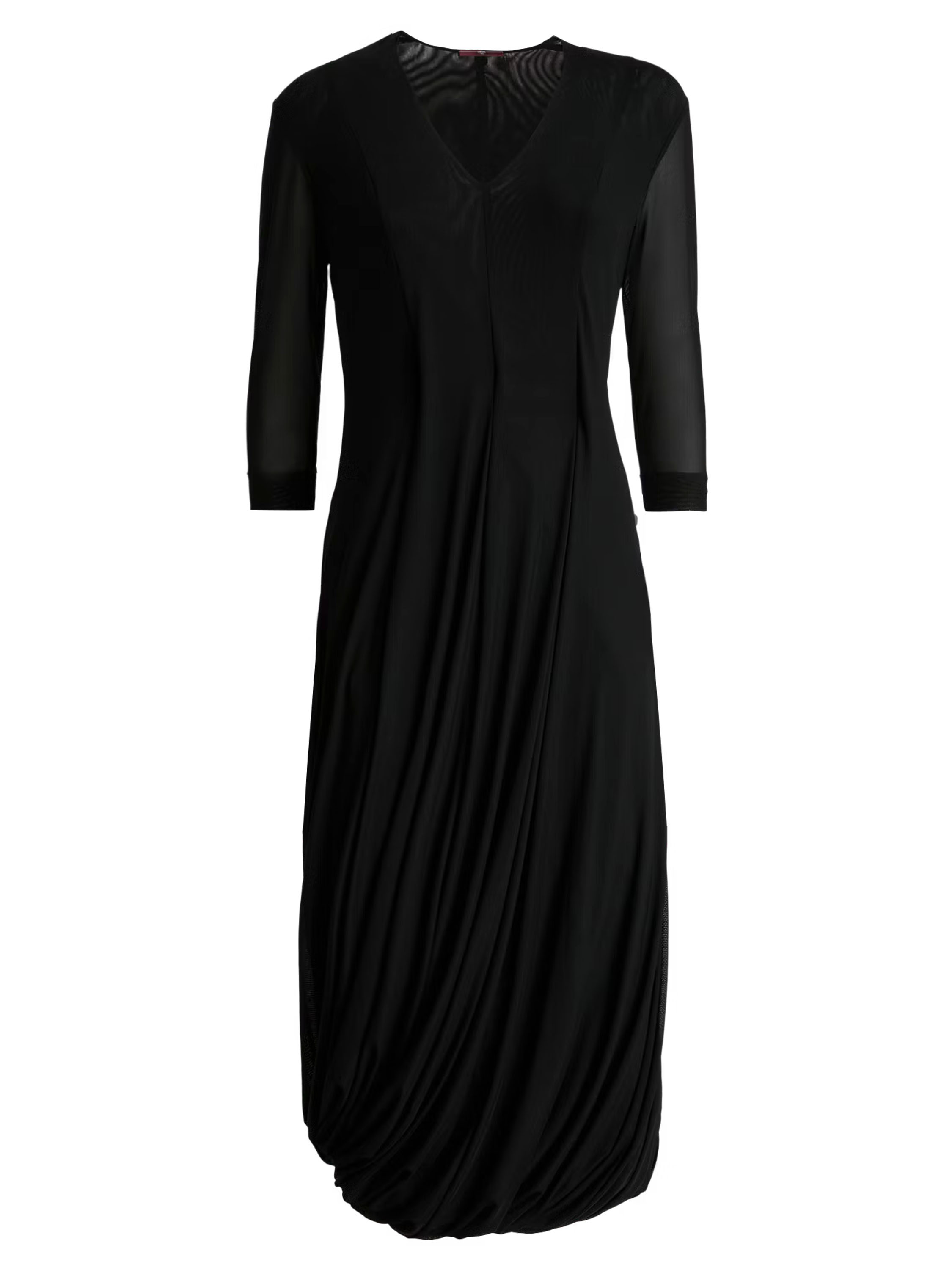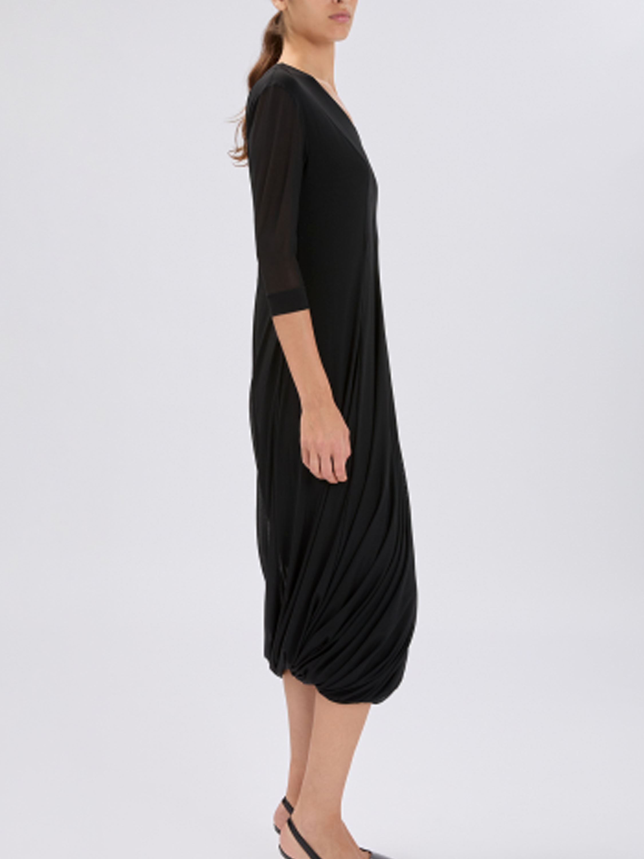 Une robe de High Tech de couleur noire. La robe est réalisée en double épaisseur de tissu légèrement transparent. Les manches courtes transparentes arrivent jusqu’au coude. À partir de la taille, la robe s’évase en une large ligne A. Elle possède un col en V et peut être lavée à la main.