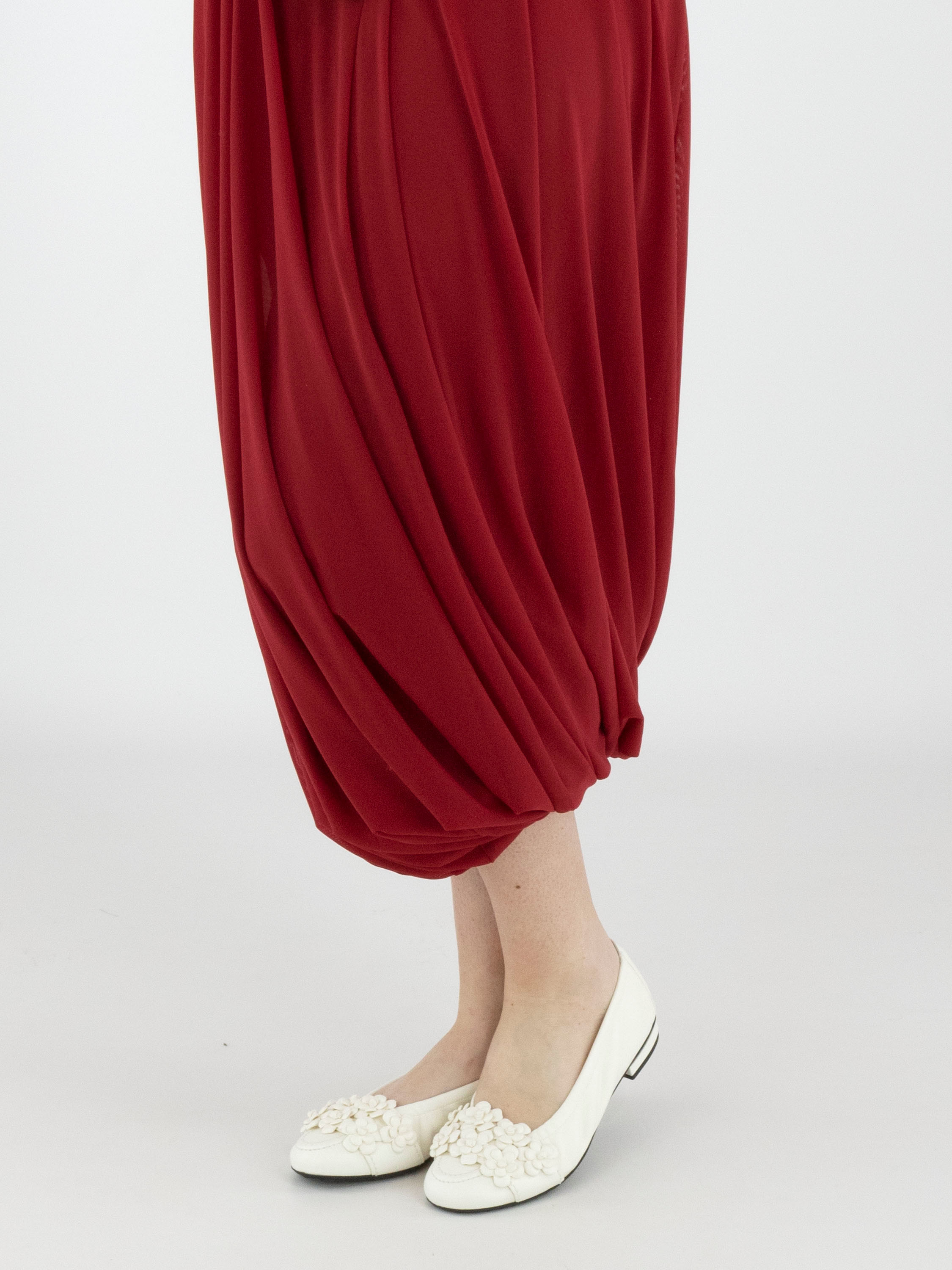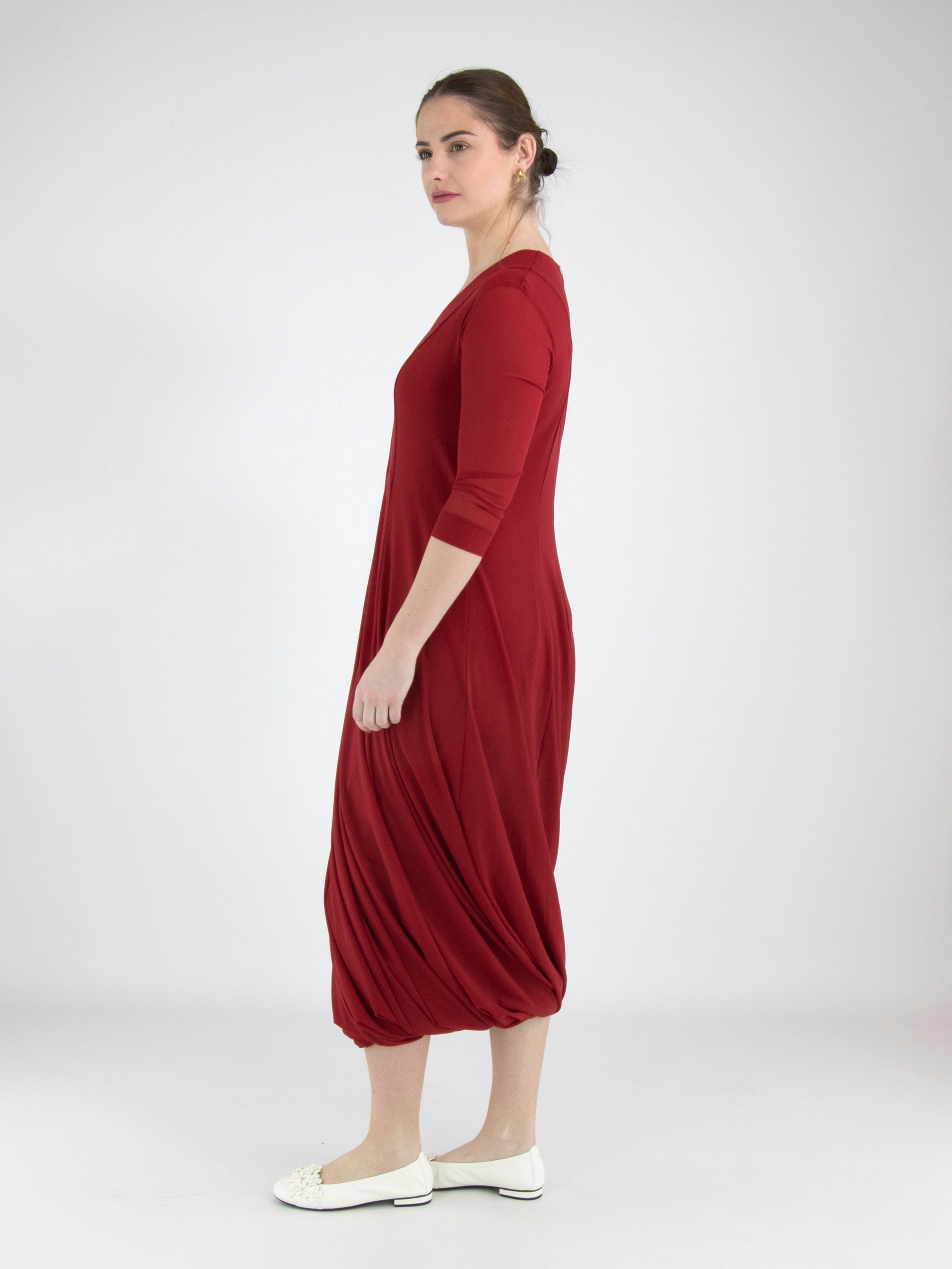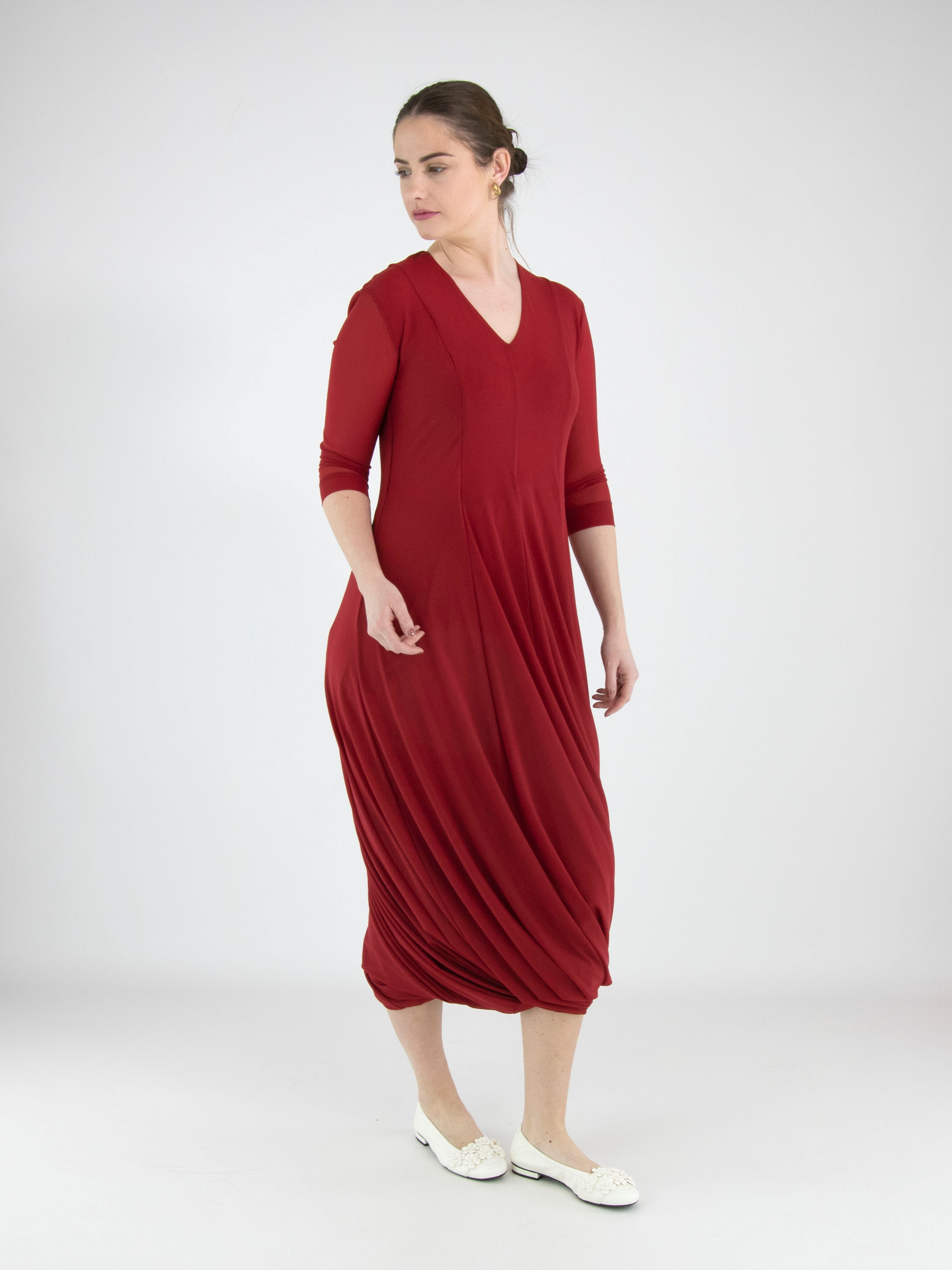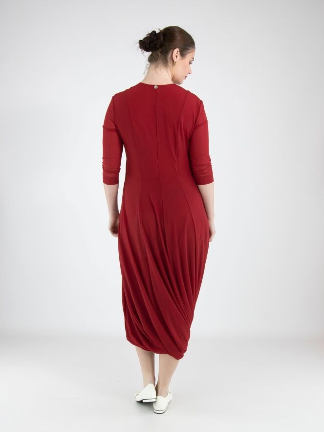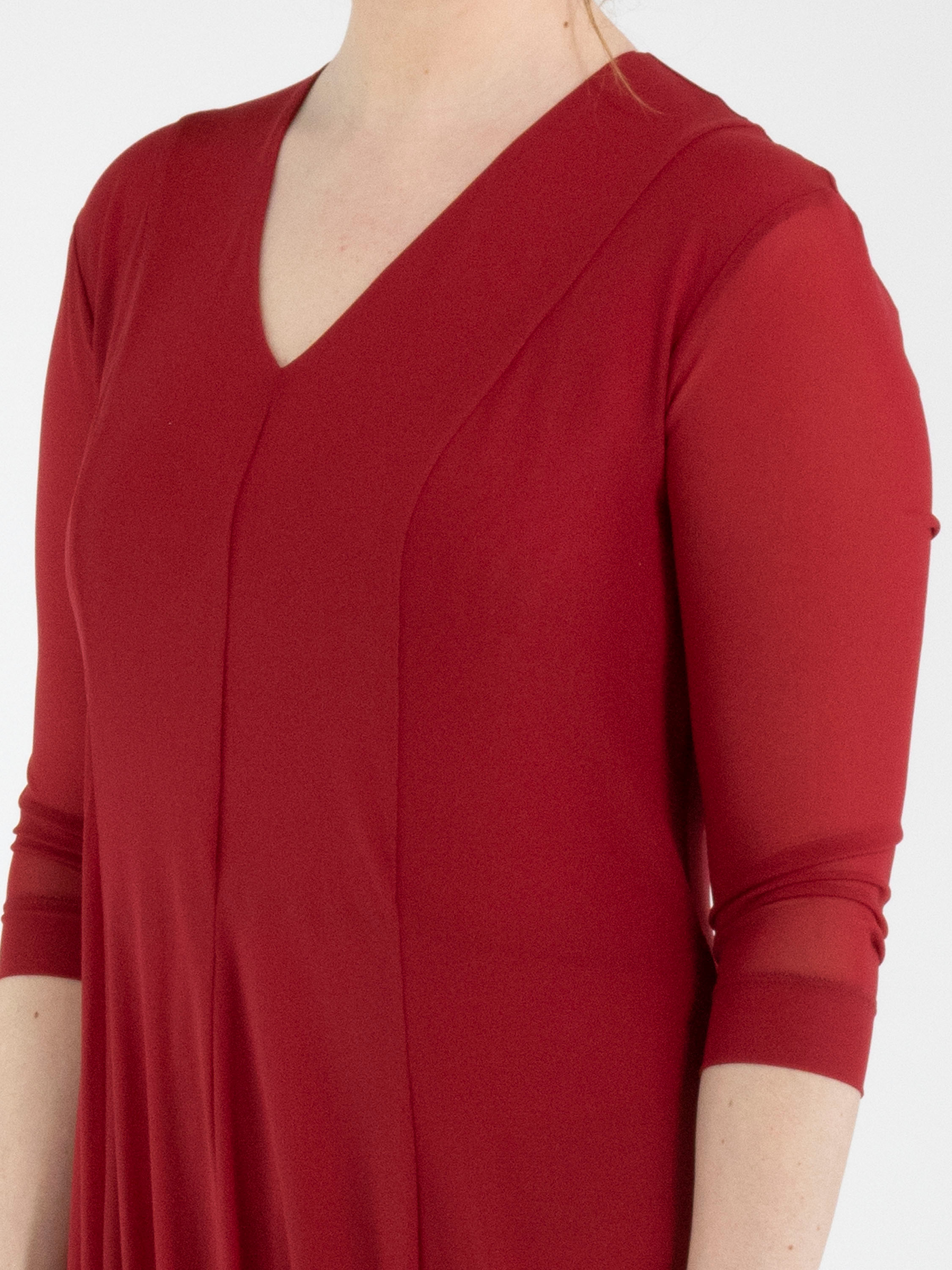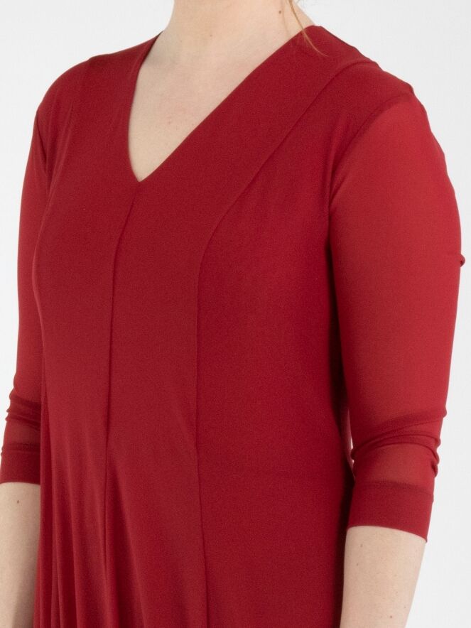 Une robe de High Tech de couleur framboise. La robe est réalisée en double épaisseur de tissu légèrement transparent. Les manches courtes transparentes arrivent jusqu’au coude. À partir de la taille, la robe s’évase largement en ligne A. La robe possède un col en V et peut être lavée à la main.