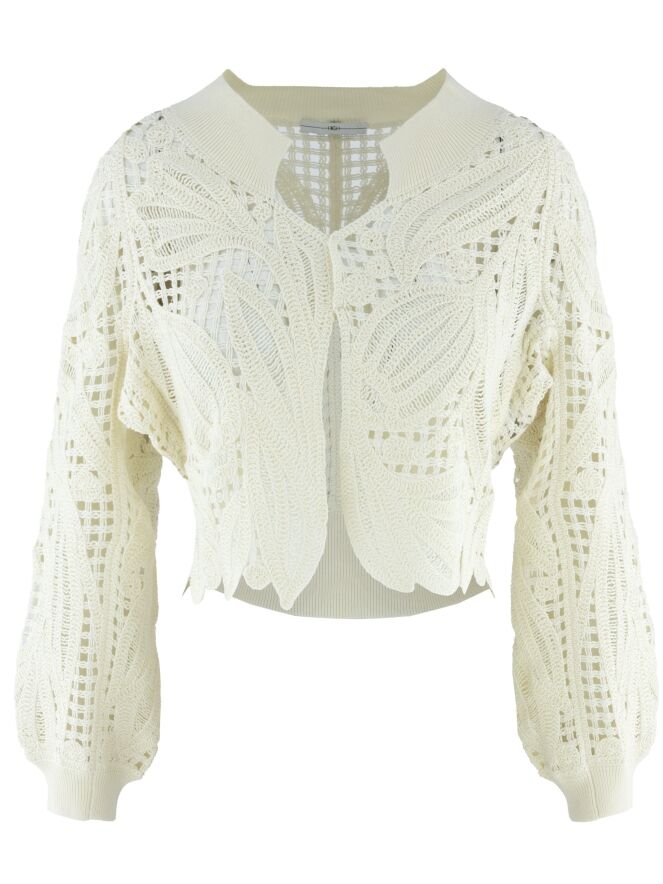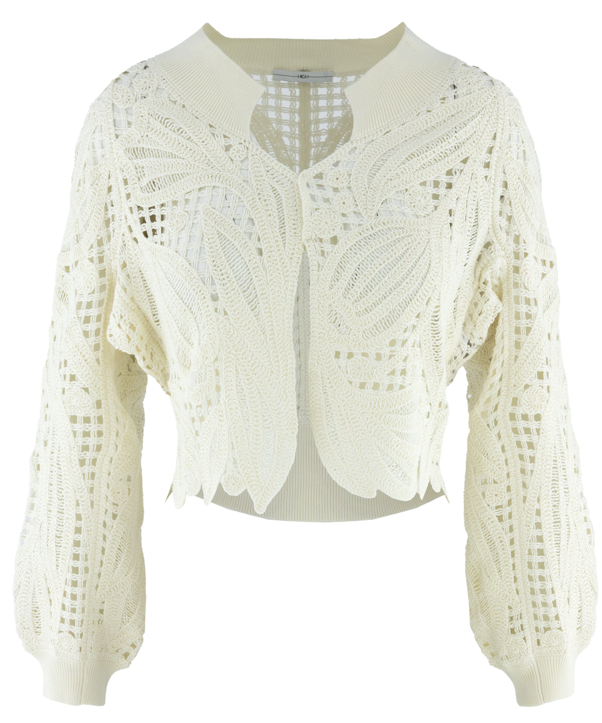 Un gilet court ajouré de High en blanc crème. Le gilet est doté d’une fermeture à deux petits boutons invisibles et de manches chauve-souris. Un large bord-côte finement nervuré souligne l’encolure et se retrouve également à l’arrière au bas du modèle ainsi qu’aux extrémités des manches longues. Ce gilet peut être lavé à la main.