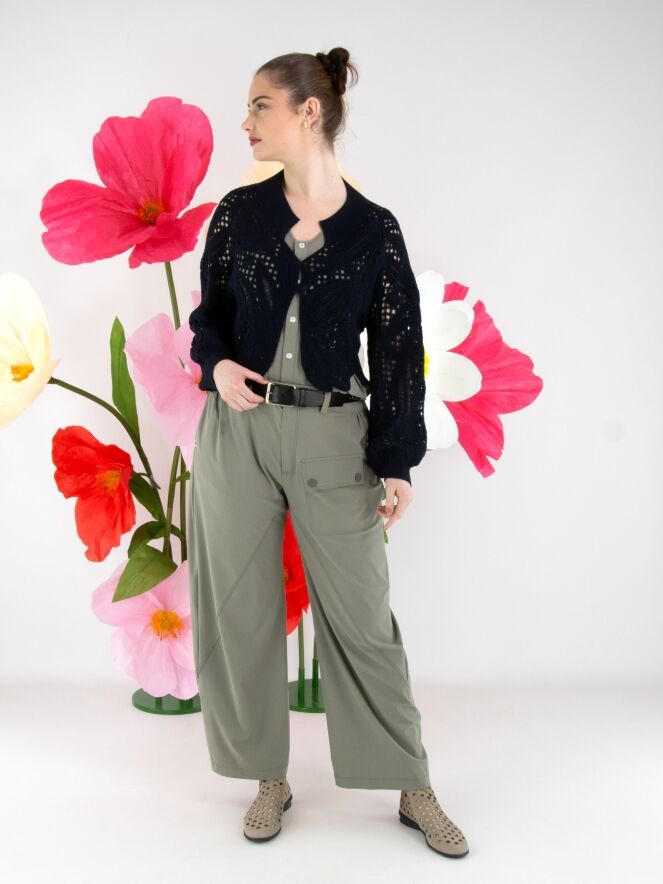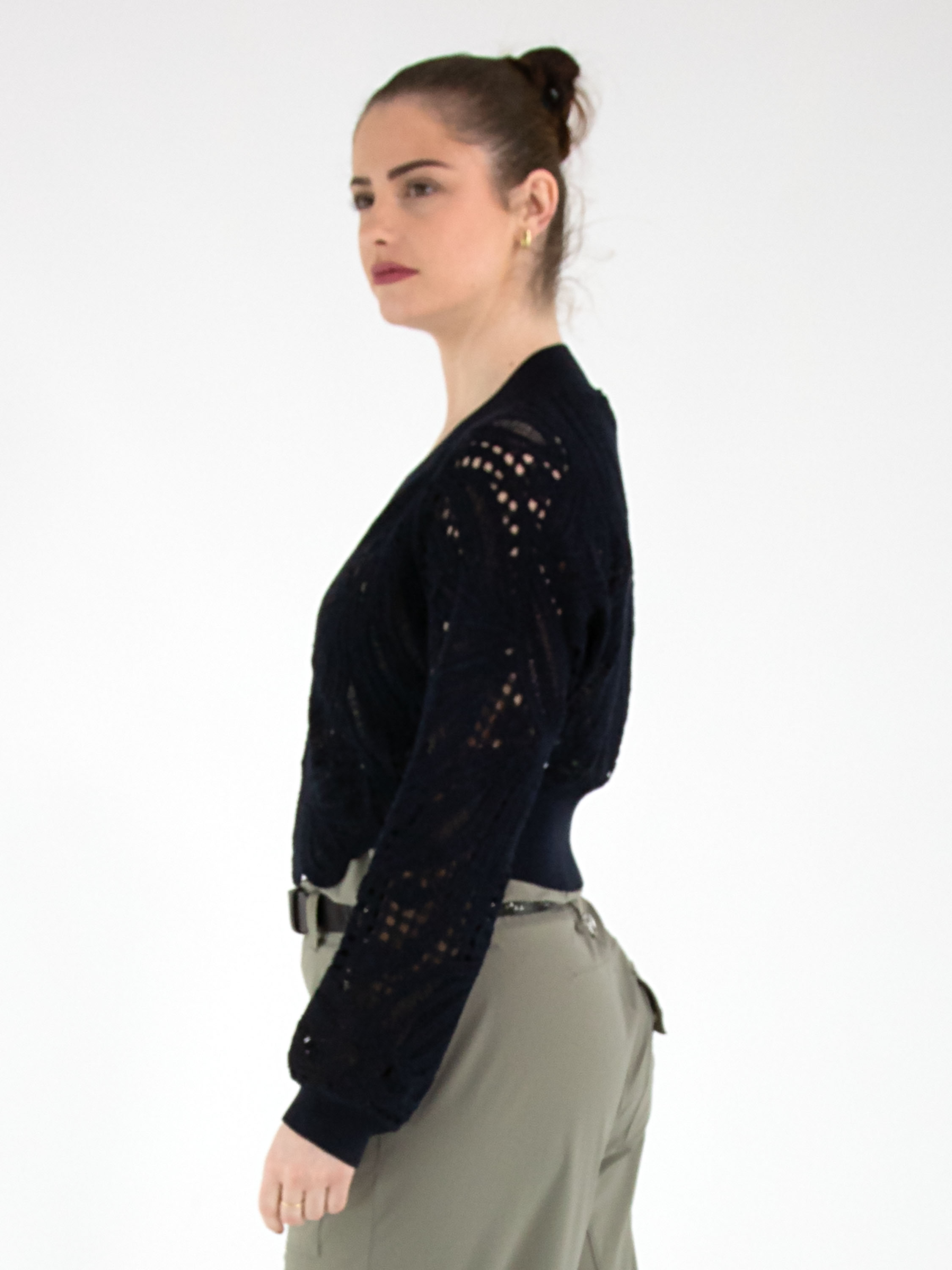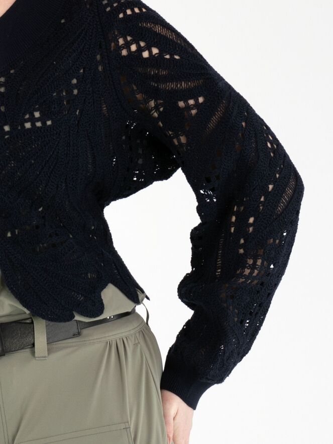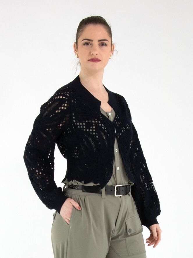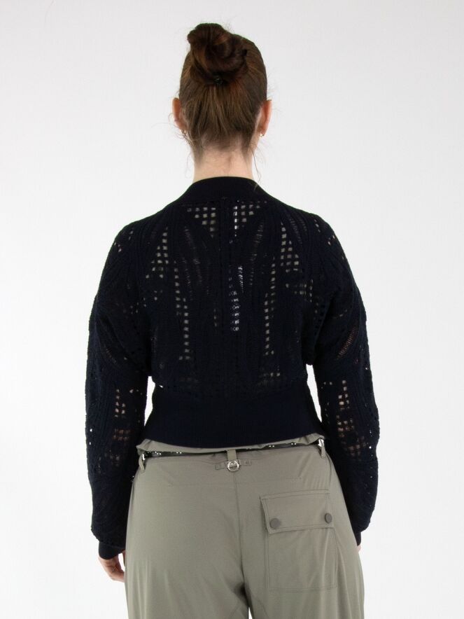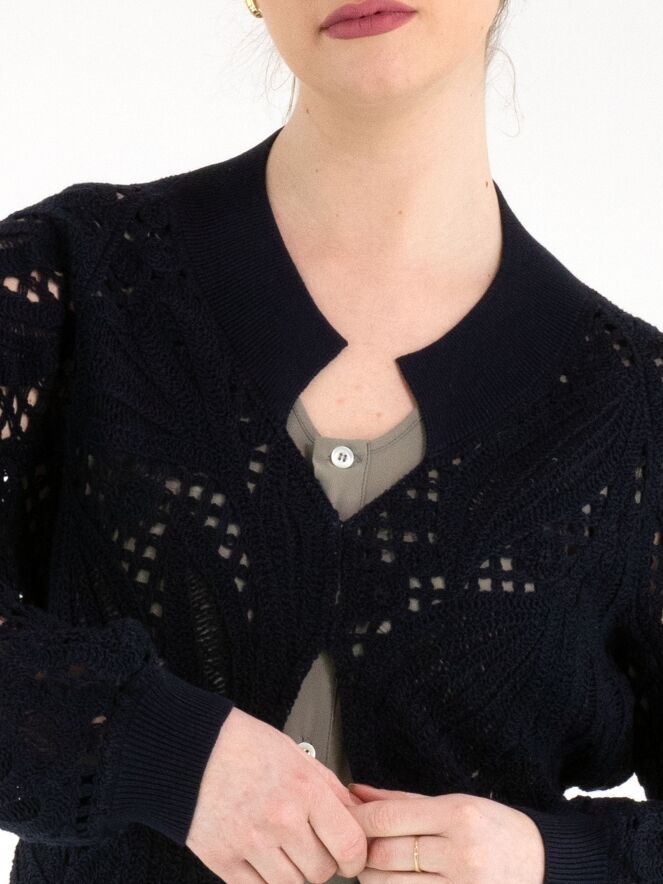 Un gilet court en maille ajourée de High en bleu marine. Le gilet est doté d’une fermeture à deux petits boutons dissimulés et de manches chauve-souris. Le long de l’encolure se trouve un large bord-côte finement côtelé. Ce bord est également présent au bas du dos et aux extrémités des manches longues. Ce gilet peut être lavé à la main.