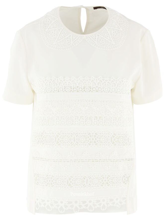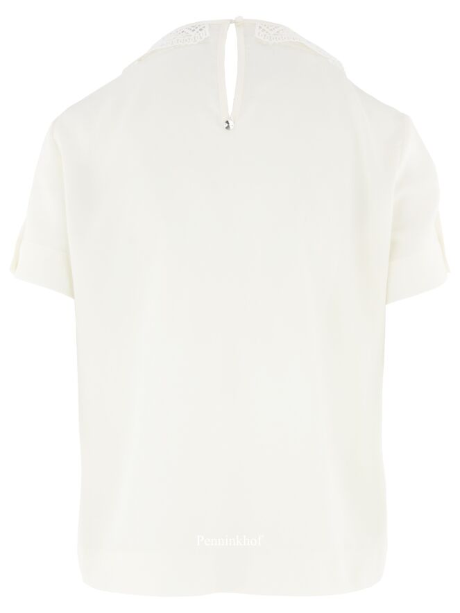 Top à manches courtes boutonnées de la marque High, de couleur blanc crème. Le devant est partiellement transparent orné de motifs en dentelle ajourée en alternance avec un tissu satiné mat. La chemise présente un col Claudine en dentelle crocheté agrémenté d'un bouton décoratif. Lavage à la main.