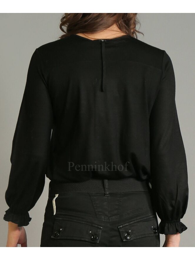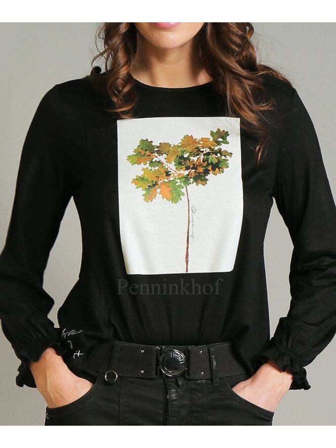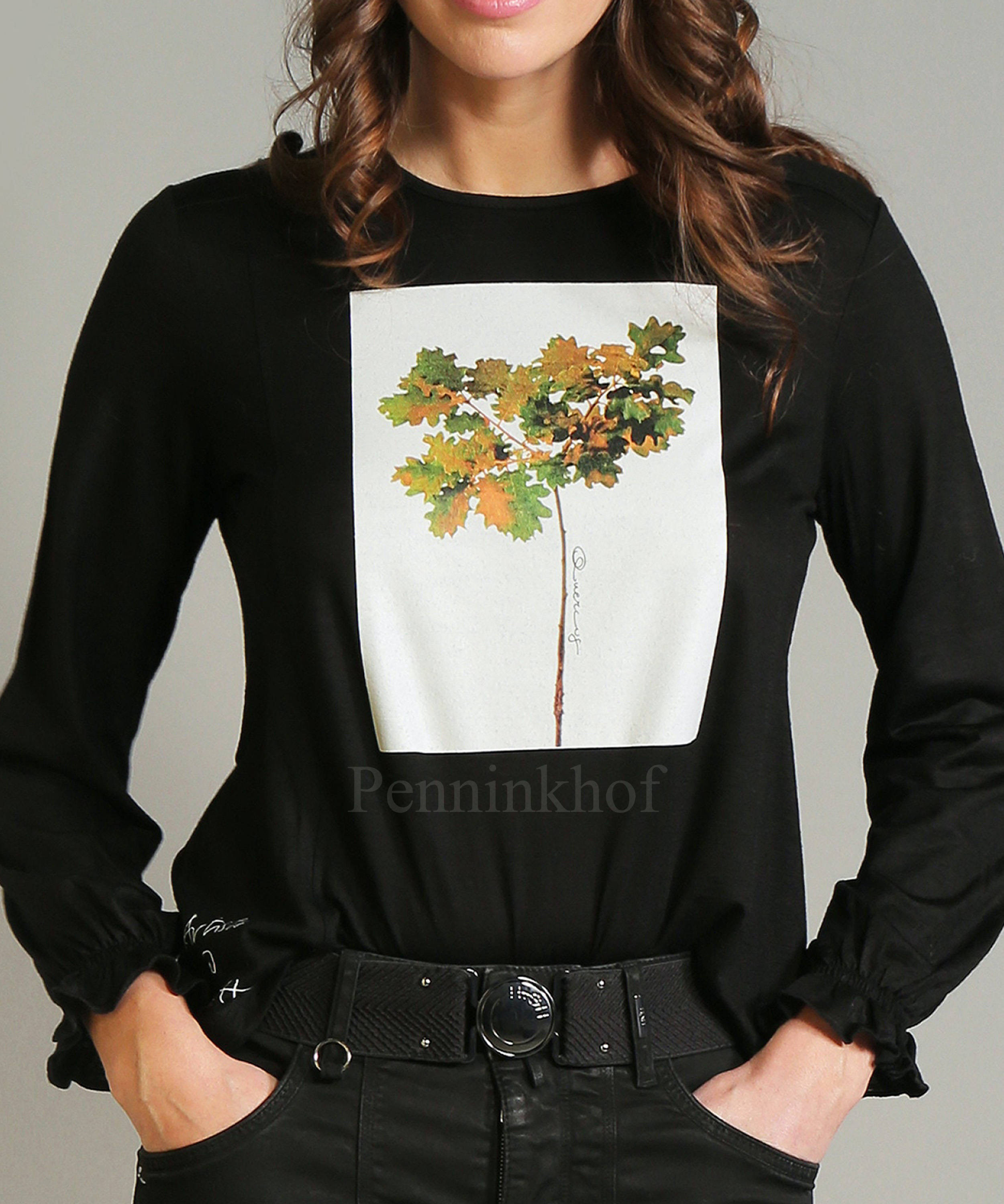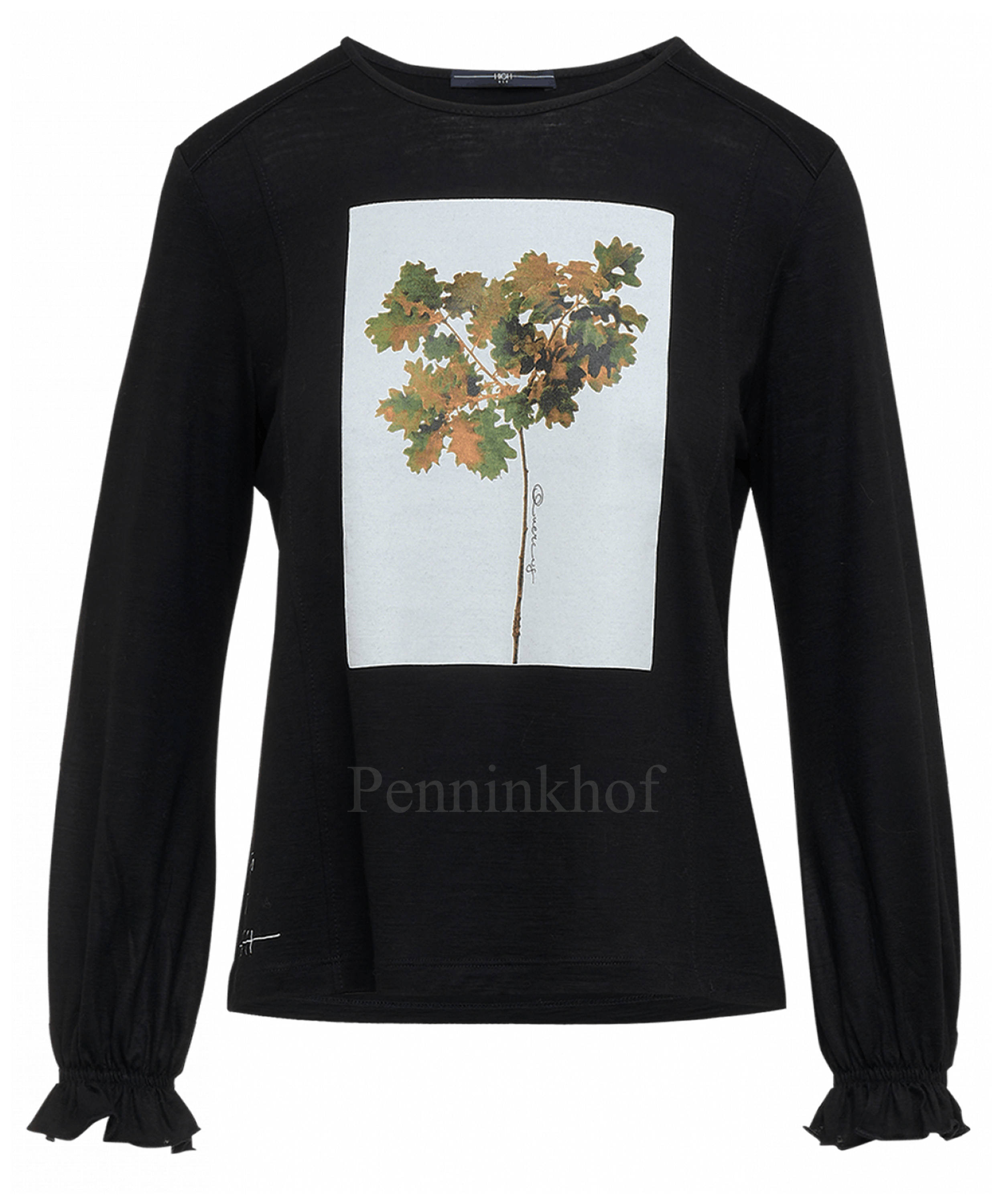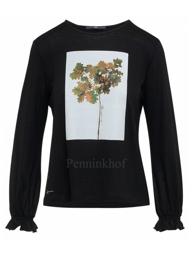 Pullover de la marque High, de couleur bleu marine. Une photo d'Enrico de Luigi représentant une branche de chêne orne l'avant. Une fine bande élastique au bas des manches crée un volant. Lavage à la main.