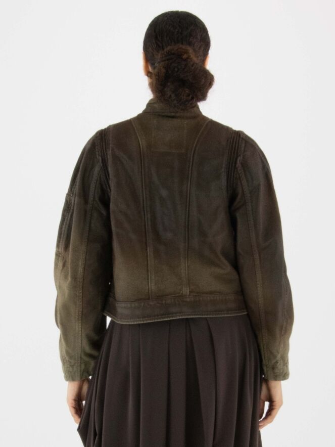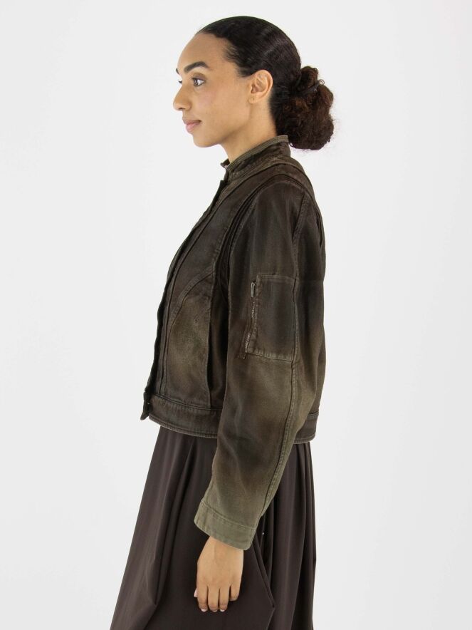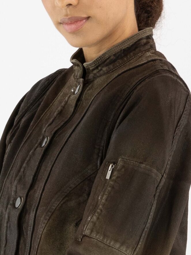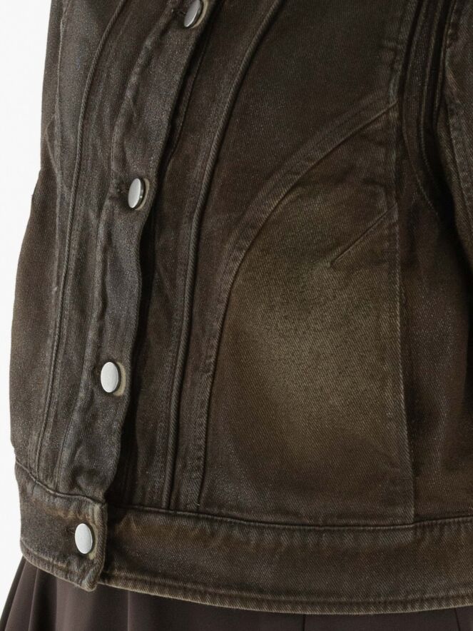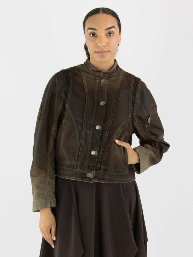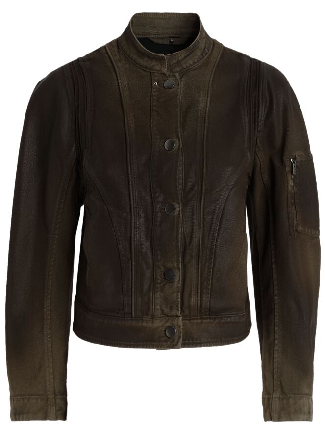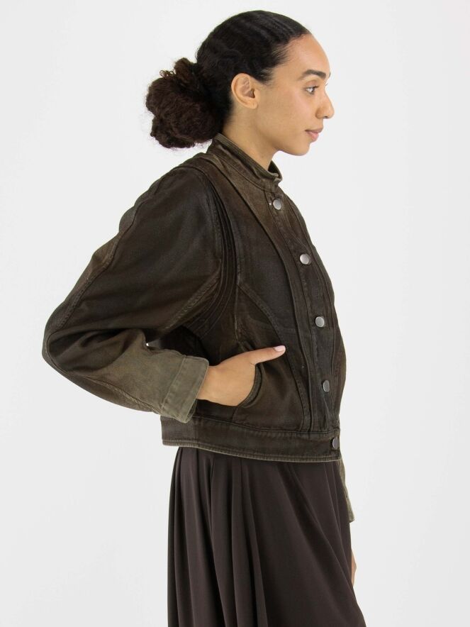 Un blazer en jean ciré effet usé, dans une teinte marron moka. Le blazer présente des poches à hauteur de taille et une fermeture à cinq boutons. Ce blazer doit être lavé à la main.