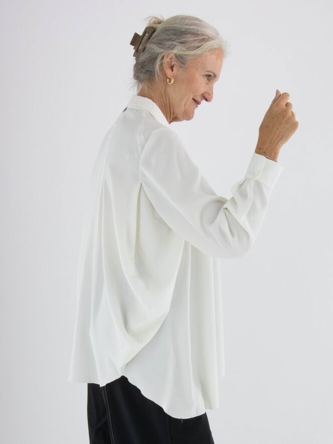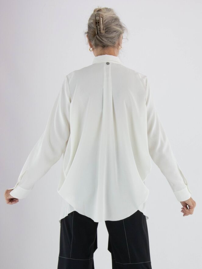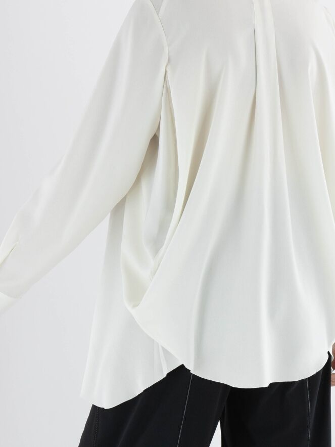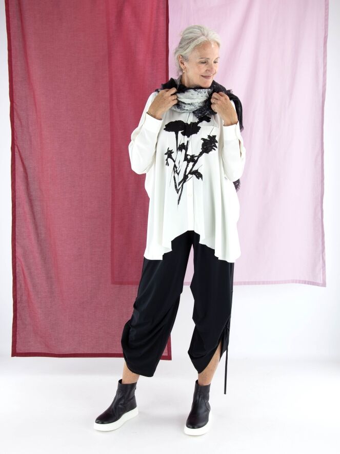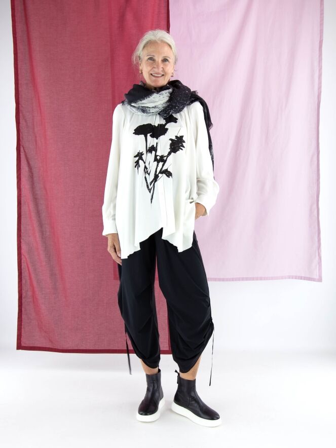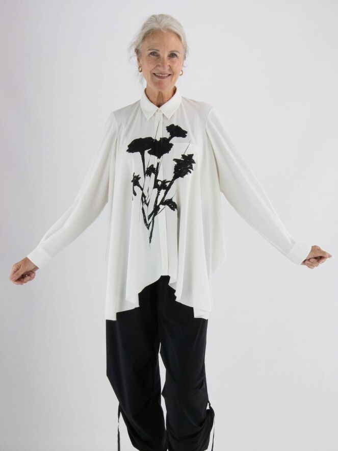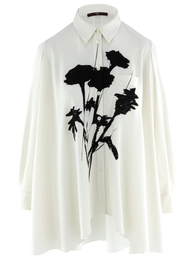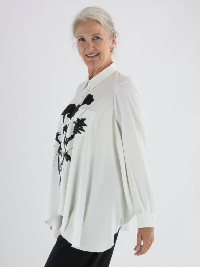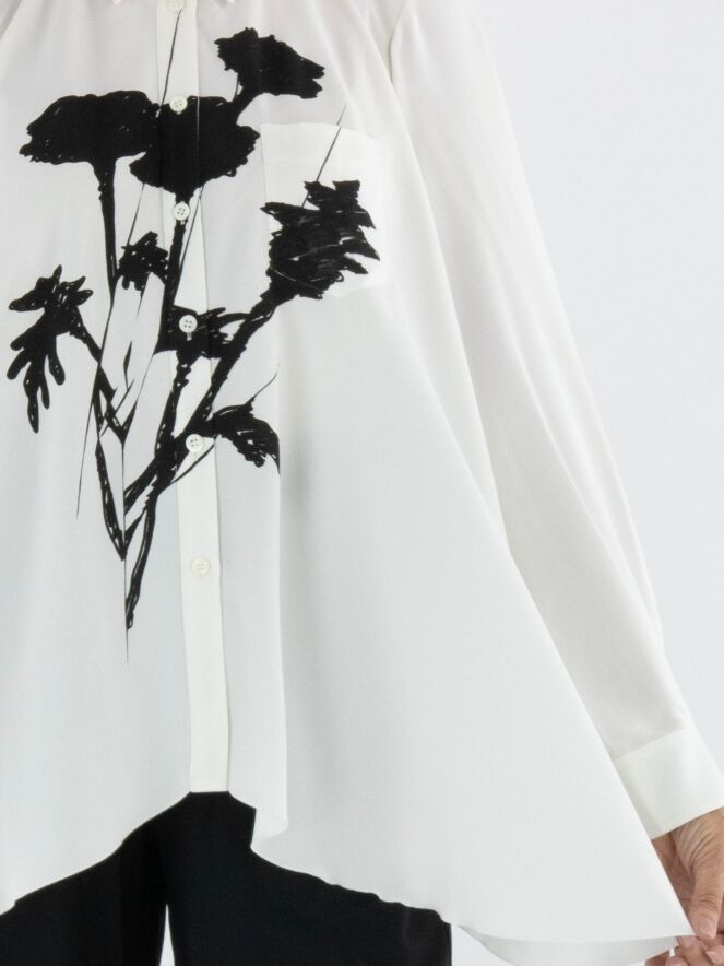 Une blouse longue de High en blanc crème avec un motif graphique de fleurs sur tiges en noir. À la base, des fronces sur les côtés créent un effet blousant. L’ourlet est arrondi avec une longueur accentuée sur les côtés. Cette blouse doit être lavée à la main.