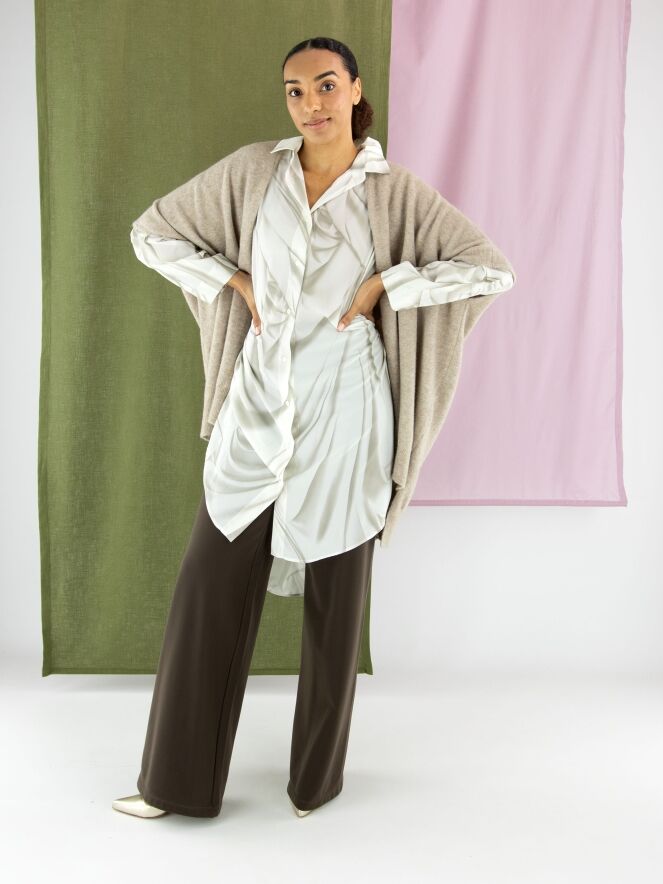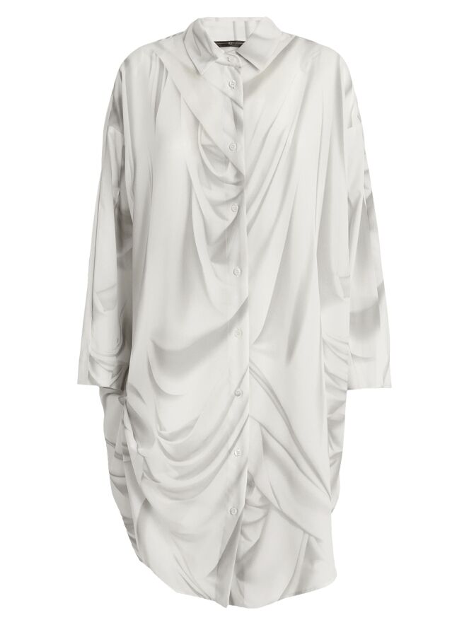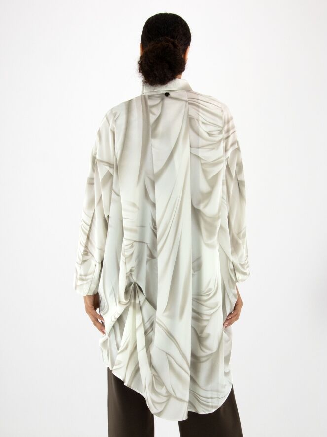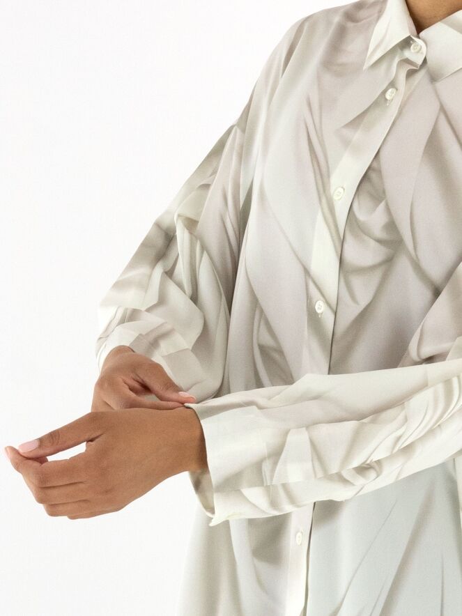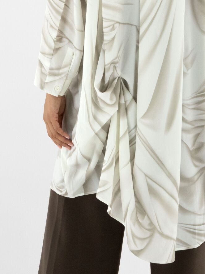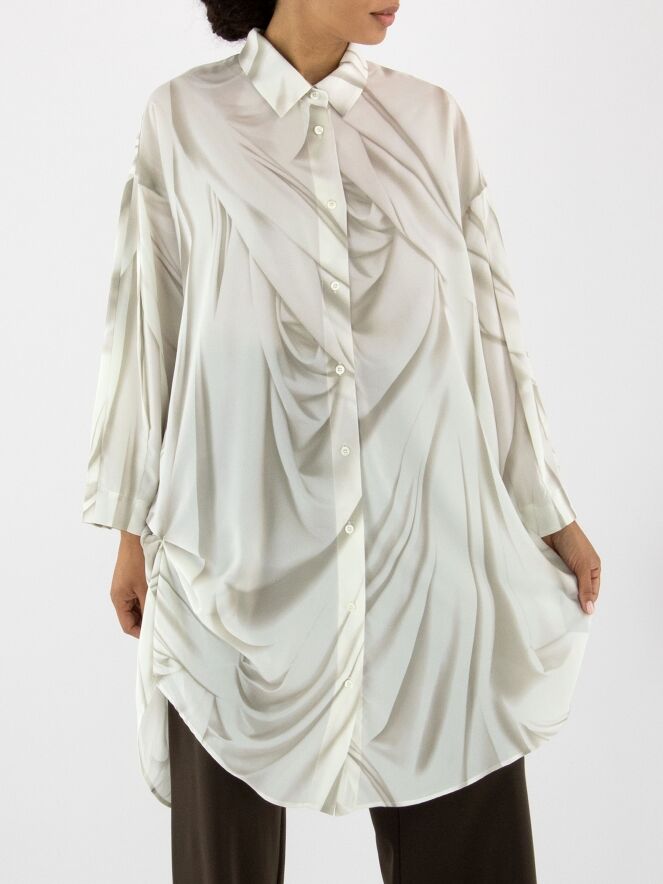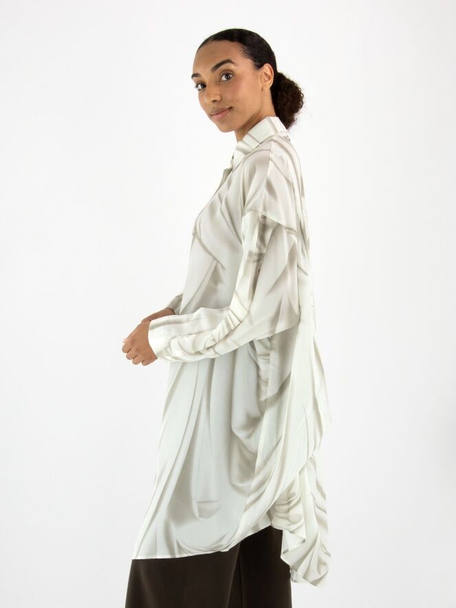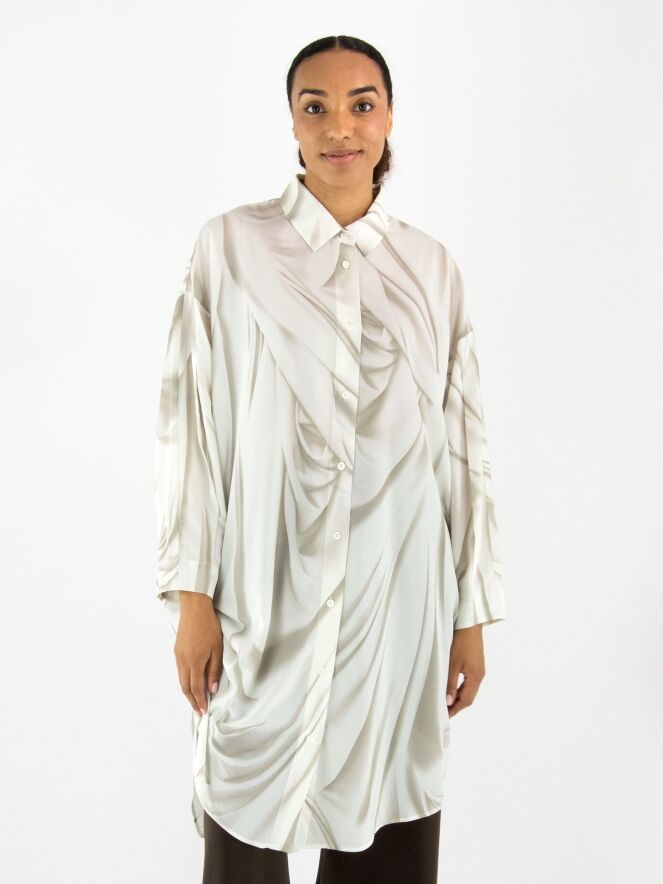 Blouse oversize de la marque High avec un imprimé de plis dans différentes teintes de beige sable et blanc cassé. L’ourlet est arrondi. À l’arrière, au niveau des hanches, un effet froncé crée un drapé élégant. La blouse a des manches mi-longues et peut être lavée à 30 degrés.