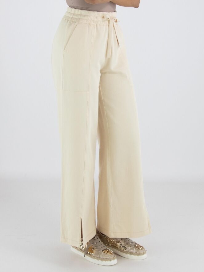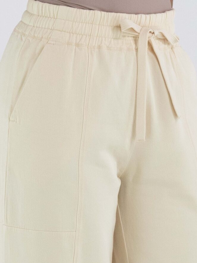 Un pantalon de jogging de High Lab en jaune pastel. La taille est dotée d’une bande élastique plissée avec un cordon dans une coulisse. En bas, une fente est placée au centre devant des jambes. Le pantalon possède des poches fendues et peut être lavé à 30 degrés.