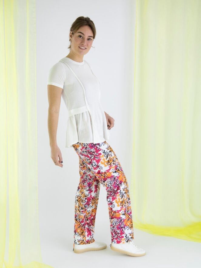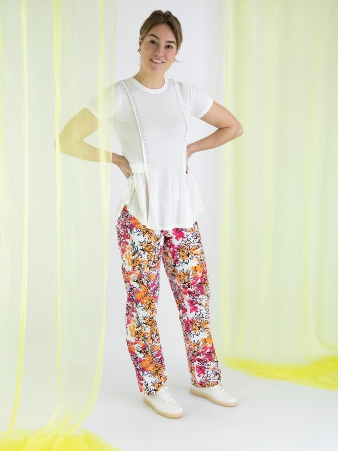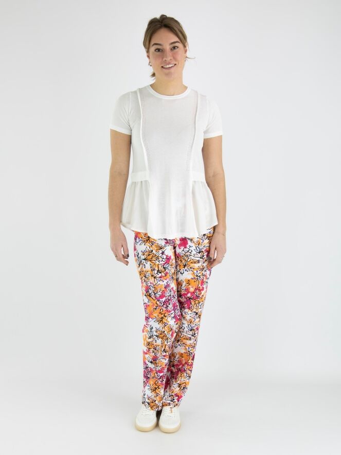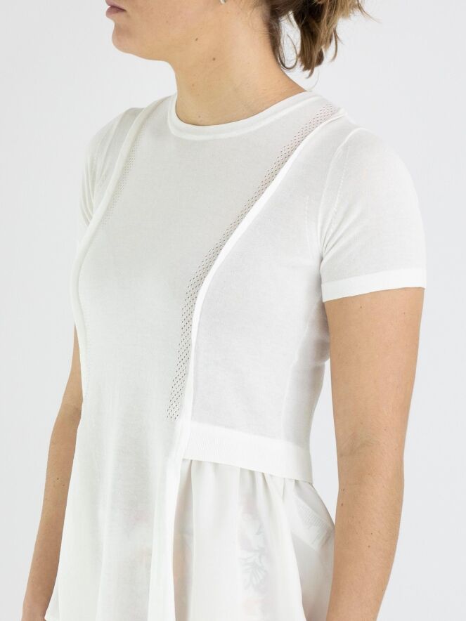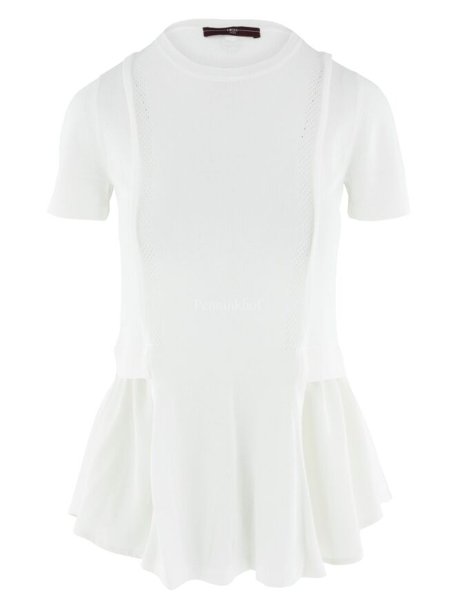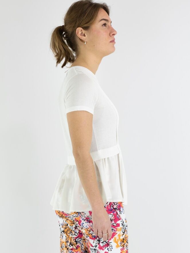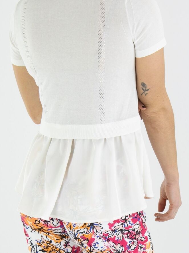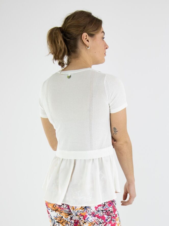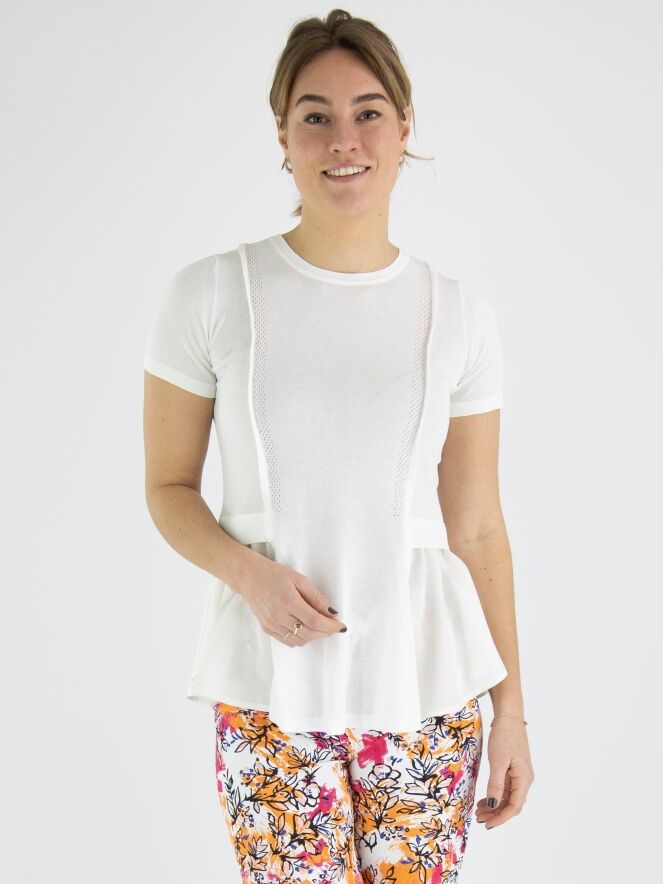 Un chemisier finement tissé de High en blanc crème. À gauche et à droite du centre, il y a une bordure ajourée, avec une bordure en tricot finement côtelée à côté sur le devant. À partir de la taille, les côtés se prolongent vers l'arrière avec un tissu en satin mat. Le chemisier a des manches courtes et peut être lavé à la main.