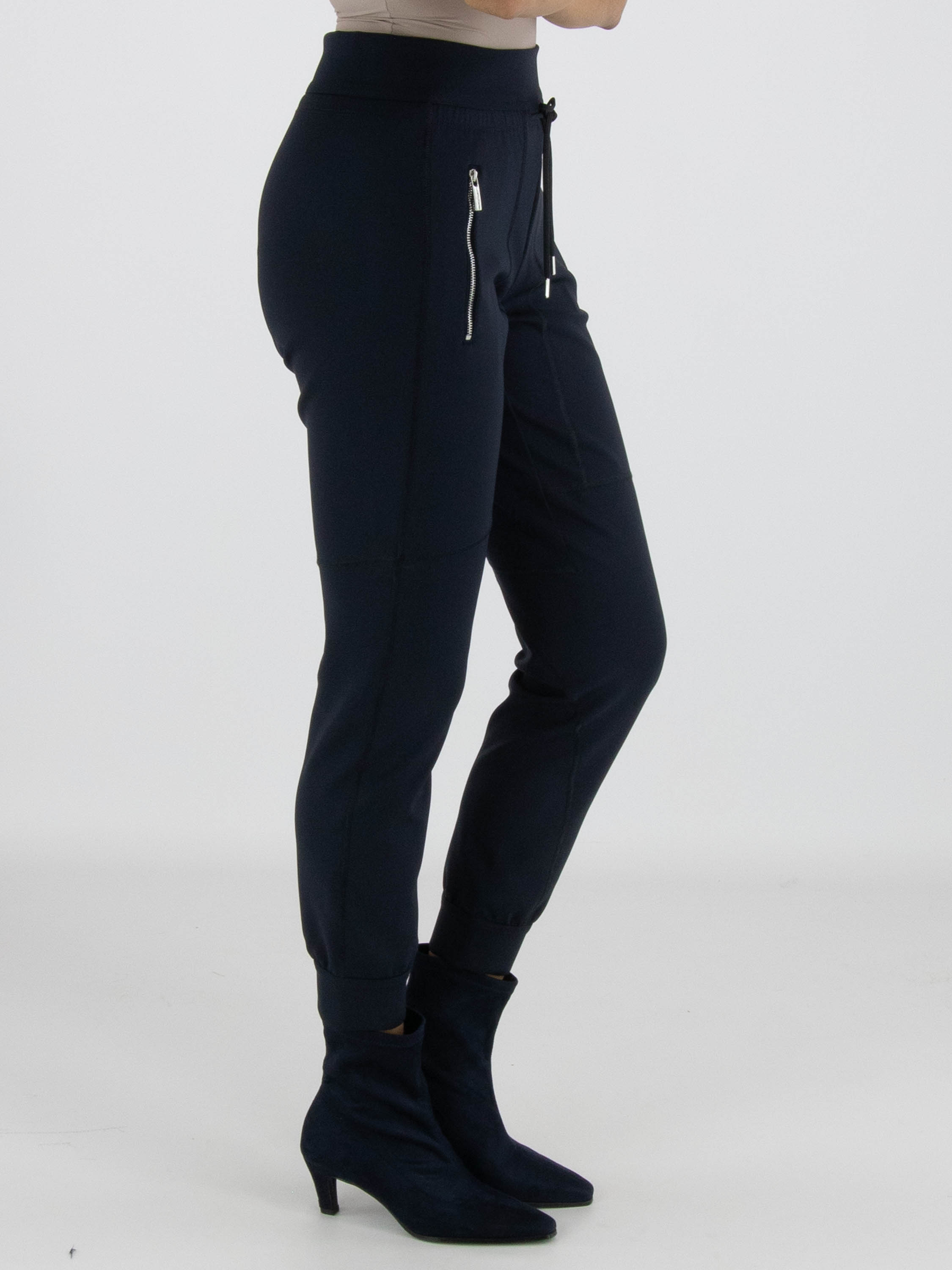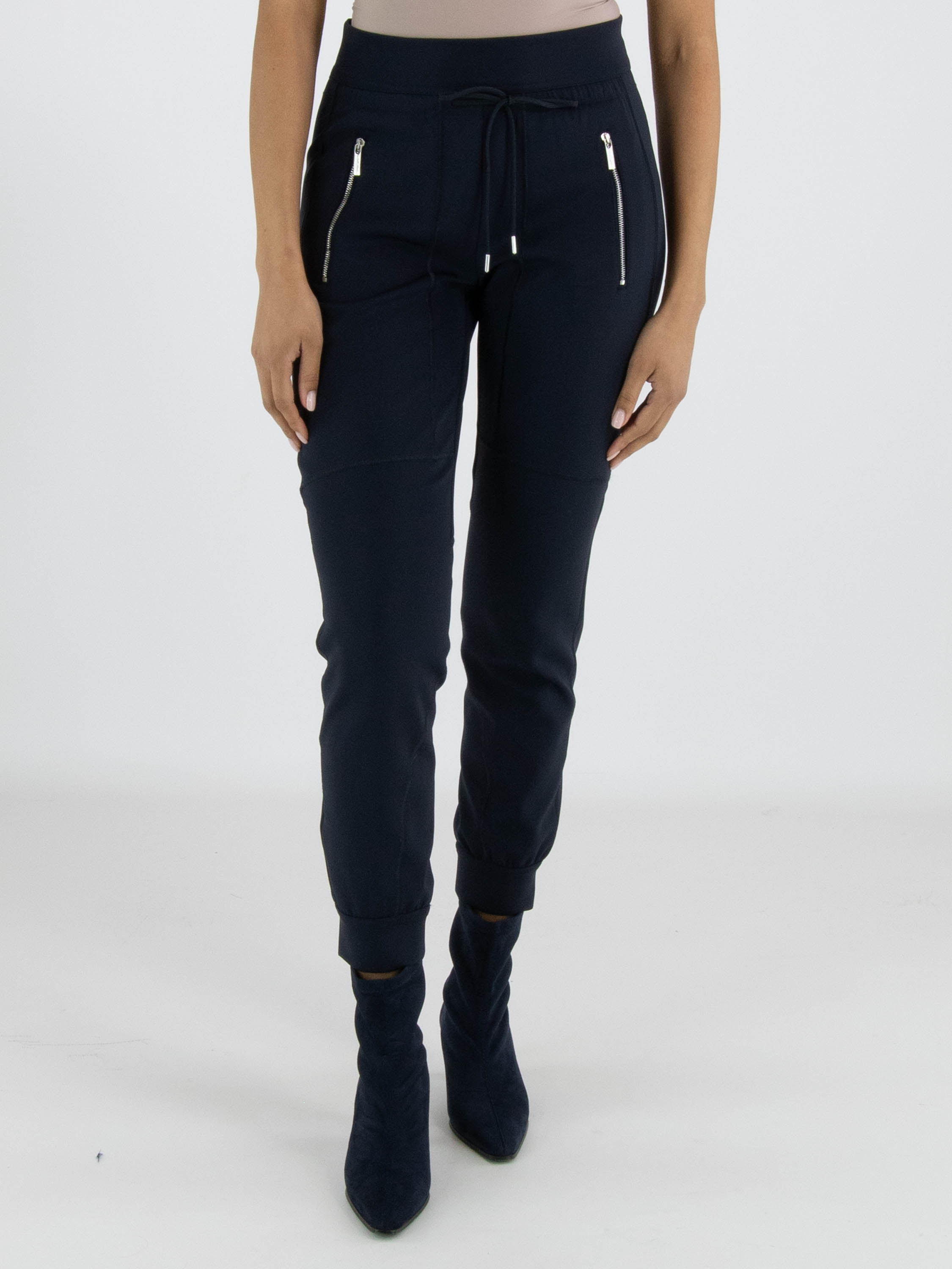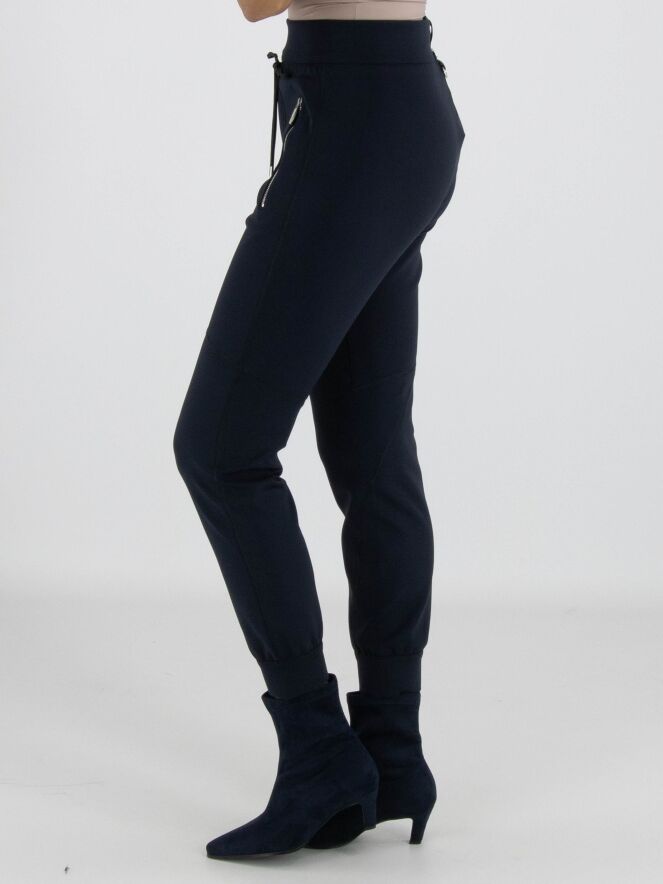 Un pantalon de jogging de High en bleu marine. La taille et le bas des jambes comportent une bande élastique lisse. Juste sous la ceinture, un cordon passe dans une coulisse. Les poches fendues profondes sont munies de fermetures zippées. Sur la cuisse, au niveau des genoux et le long des côtés du bas de jambe, plusieurs coutures décoratives sont appliquées. Ce pantalon peut être lavé à 30 degrés.