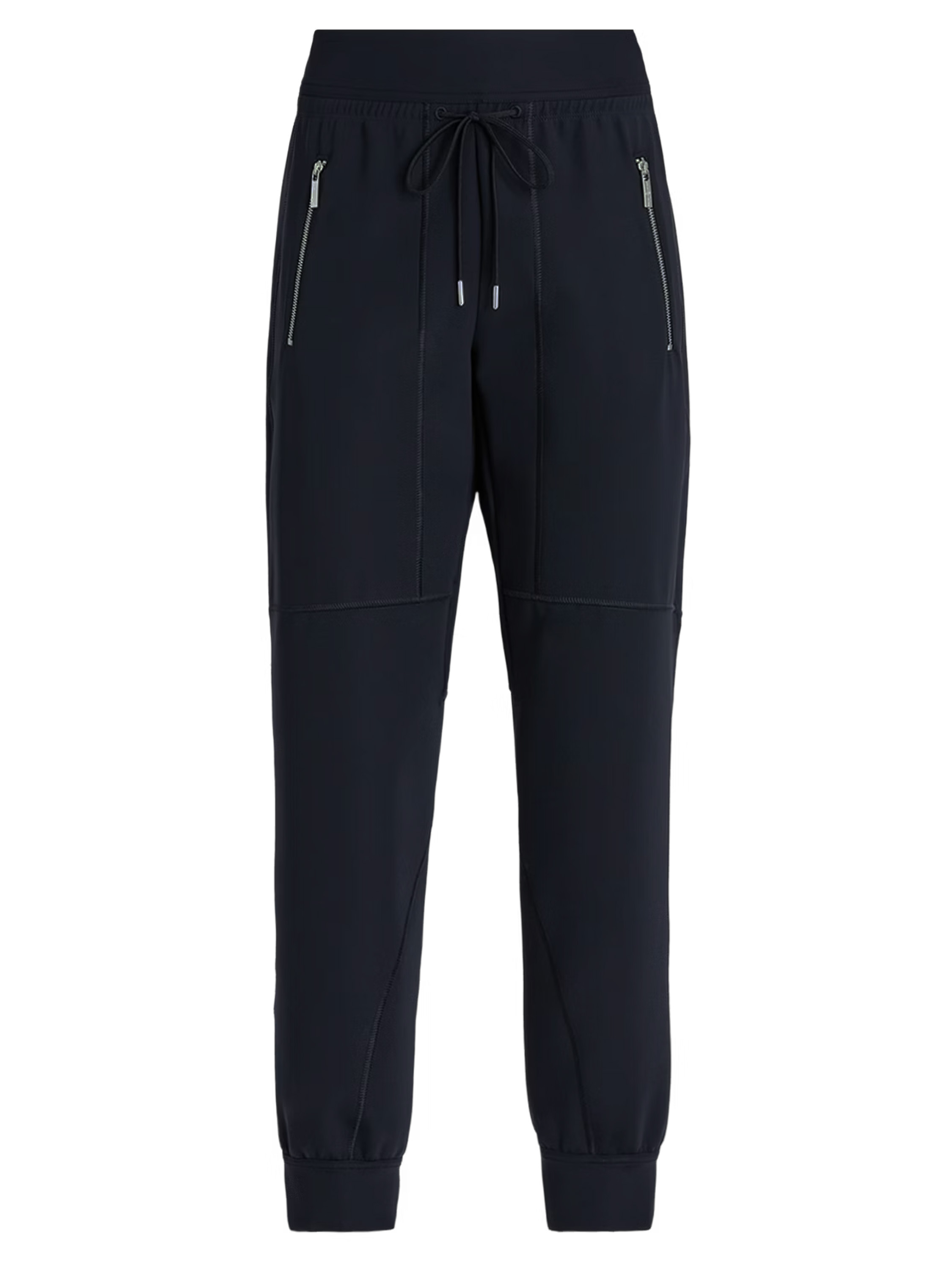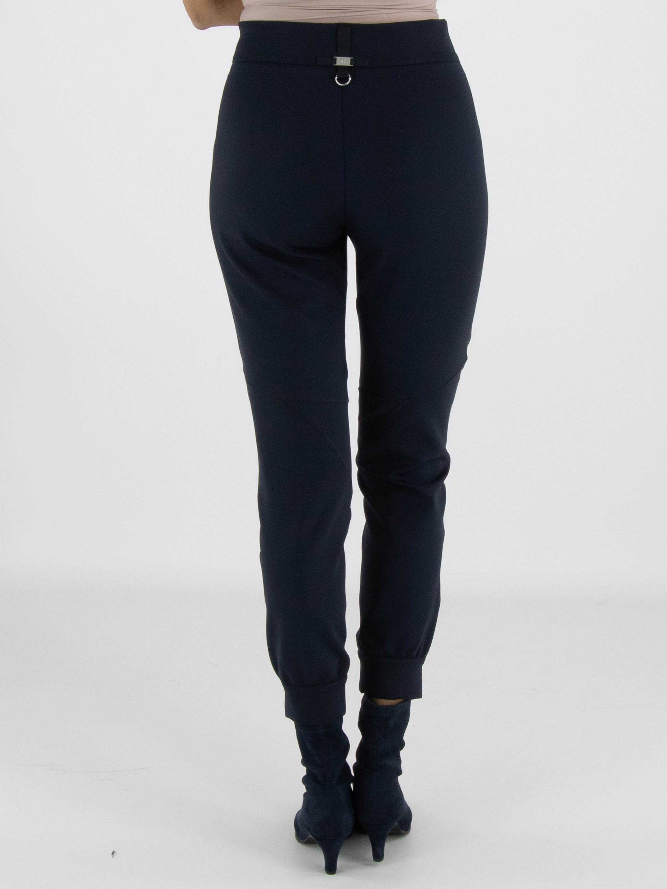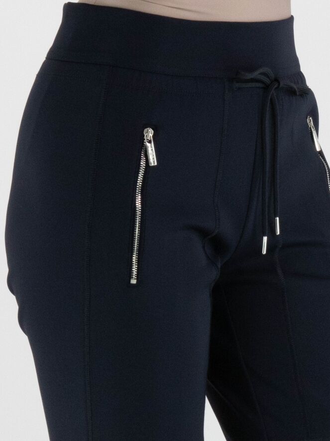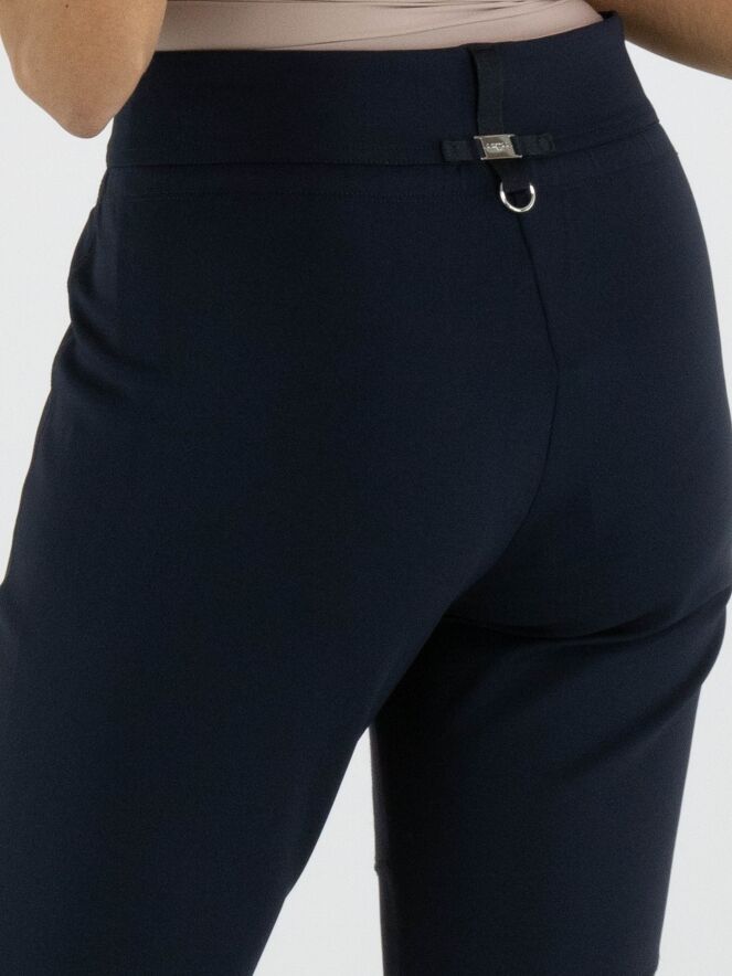 Un pantalon de jogging de High en bleu marine. La taille et le bas des jambes comportent une bande élastique lisse. Juste sous la ceinture, un cordon passe dans une coulisse. Les poches fendues profondes sont munies de fermetures zippées. Sur la cuisse, au niveau des genoux et le long des côtés du bas de jambe, plusieurs coutures décoratives sont appliquées. Ce pantalon peut être lavé à 30 degrés.