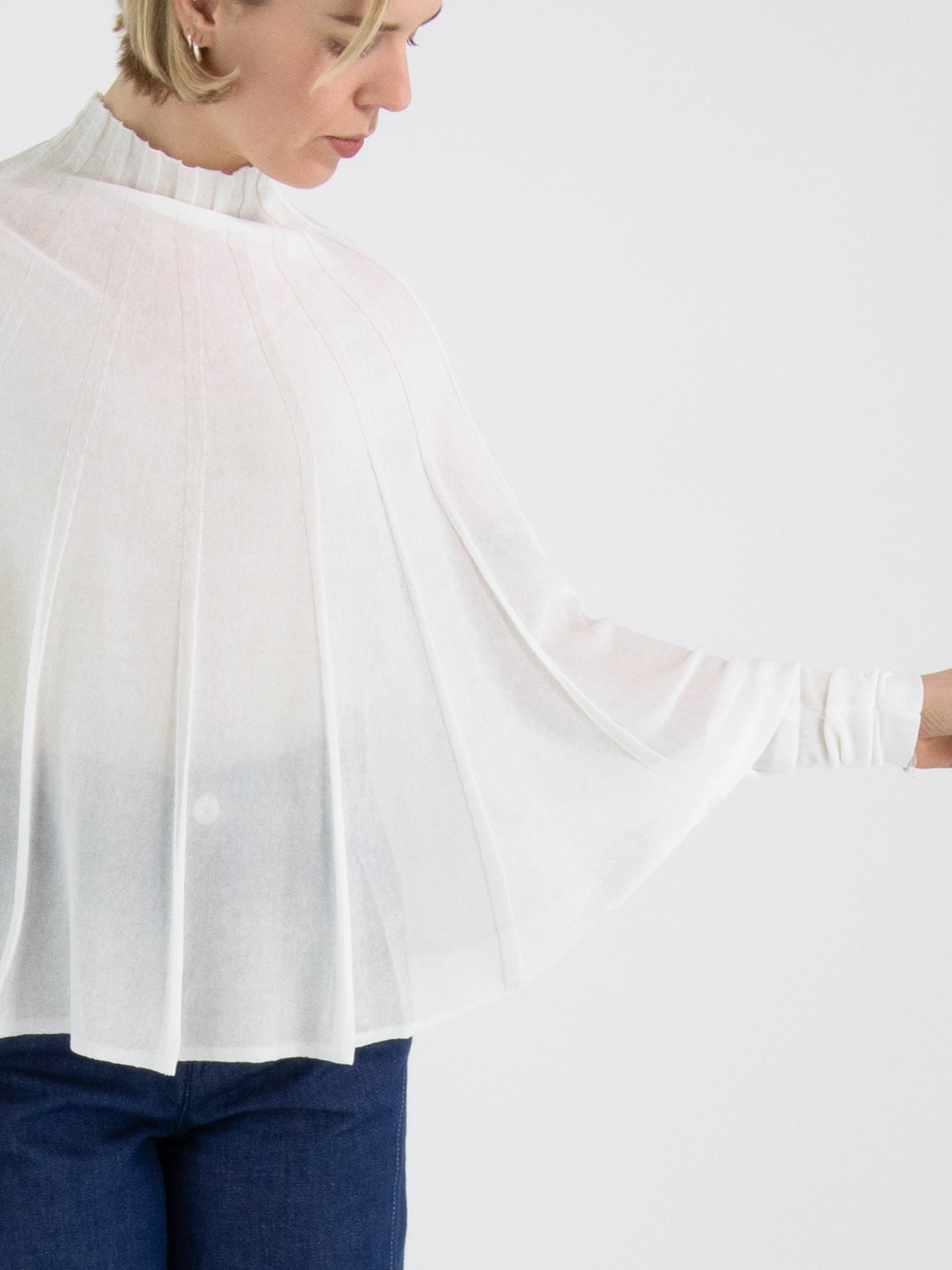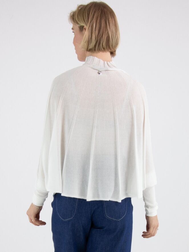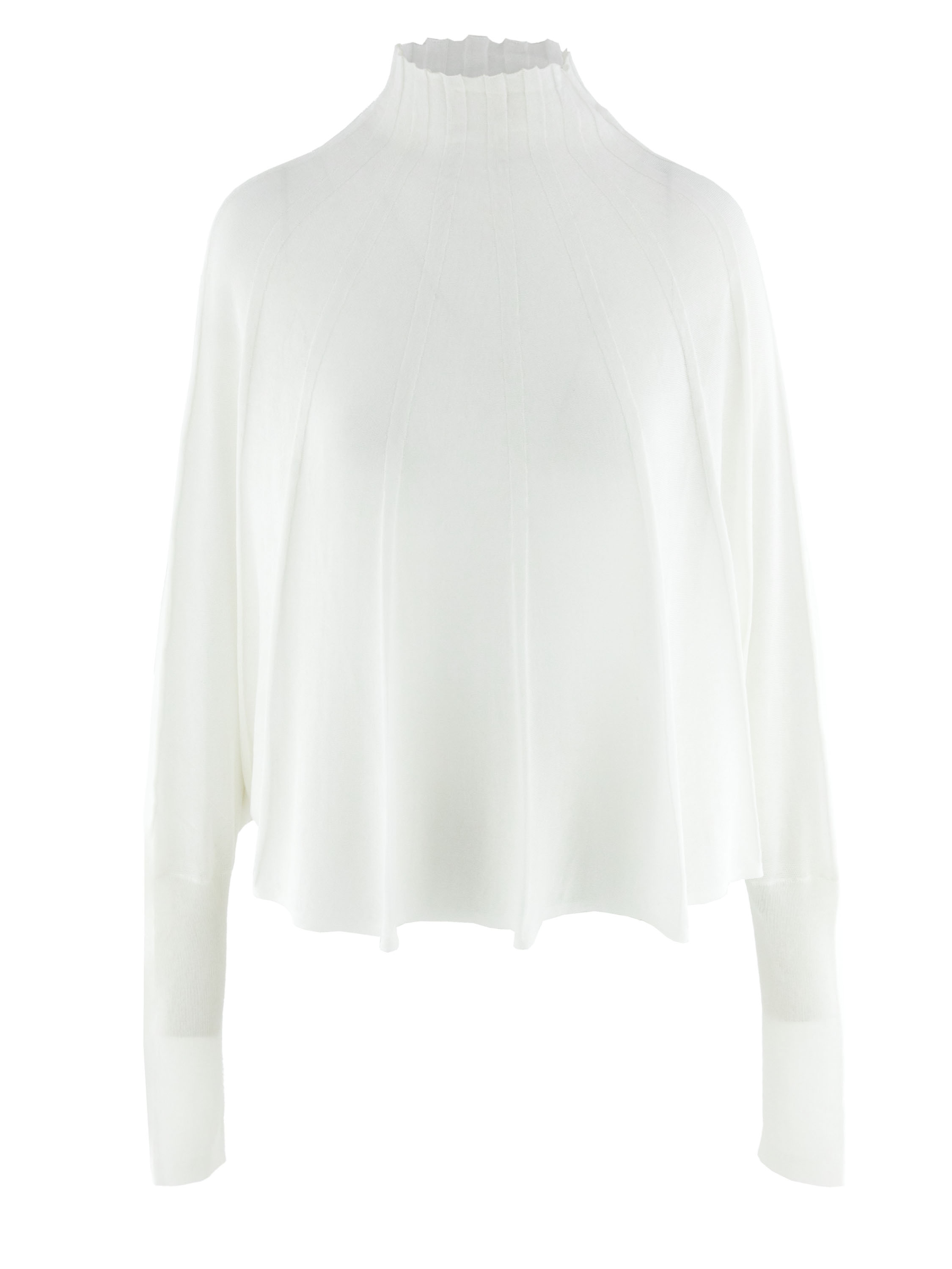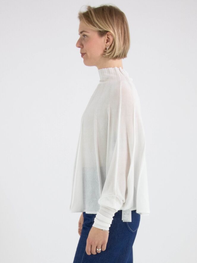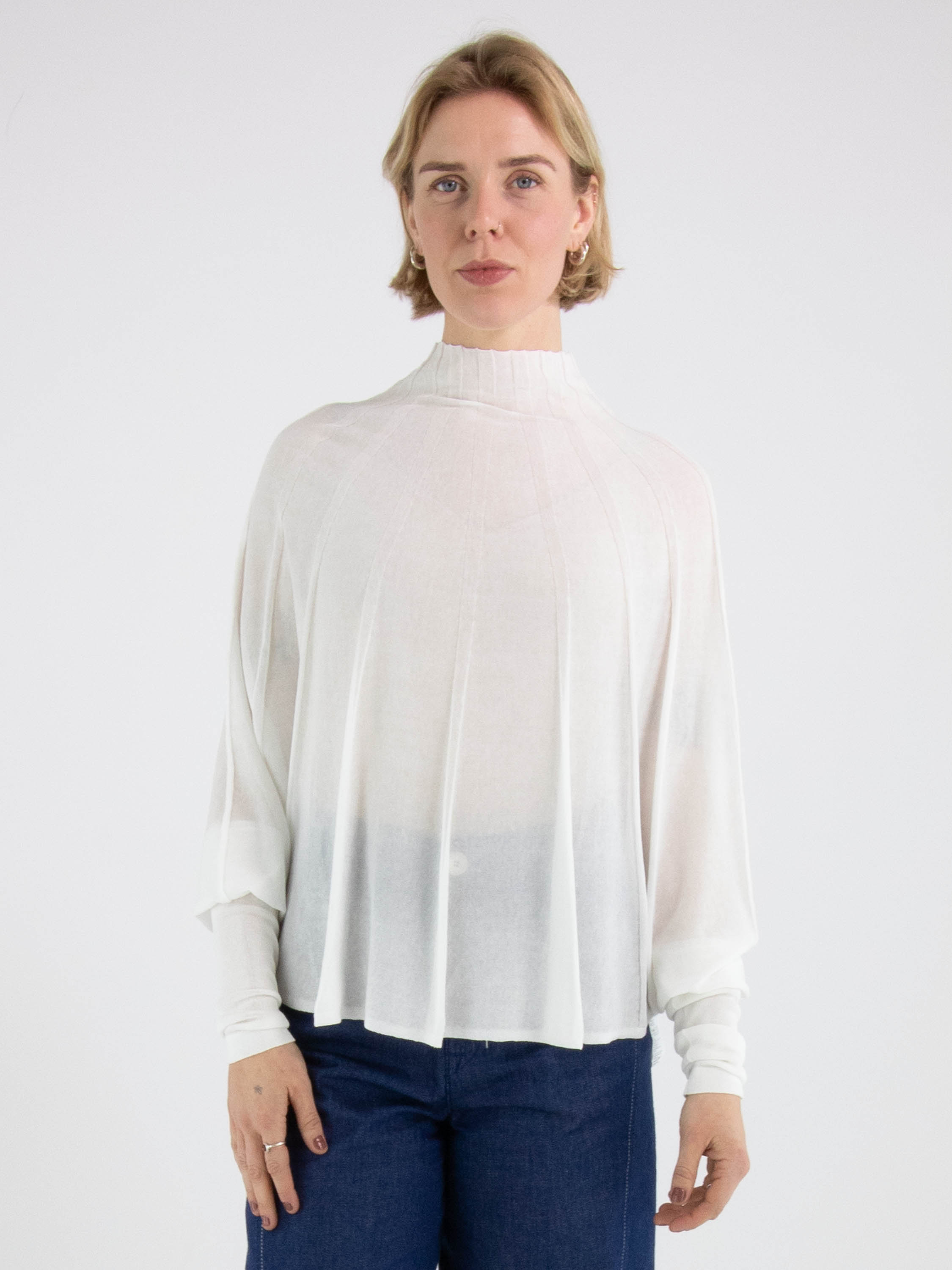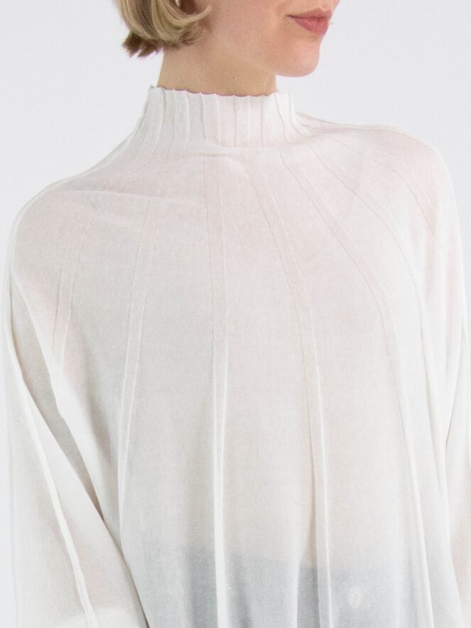 Un pull design légèrement transparent de High avec une structure à rayures verticales en blanc cassé. Il présente un col montant et des manches chauve-souris avec de longs poignets finement côtelés. Ce pull peut être lavé à la main.