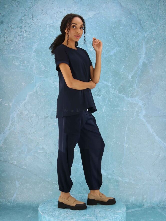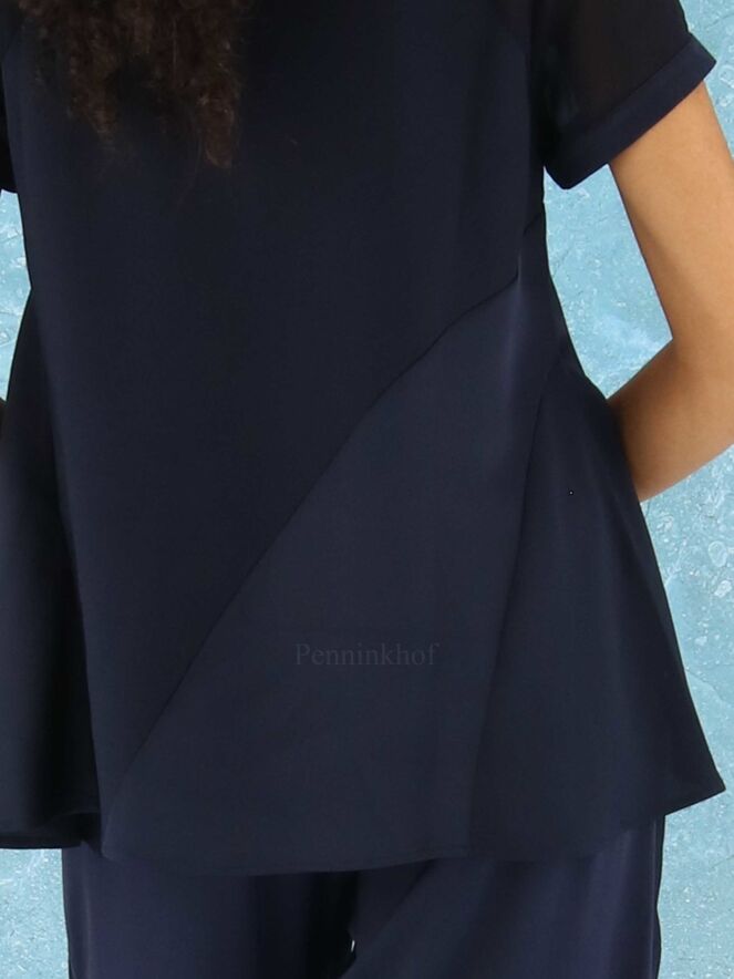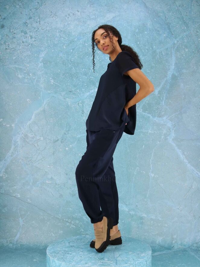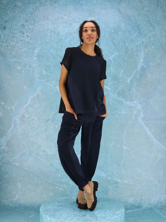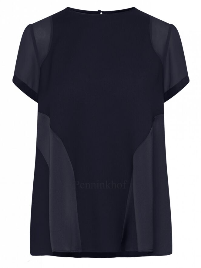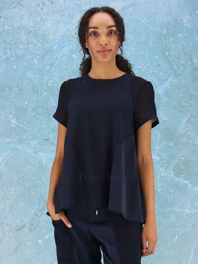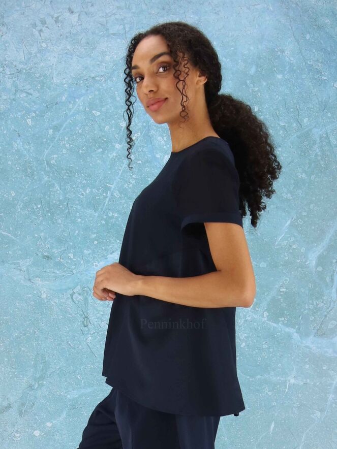 Chemise à manches courtes de la marque High, à deux nuances de bleu marine dans un tissu satiné mat. Les manches courtes sont légèrement transparentes. La chemise présente une coupe en ligne A. Lavage à la main.