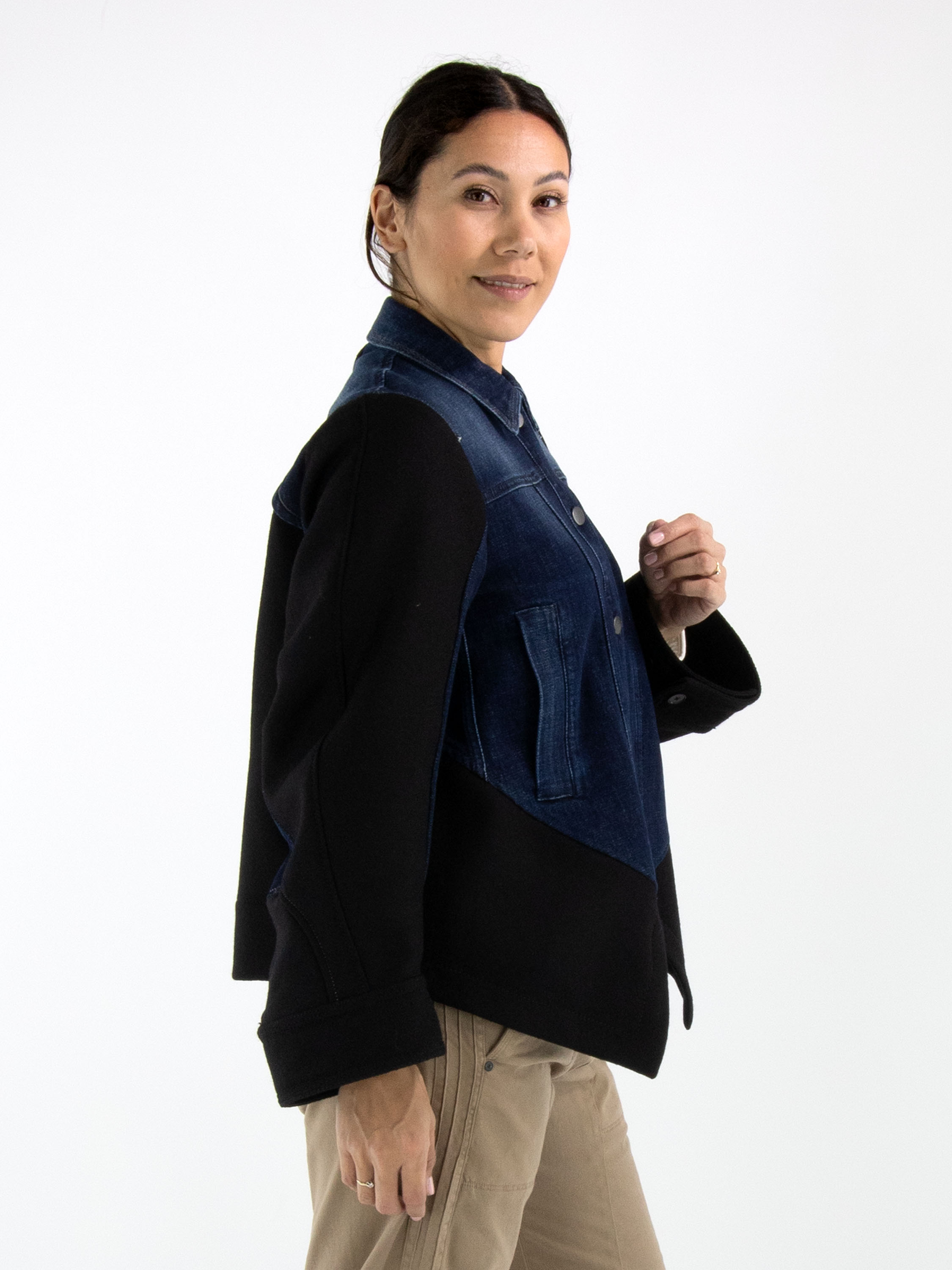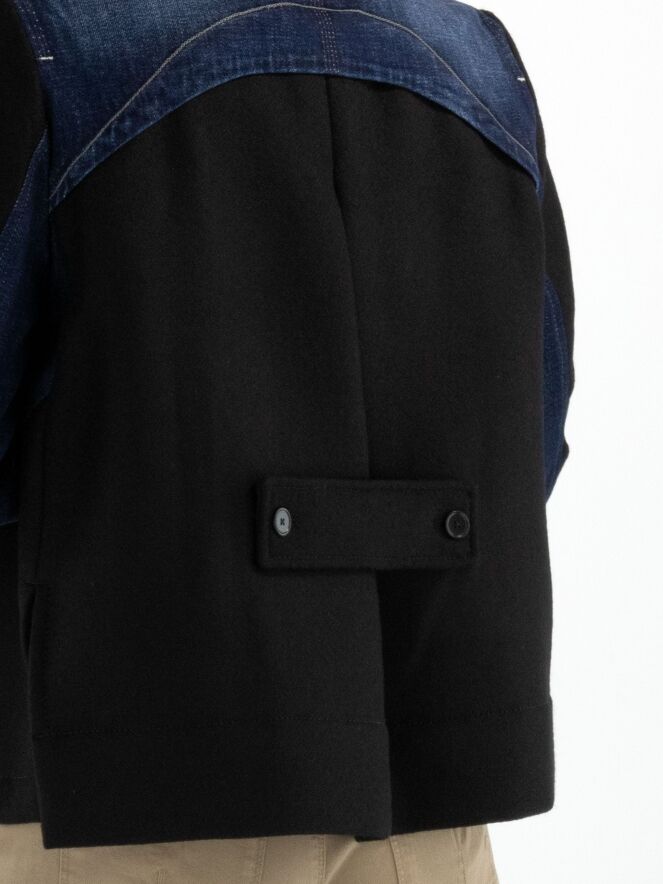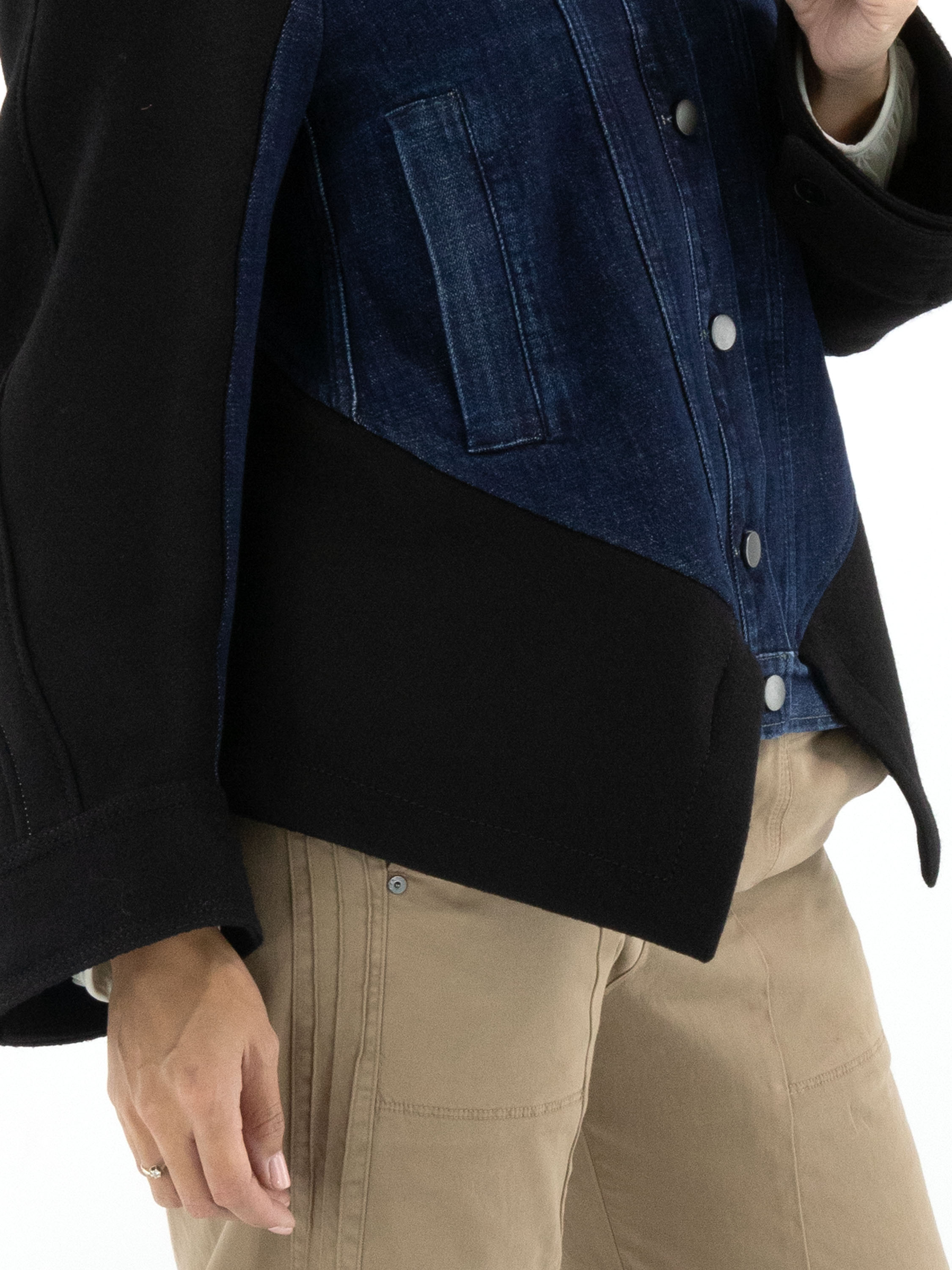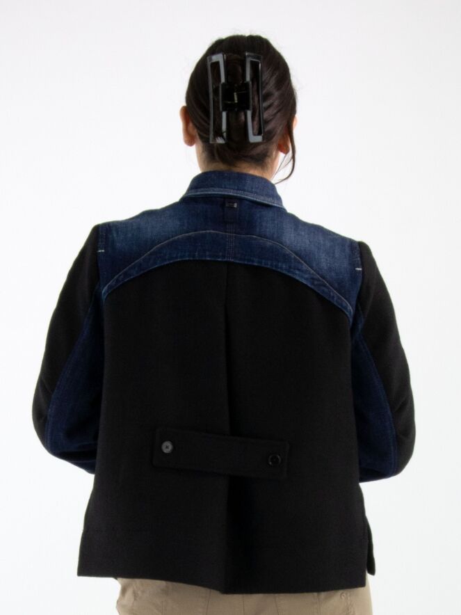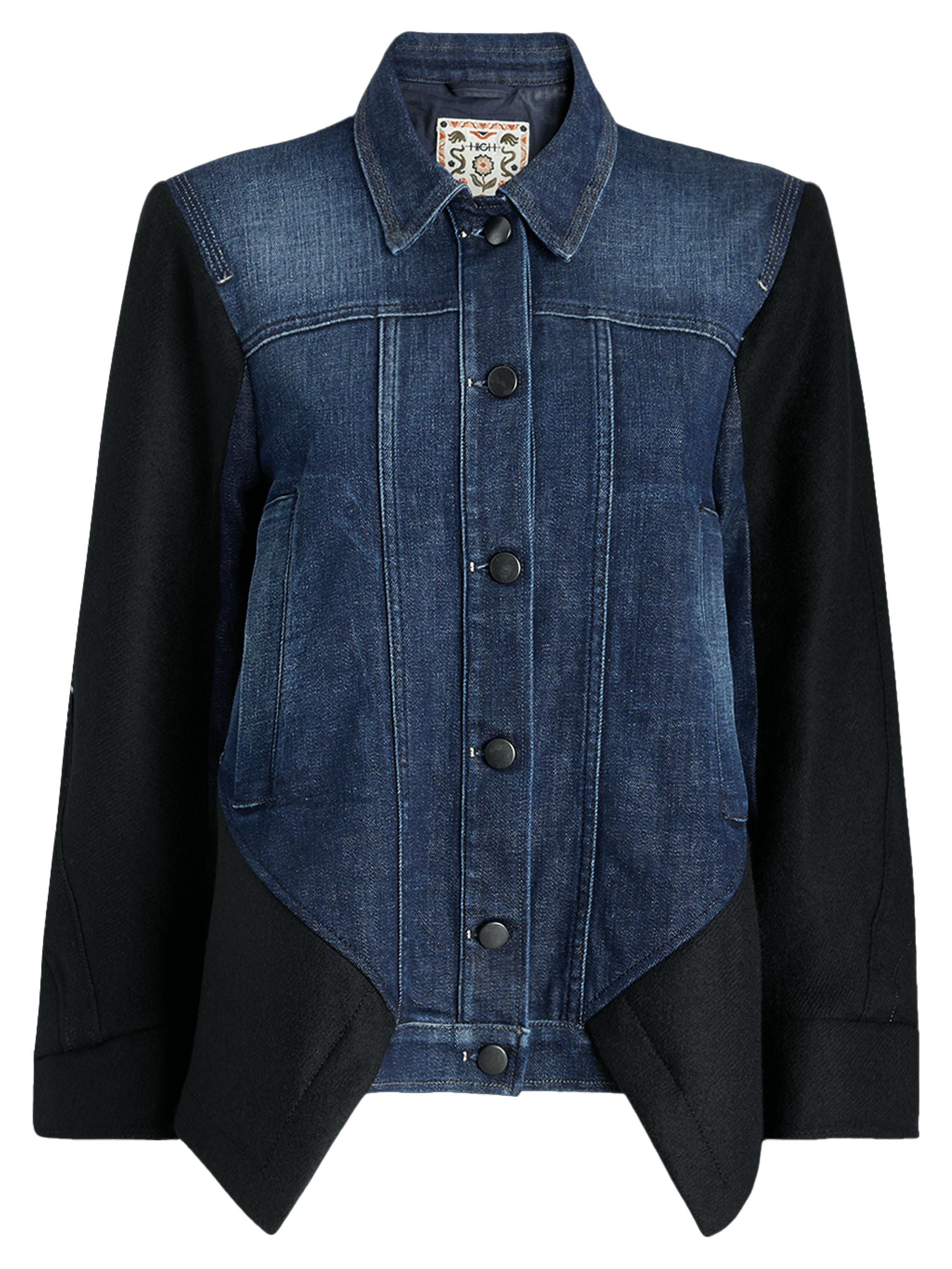 Un blazer en jean de High en denim foncé, associé à de la laine bouillie luxueuse au dos, à la base et en partie sur les manches. Le modèle se ferme par un bouton et présente des poches fendues à hauteur de taille. Ce blazer ne doit pas être lavé.