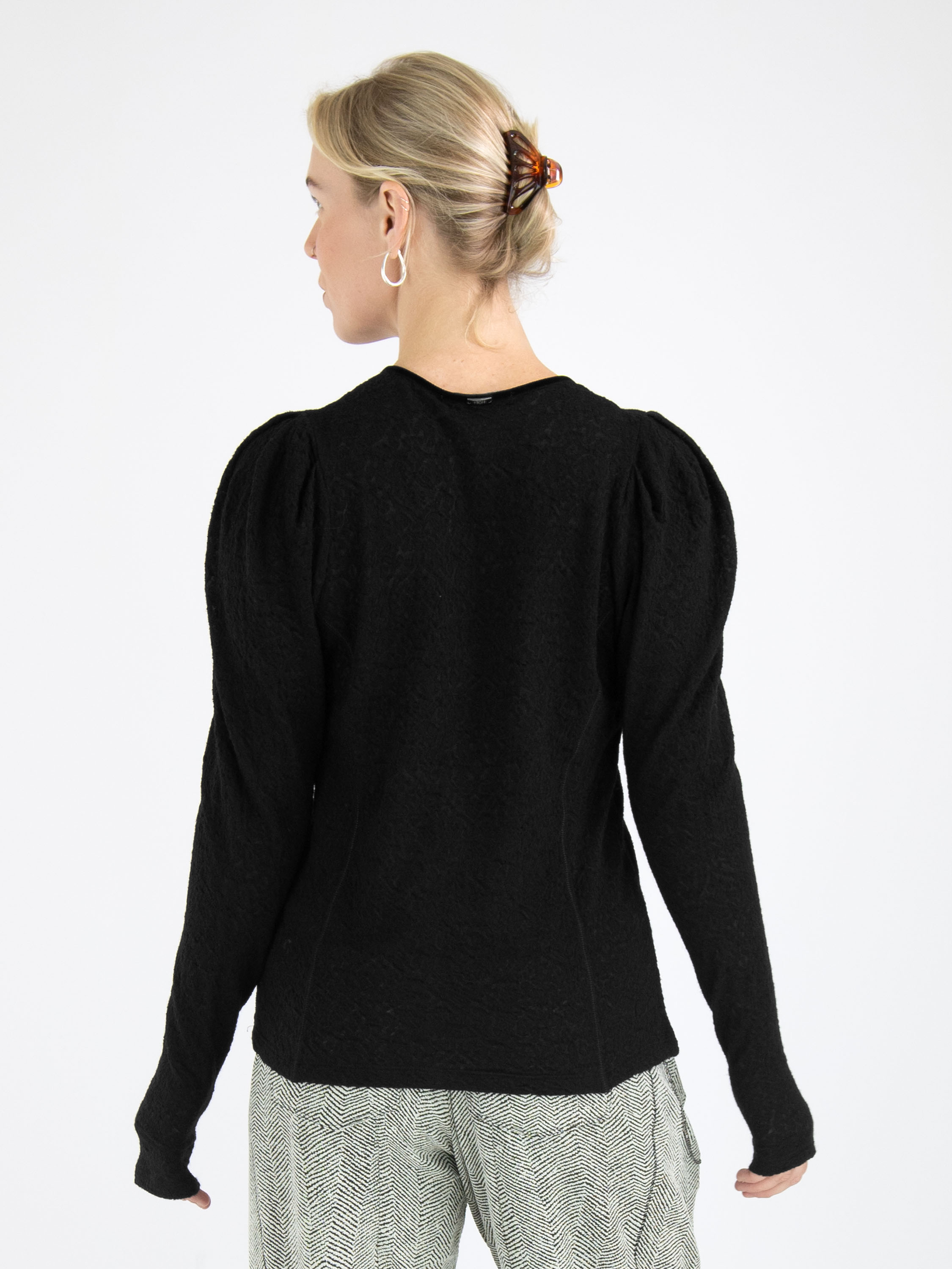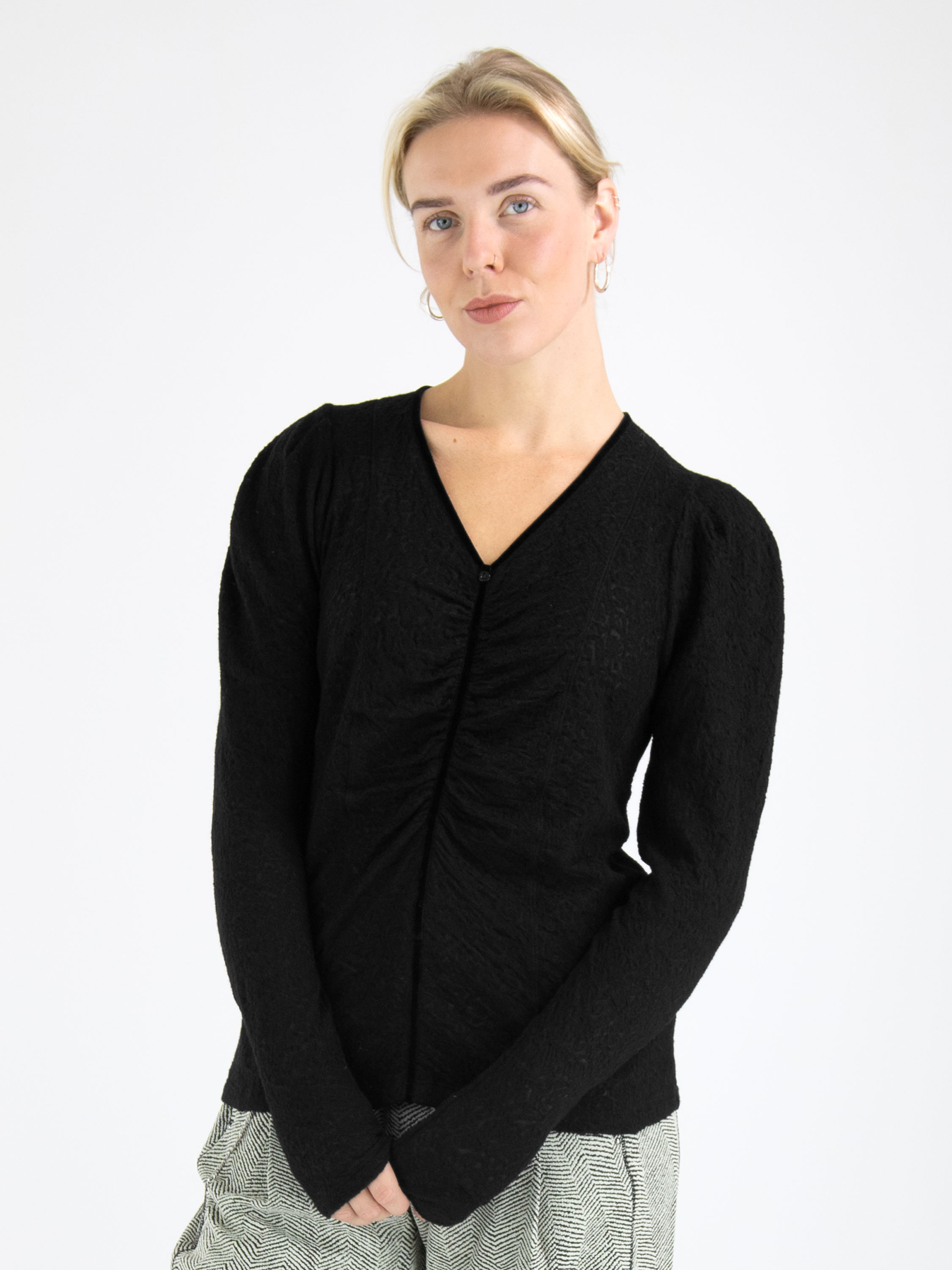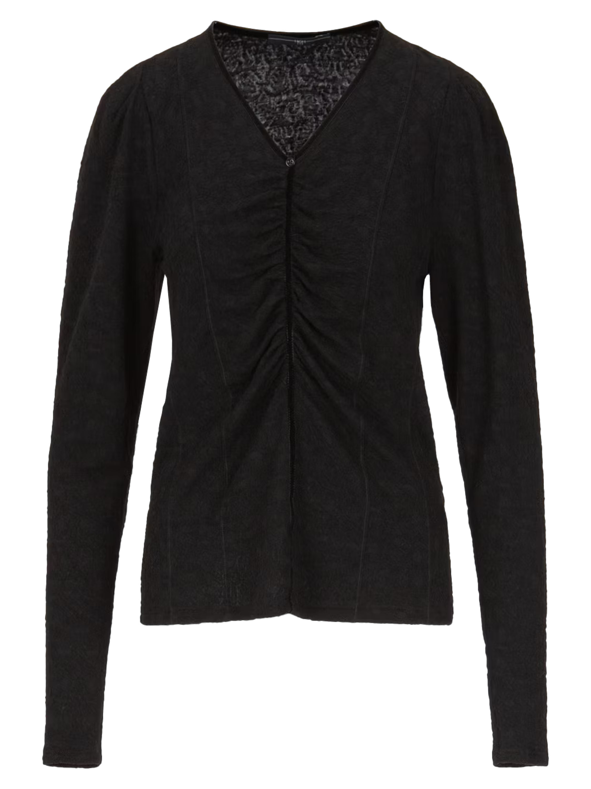 Un t-shirt léger et transparent de High avec une structure en relief de couleur noire. Le long du bord du col en V se trouve une bordure en velours qui se prolonge vers le bas depuis le point central du col en V. Le tissu est finement plissé le long de cette bordure. Ce t-shirt peut être lavé à la main.