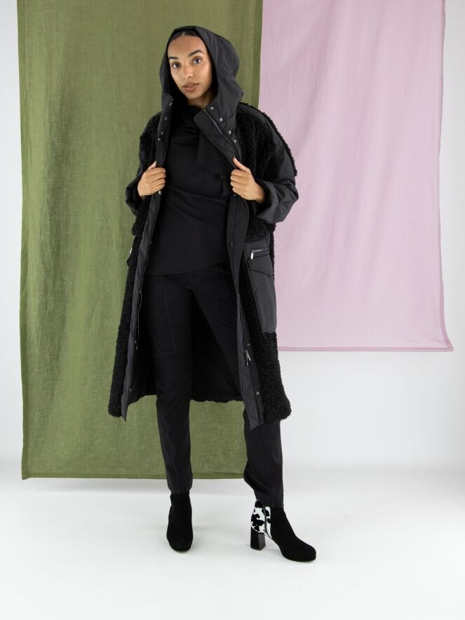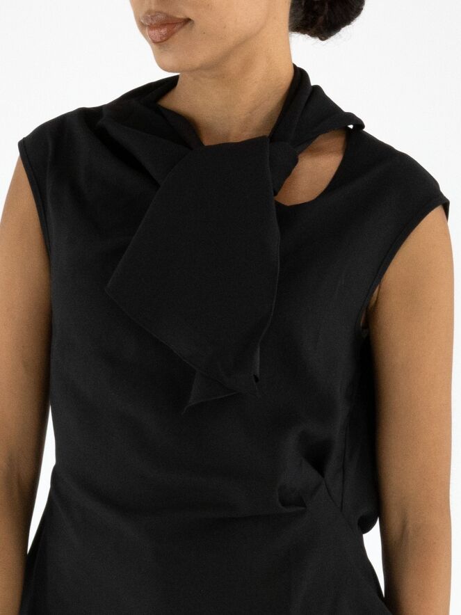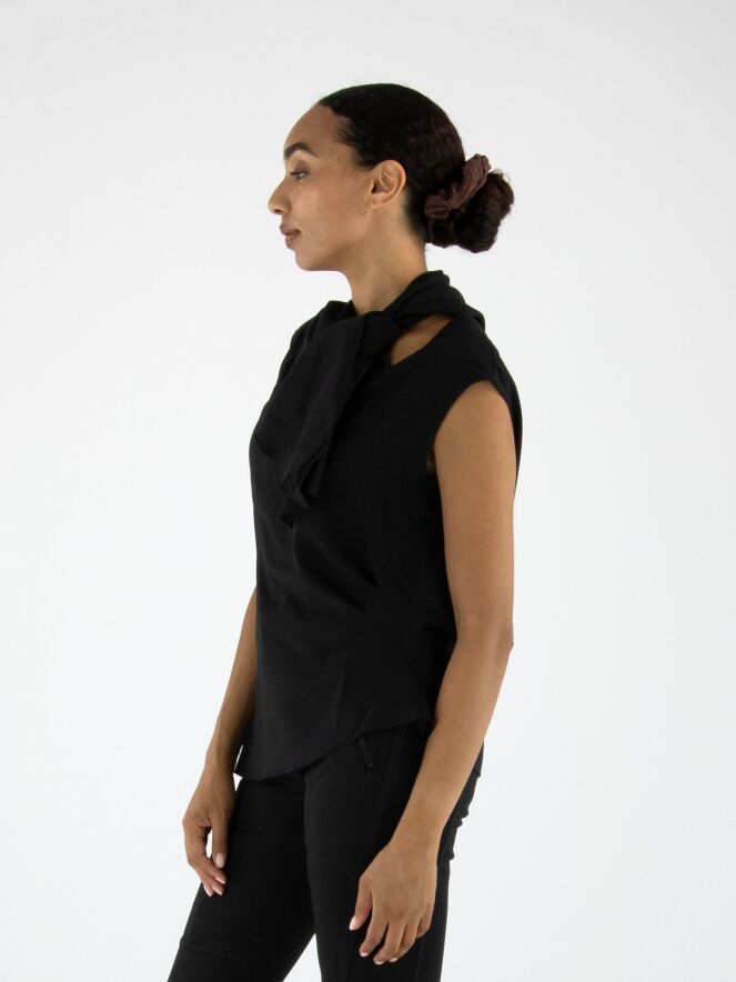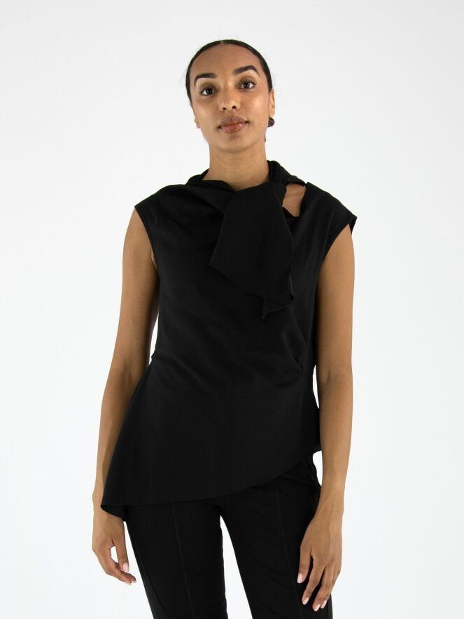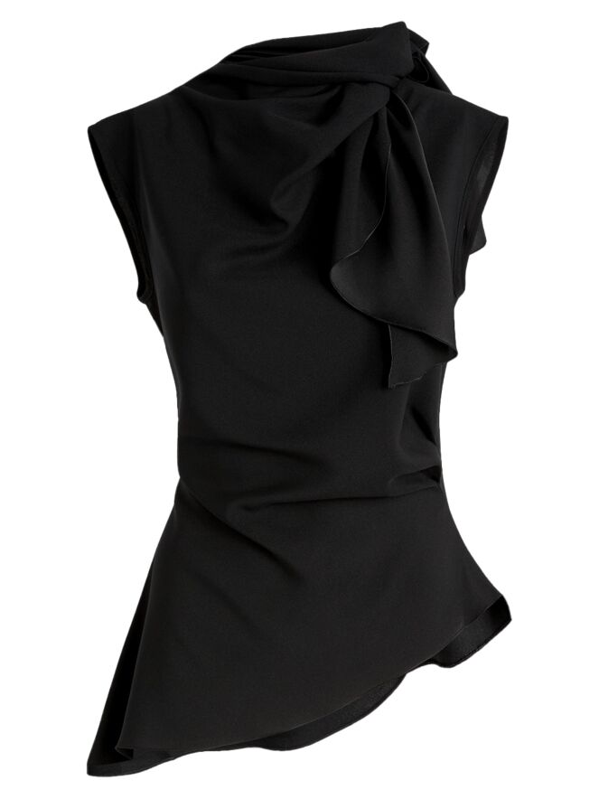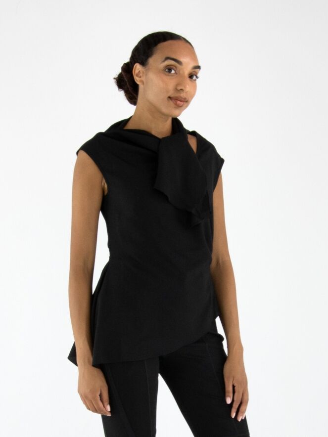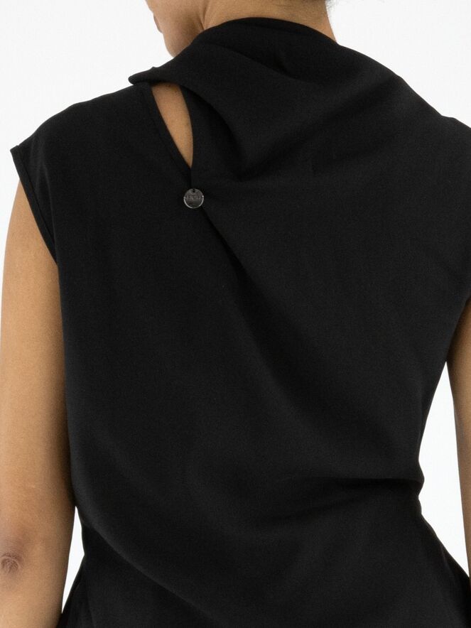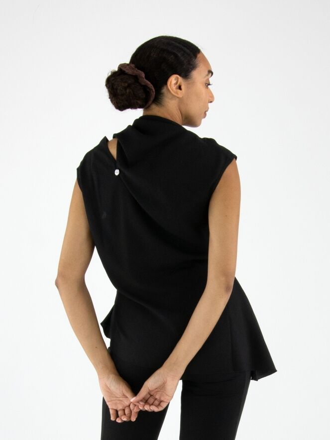 Un top de la marque High en noir. À l’avant comme à l’arrière, un tissu double part de l’épaule droite vers le centre, laissant apparaître par endroits la doublure satinée mate le long du col en V. Sur le côté gauche, un froncement à la taille crée un effet drapé. Ce top peut être lavé à 30 degrés.