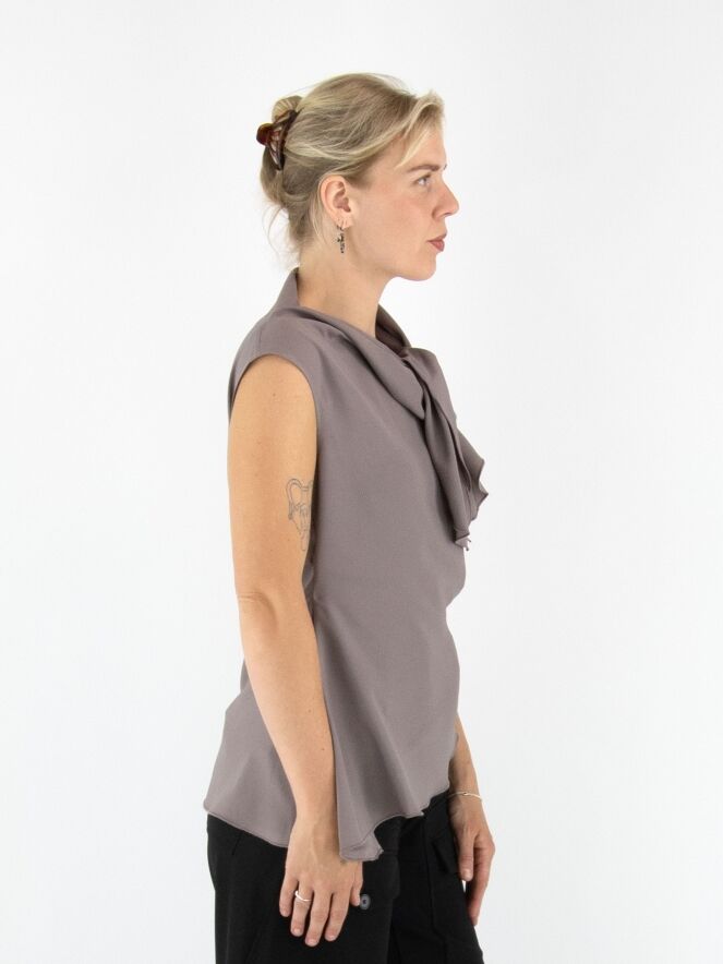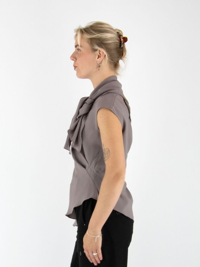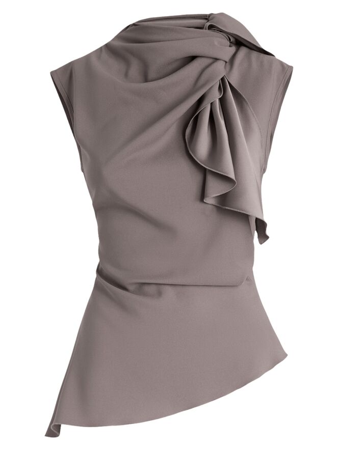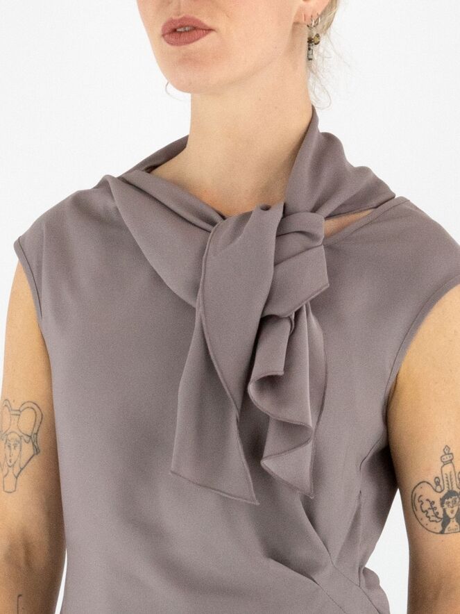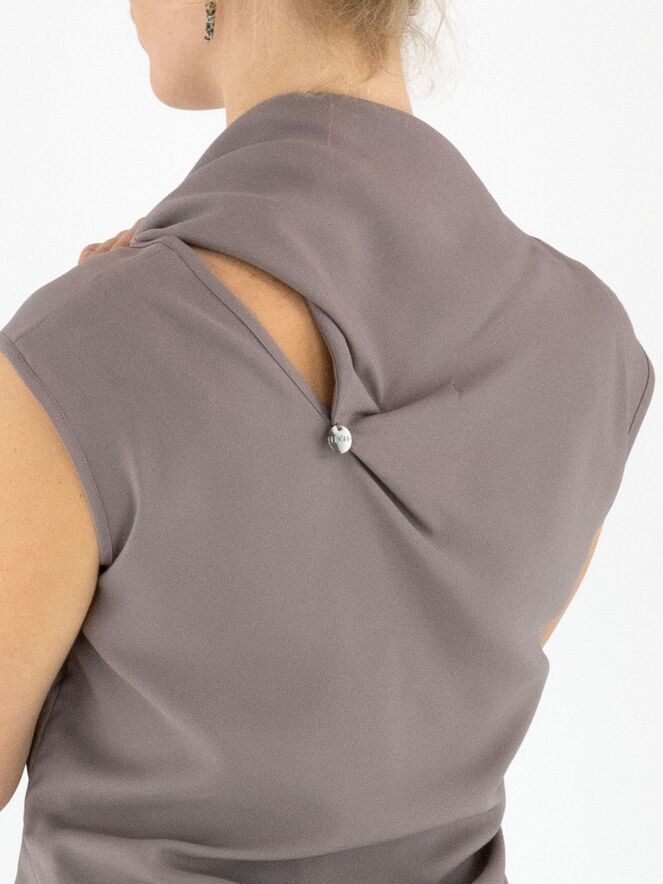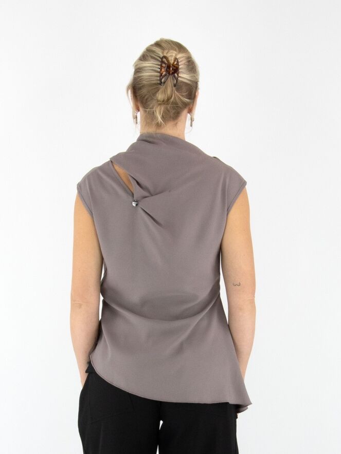 Ein Top von High in Grau. Sowohl vorne als auch hinten verläuft eine doppelte Stofflage von der rechten Schulter zur Mitte, wodurch die matte Satinrückseite entlang des V-Ausschnitts teilweise sichtbar wird. Auf der linken Seite auf Taillenhöhe sorgt eine Raffung für einen Falteneffekt. Dieses Top kann bei 30 Grad gewaschen werden.