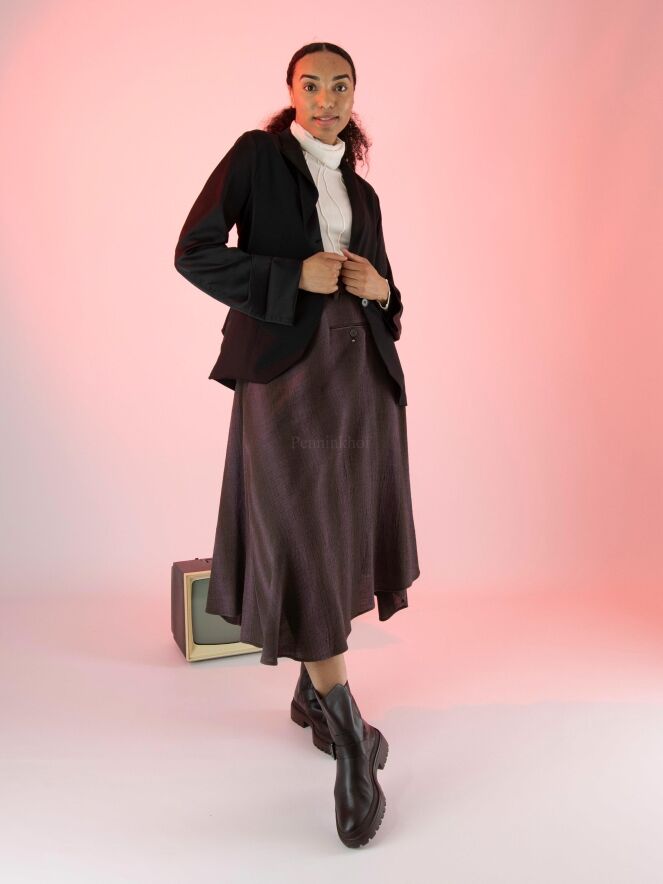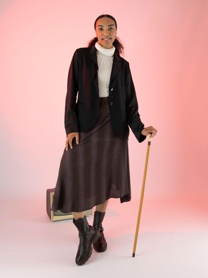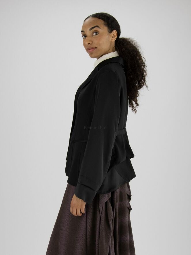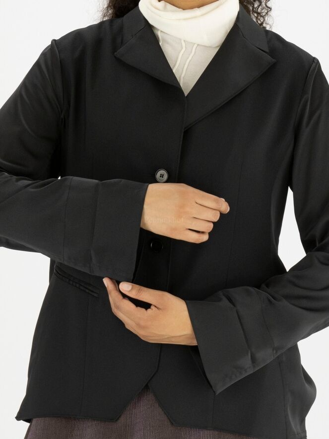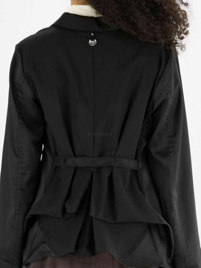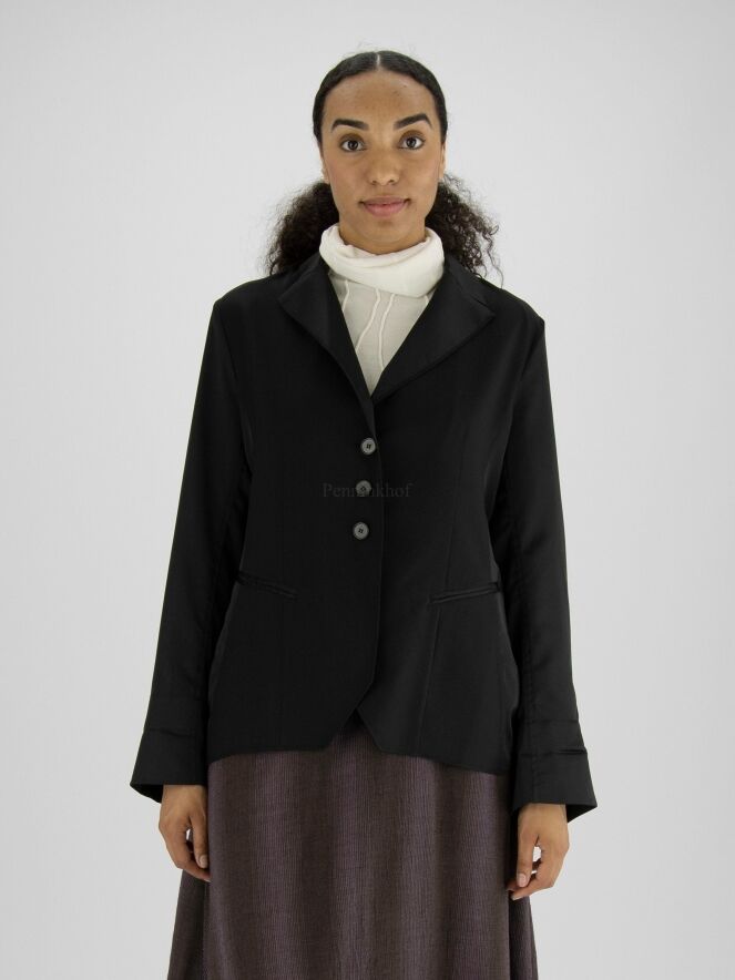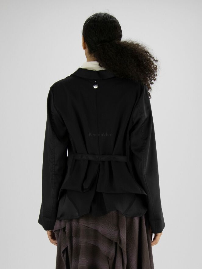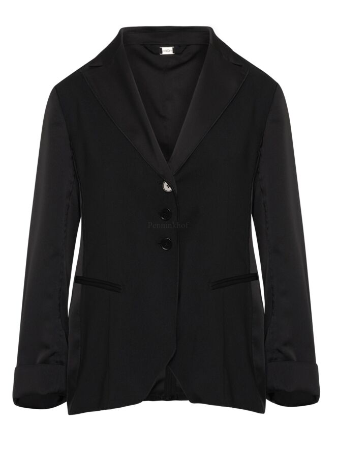 Veste à la ligne fluide de la marque High, de couleur noire. La fermeture est à trois boutons. La veste est dotée de poches passepoilées diagonales. Les manches longues satinées se terminent par des poignets droits retroussables. Une bande dans le dos permet de cintrer la taille. Lavage à la main.
