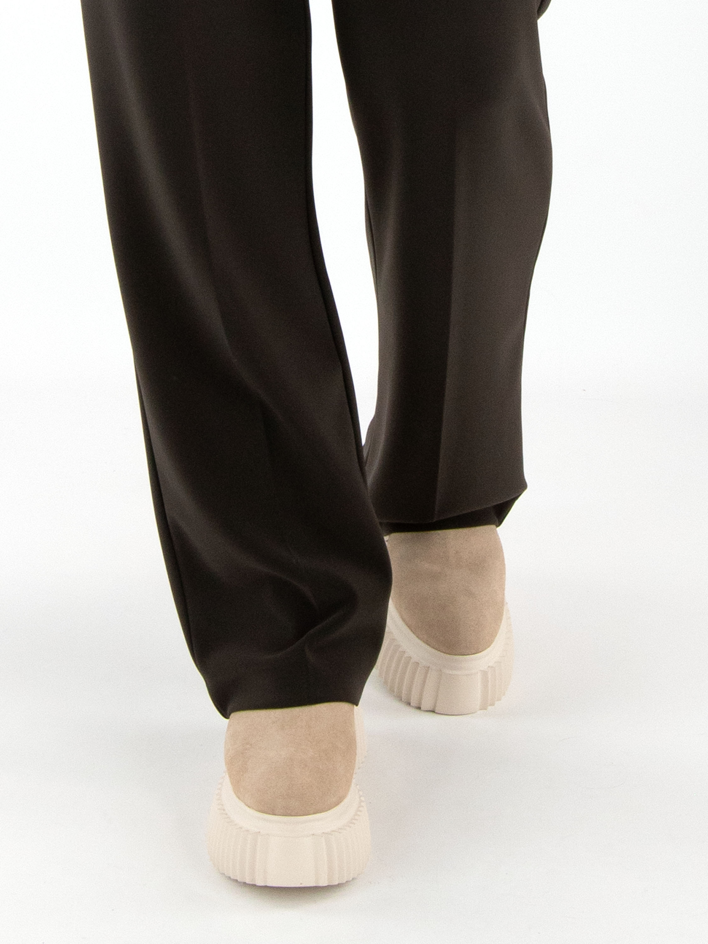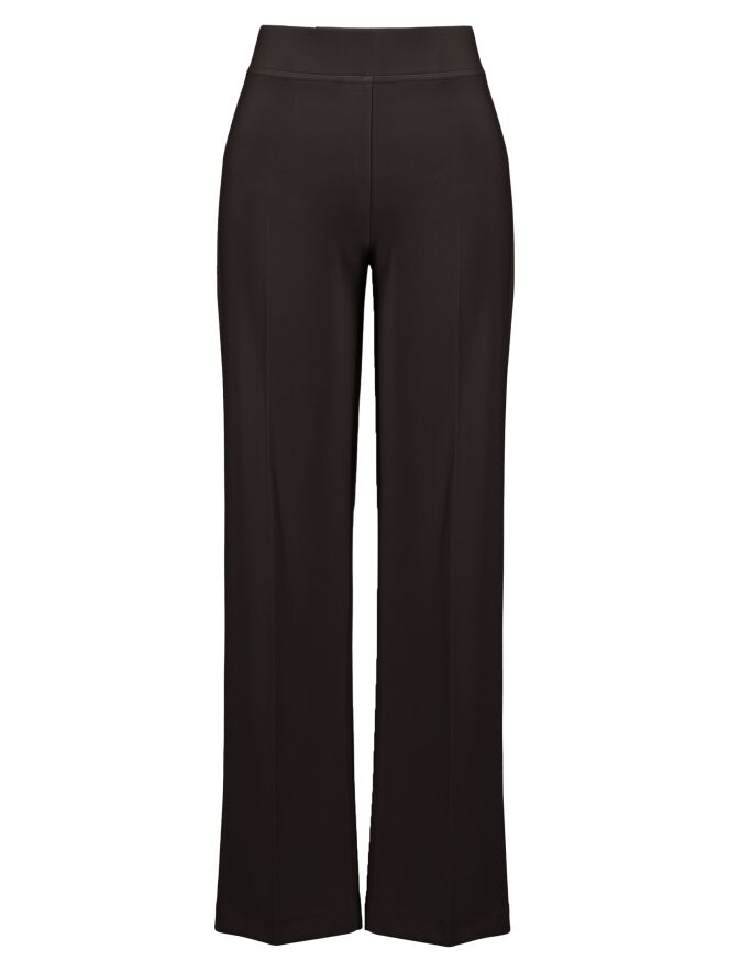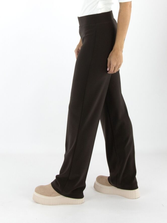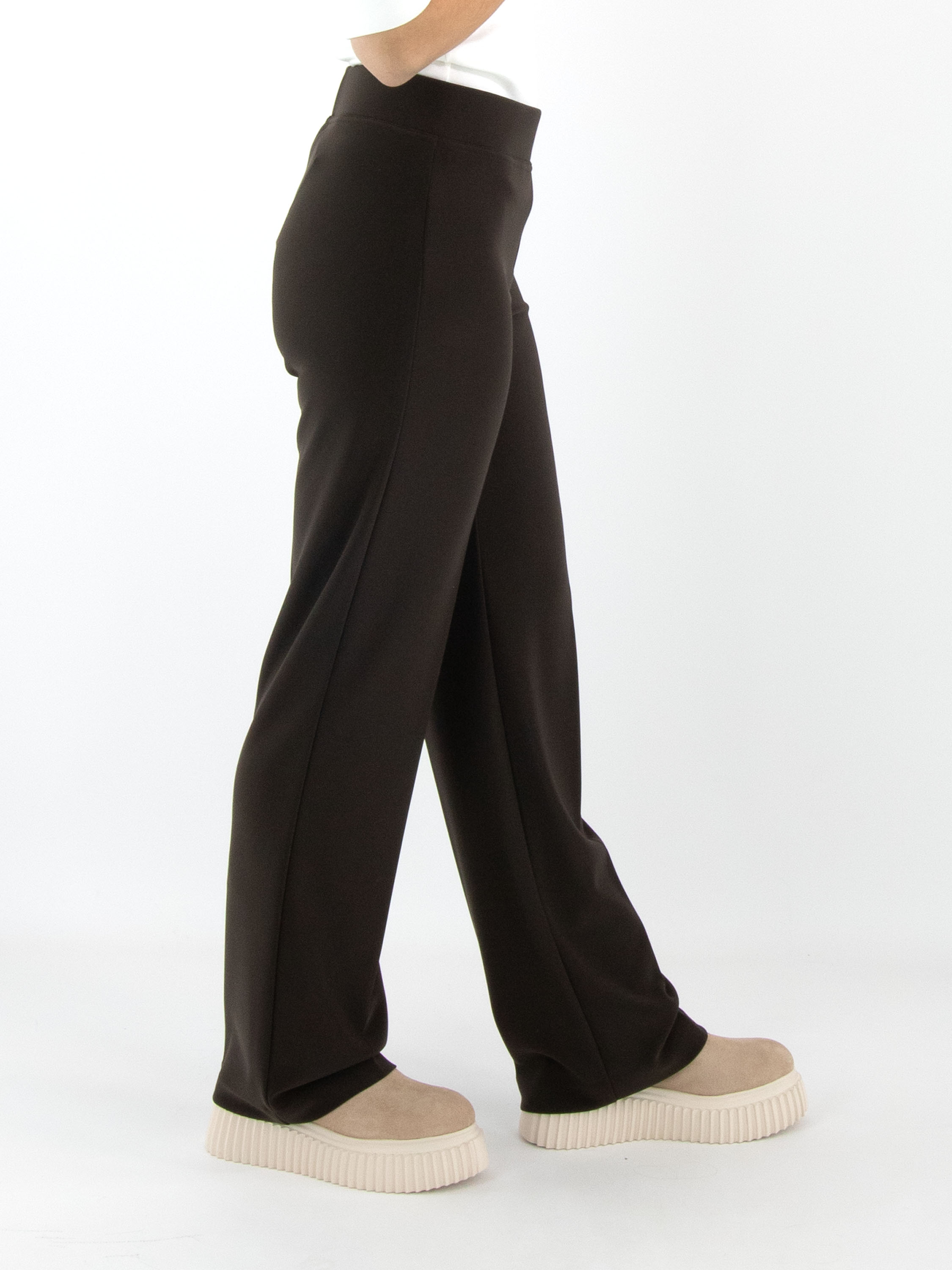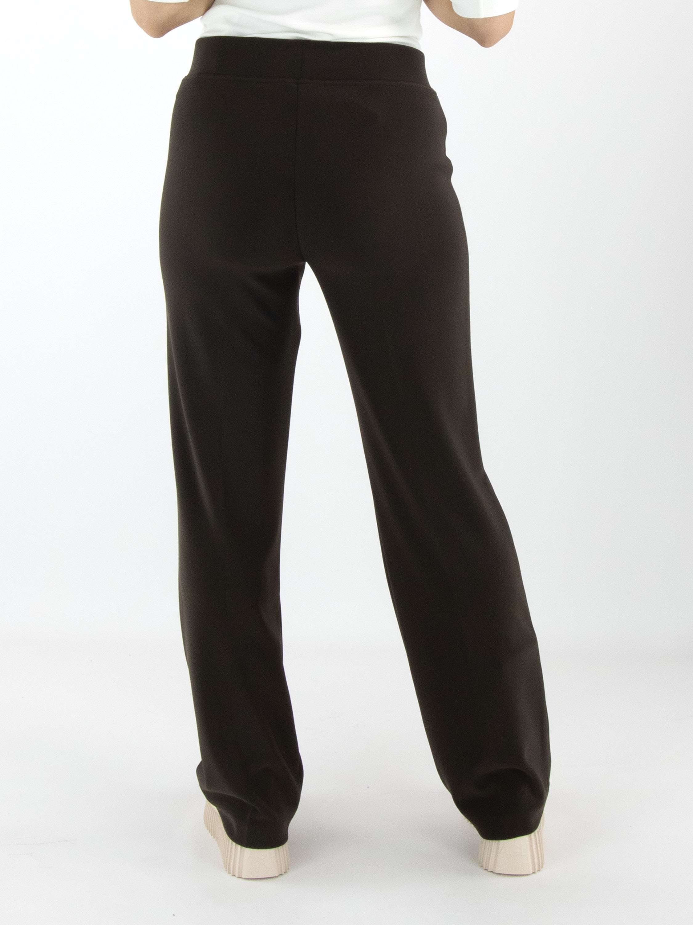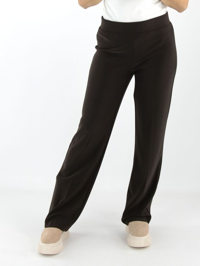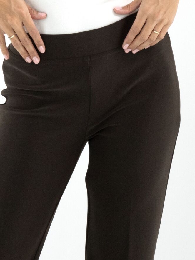 Un pantalon à coupe droite de Joseph Ribkoff en brun moka. La taille est dotée d’une large ceinture élastique. Un pli marqué descend au centre de chaque jambe. Ce pantalon peut être lavé à la main.