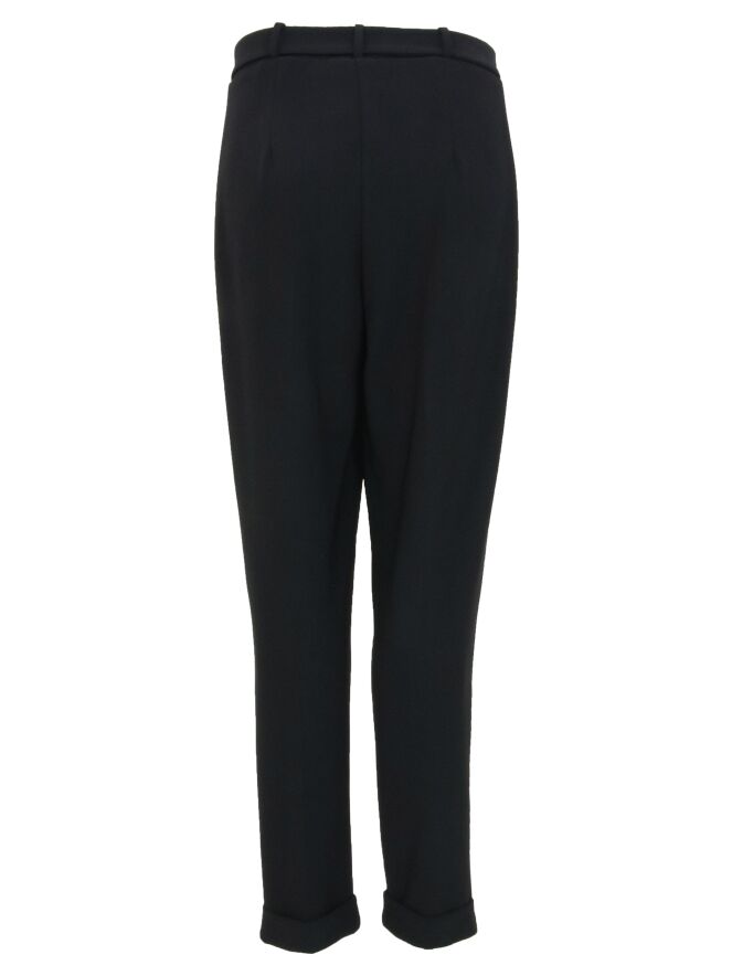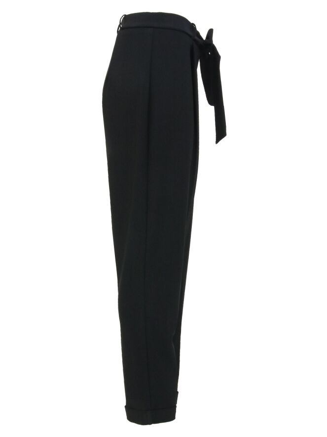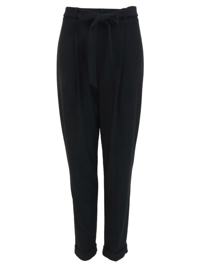 Pantalon de couleur noire de la marque Joseph Ribkoff. Le pantalon est orné d'une ceinture à nouer dans le même tissu que le pantalon. Le bas des jambes est équipé de revers. Lavage à la main.