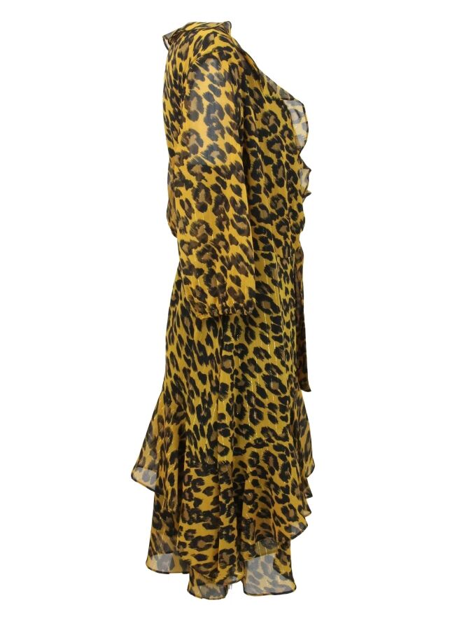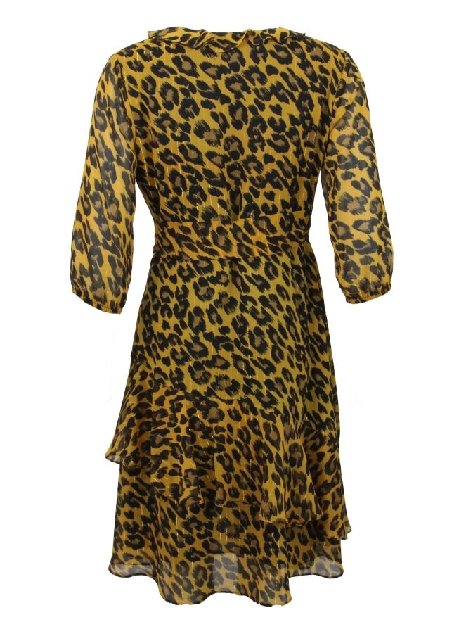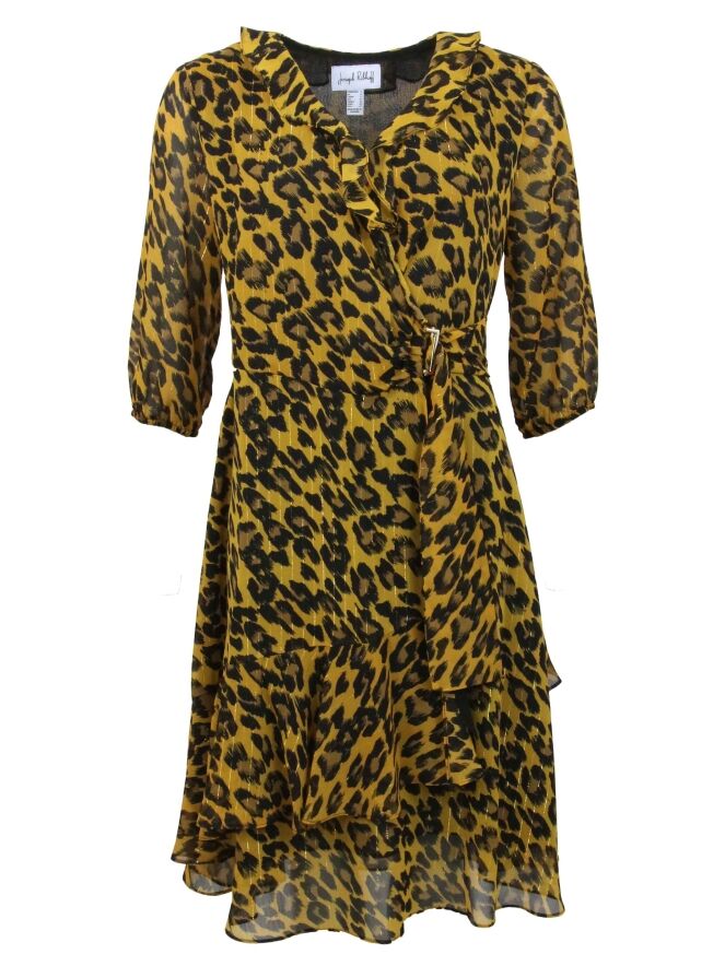 Robe fluide cache-cœur de la marque Joseph Ribkoff, imprimée d'un motif léopard aux couleurs ocre jaune et noir. Le col en V est bordé d'un volant débordant sur l'encolure. La robe est ornée de volants en biais décalés dans la partie inférieure. Les extrémités des manches mi-longues se ferment par élastique. La ceinture, faite dans le même tissu, enveloppe la taille depuis le côté gauche vers le dos et est munie d'une boucle métallique rectangulaire. La robe est doublée et peut être lavée à la main.