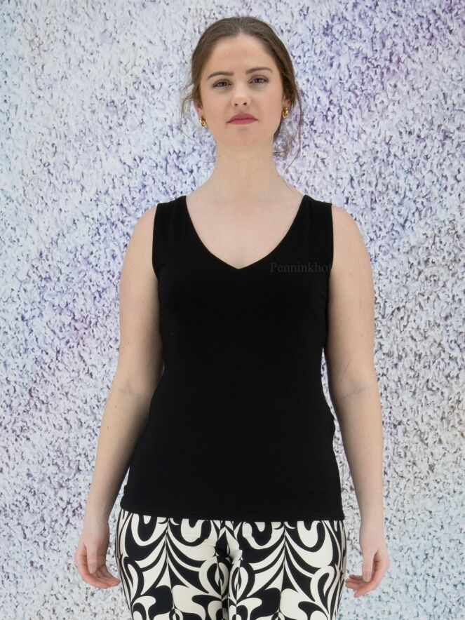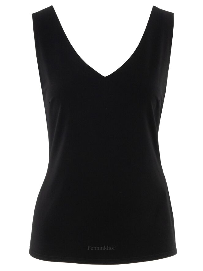 Top basique de Joseph Ribkoff, de couleur noire. Le top présente une encolure en V symétrique à l'avant et l'arrière. Les bretelles ont une largeur de 5 cm. Lavage à la main.