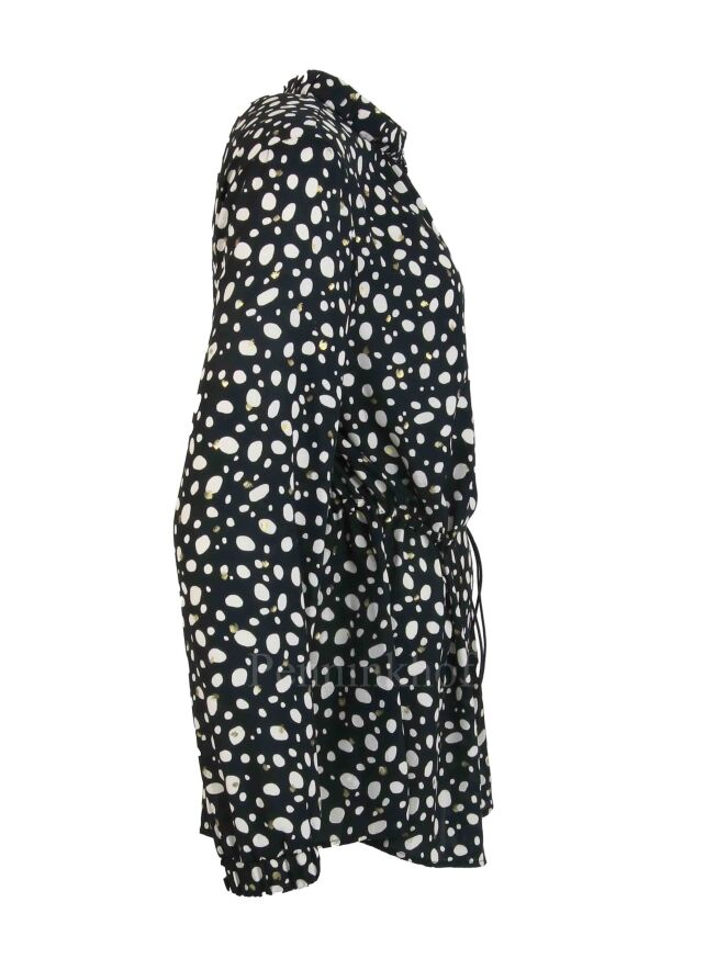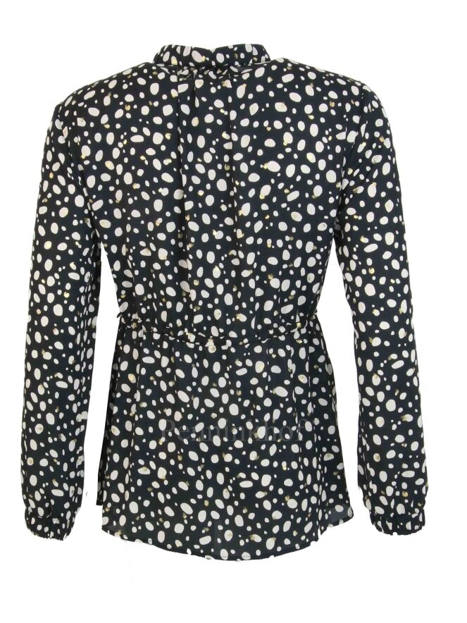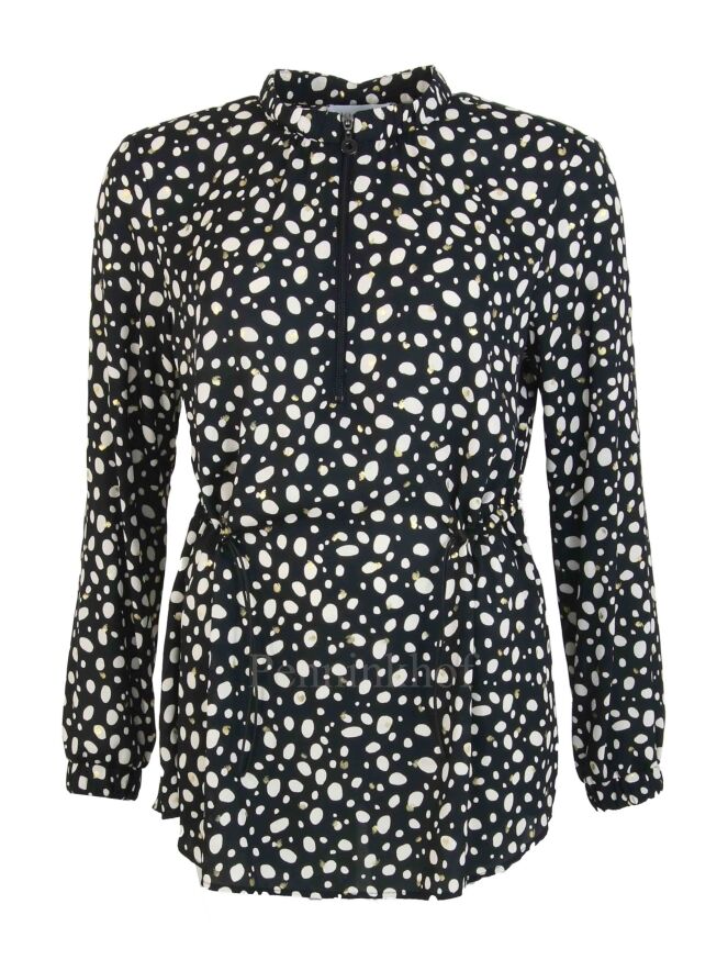 Chemisier de la marque Joseph Ribkoff, imprimé d'un mouchettis de pois multiformes aux couleurs blanc crème et noir et avec de petits détails dorés. Le bord du col rond très fermé est plissé. Le chemisier présente une fermeture Eclair et un cordon coulissant au niveau de la taille. Lavage à la main.