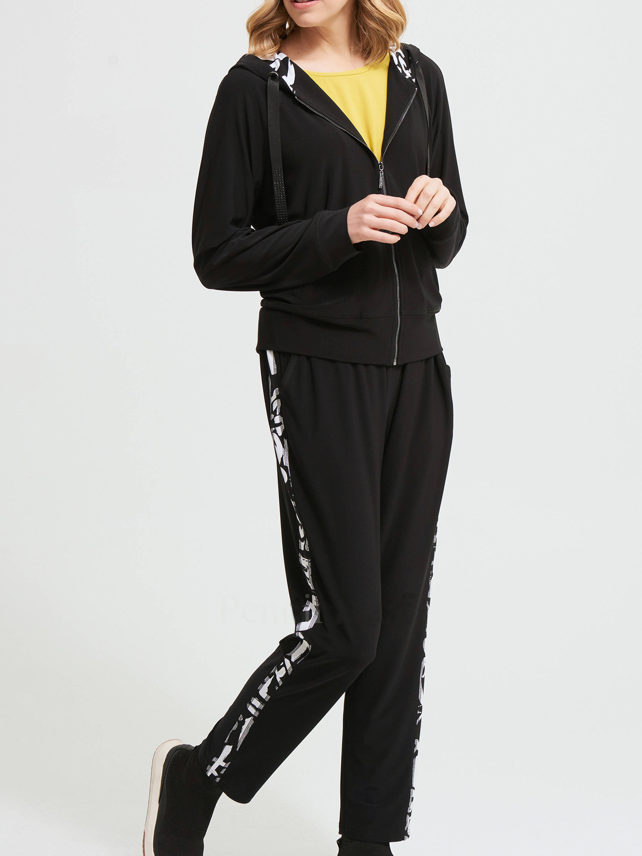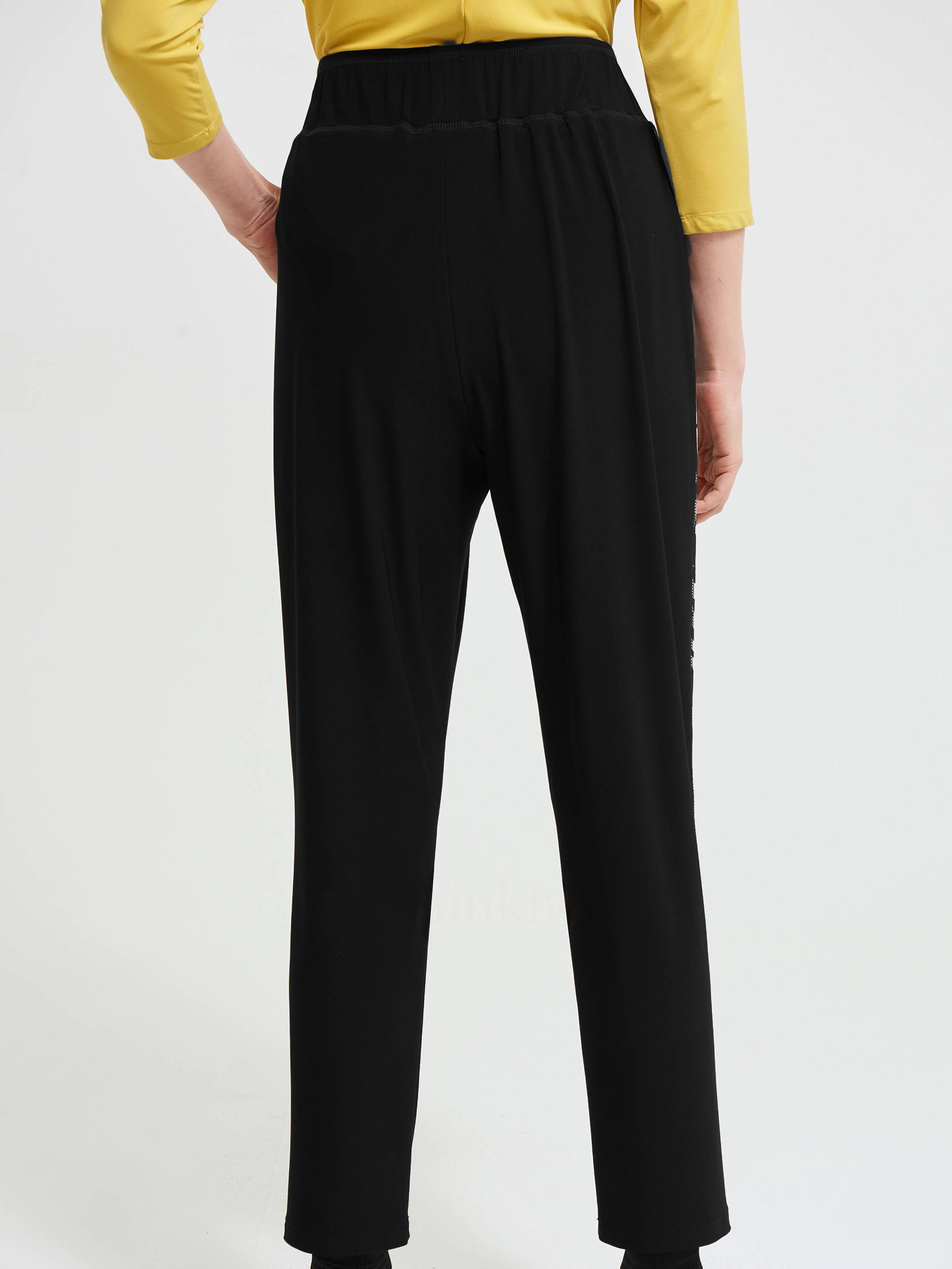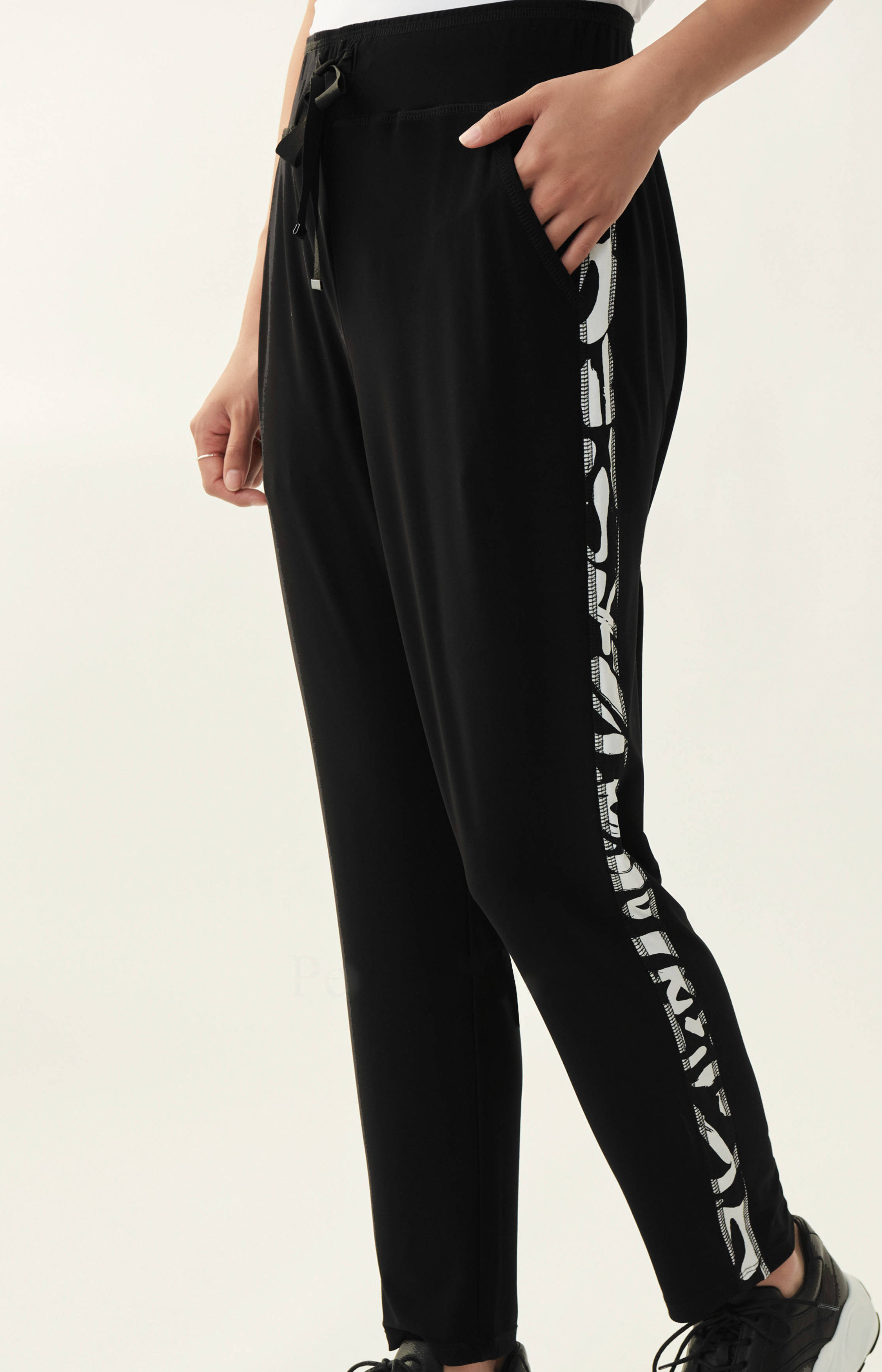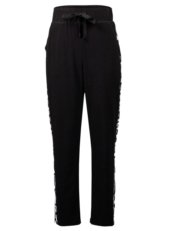 Pantalon de jogging de la marque Joseph Ribkoff, de couleur noire. Une bande élastique est insérée à la taille avec un ruban de serrage noué sur le devant. L'extérieur des jambes est orné d'un passepoil avec un imprimé graphique de couleurs noir et blanc. Lavage à la main.
