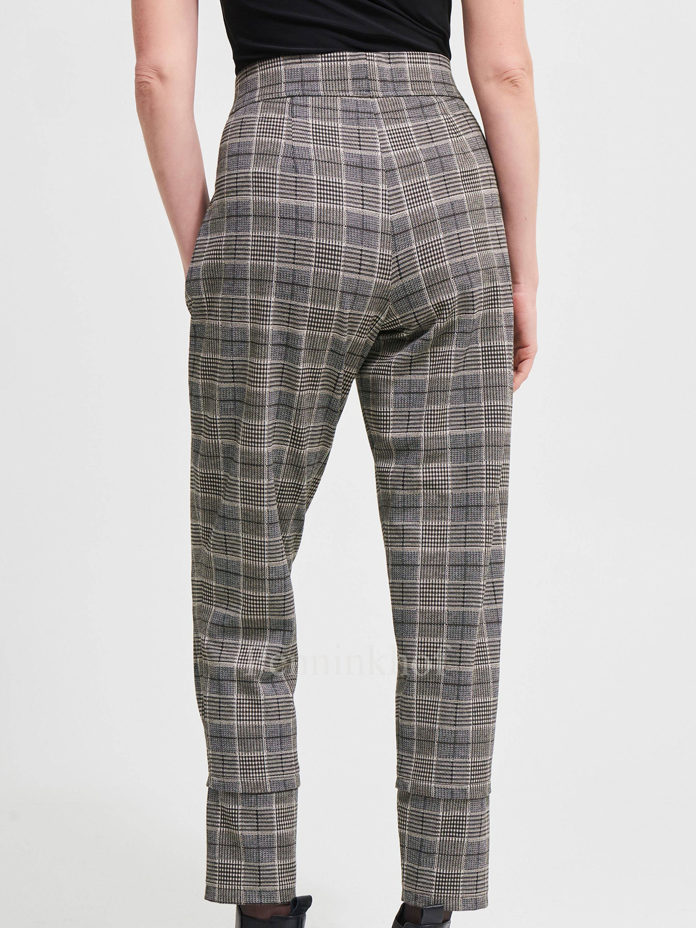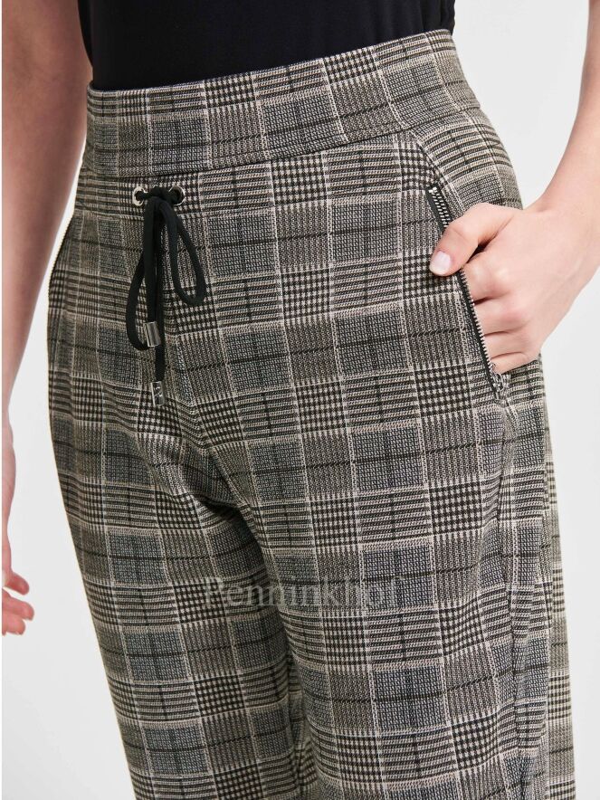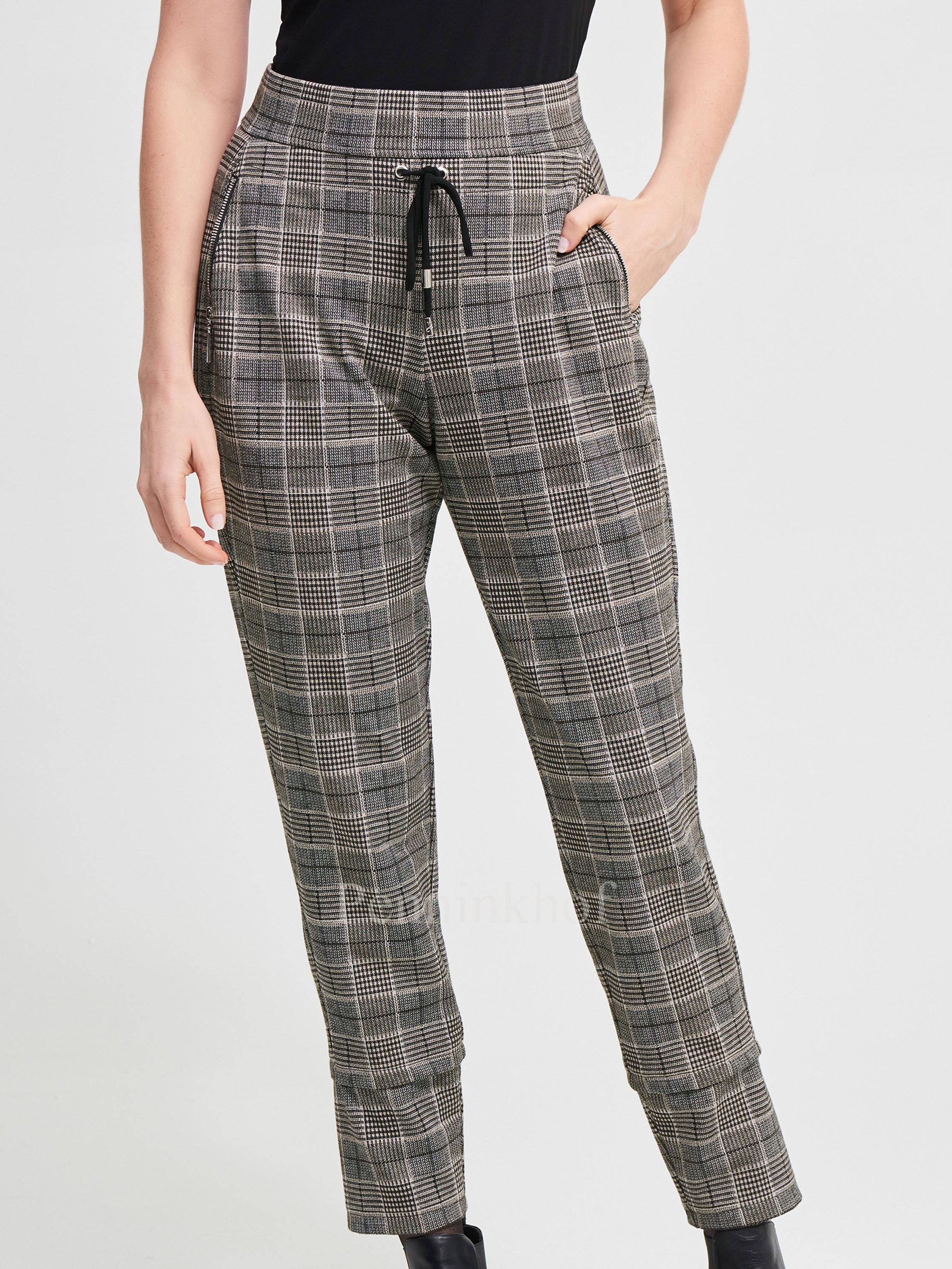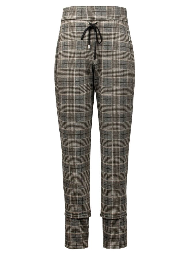 Pantalon de la marque Joseph Ribkoff, à carreaux Prince de Galles aux couleurs crème, beige et noir. La taille est dotée d'une bande élastique. A l'avant, un cordon noir à nouer est inséré sous la ceinture. Le pantalon est équipé de poches à l'avant avec un zip de fermeture de couleur argentée. Lavage à la main.