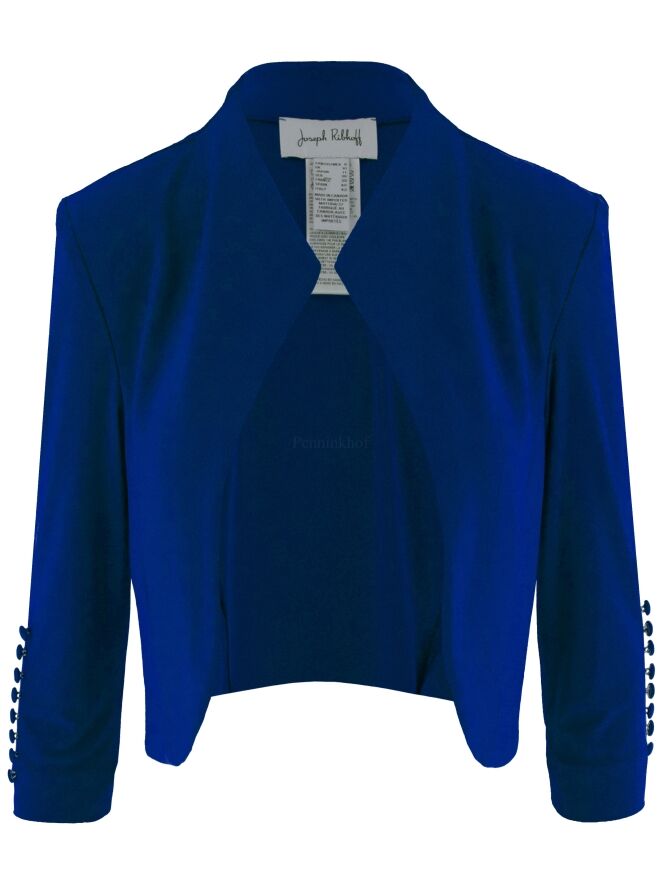 Un blazer boléro de Joseph Ribkoff en bleu cobalt. Les manches mi-longues sont ornées d'une rangée de huit boutons de manchette finement satinés. Ce boléro doit être lavé à la main.