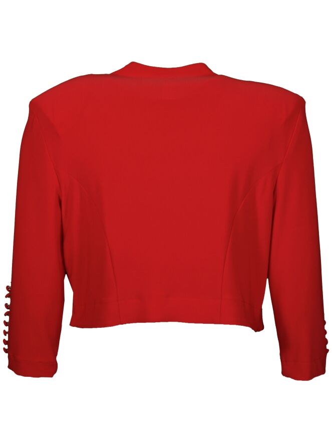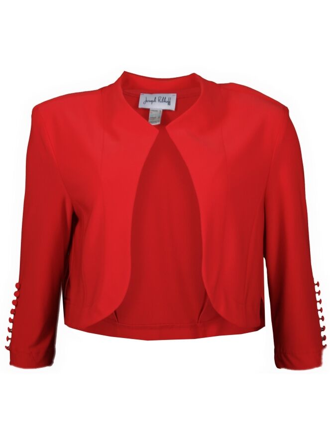 Elégante veste boléro de la marque Joseph Ribkoff, facile à combiner, de couleur rouge. Modèle à large ouverture sans fermeture. Ses manches sont équipées d'une rangée de huit fins boutons de manchette satinés. Lavage à la main.