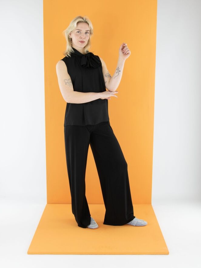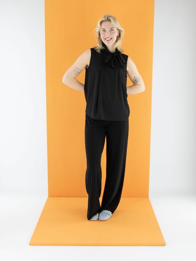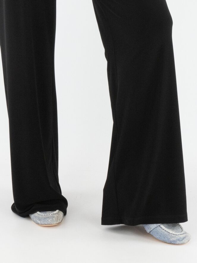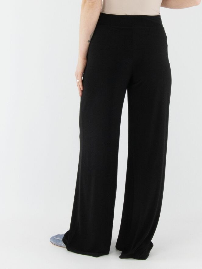 Un pantalon à jambe droite de la marque Joseph Ribkoff en noir. La taille est élastiquée. Ce pantalon peut être lavé à la main.