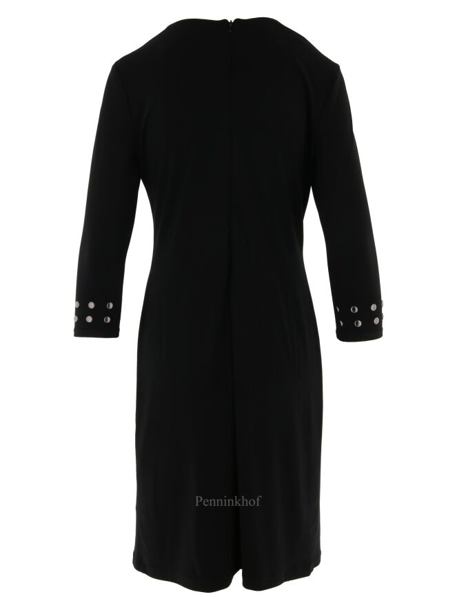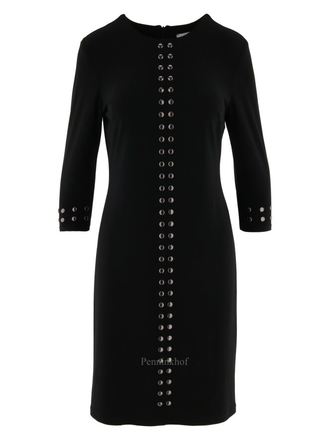 Robe à col rond de la marque Joseph Ribkoff, de couleur noire. A l'avant, une couture traverse la robe avec une double rangée de clous ronds couleur nickel. Une autre double rangée orne les poignets des manches mi-longues. L'ouverture de la robe se fait par un zip au niveau à l'arrière du col. Lavage à la main.