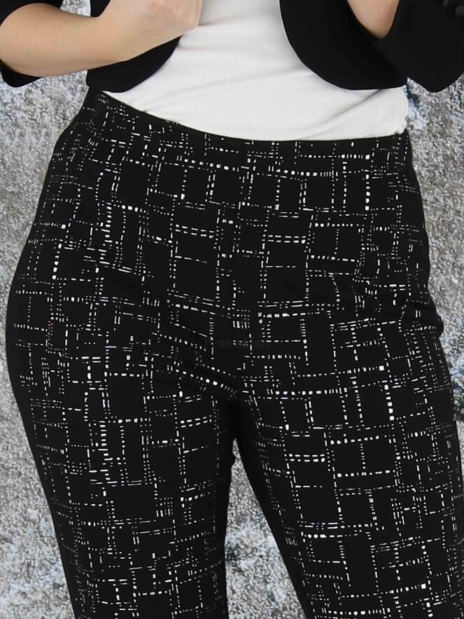 Pantalon de la marque Joseph Ribkoff, à motif de lignes pointillées et croisées en gris argenté en relief sur un fond noir. L'arrière est de couleur noire unie. La taille est élastiquée. Lavage à la main.