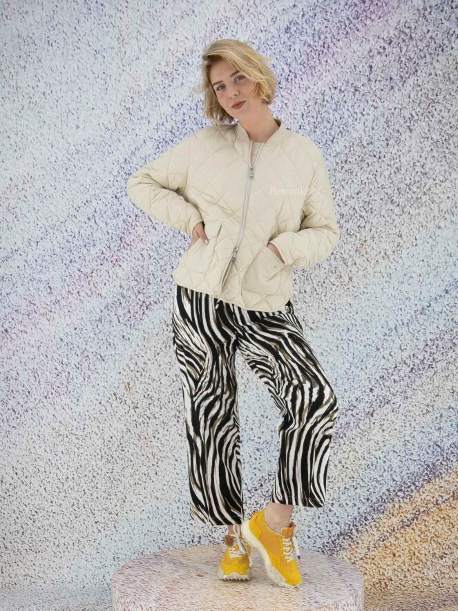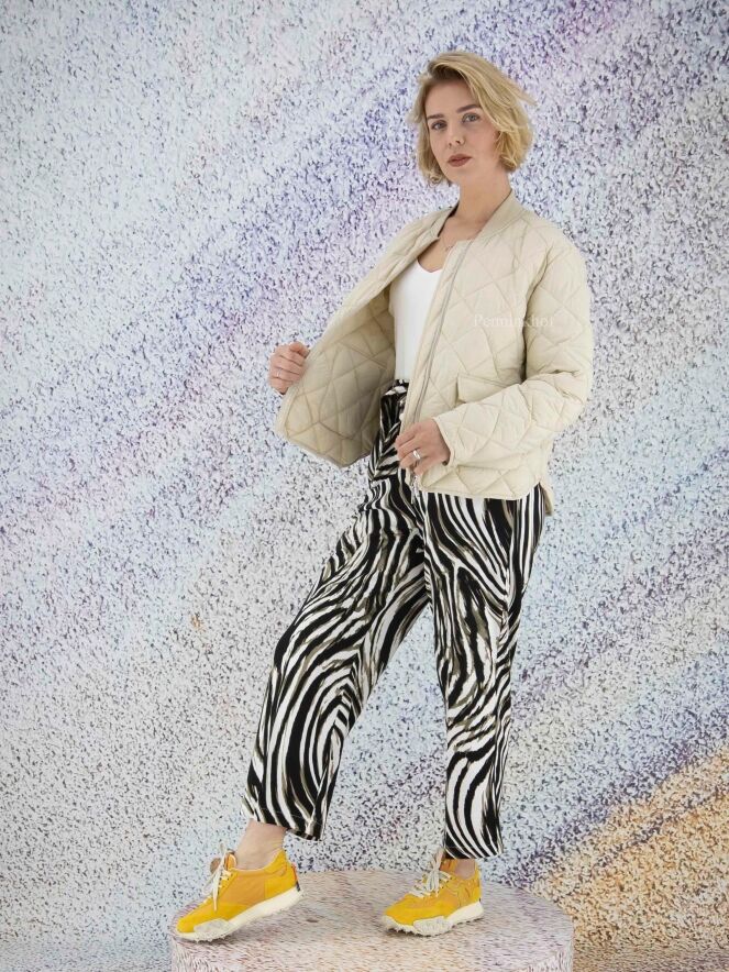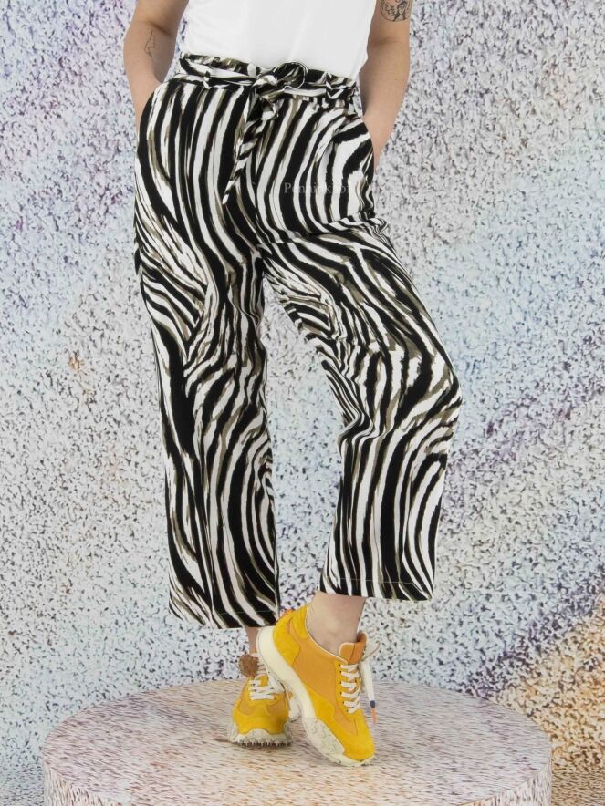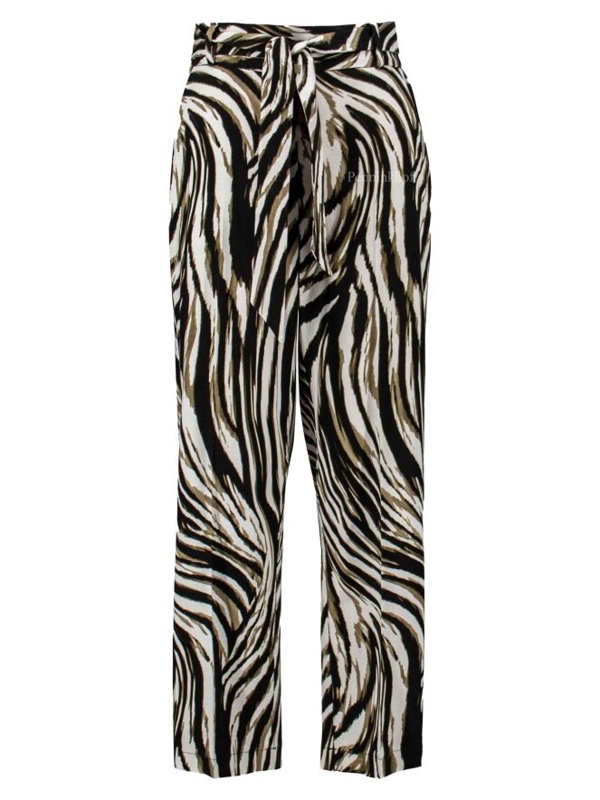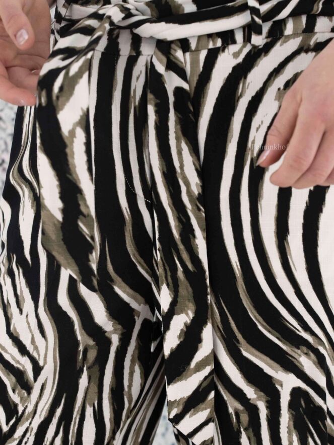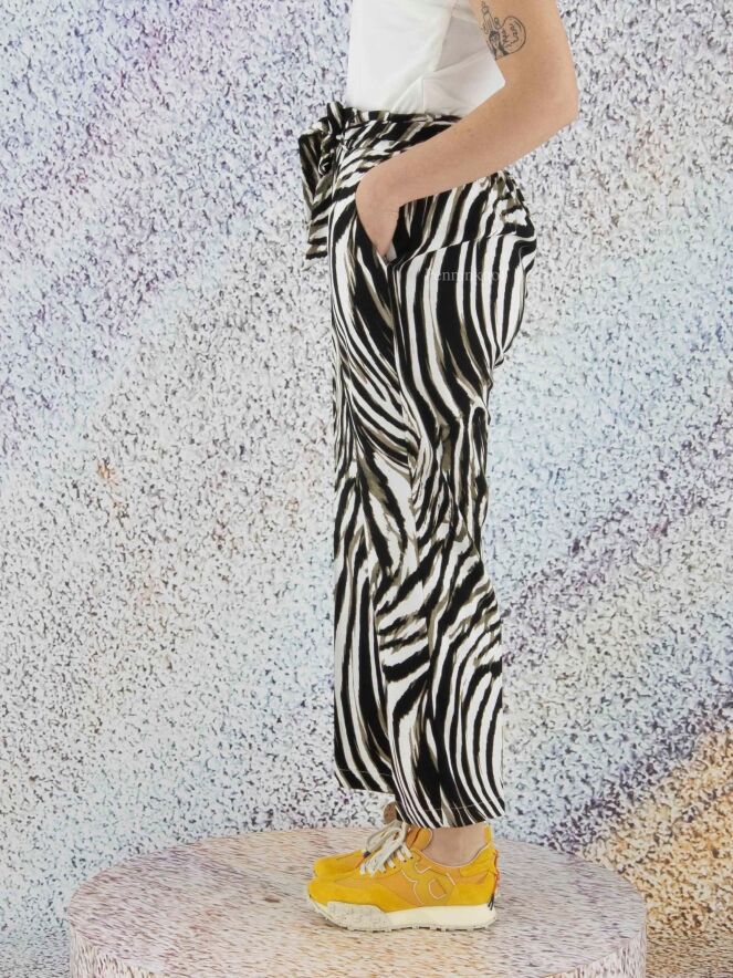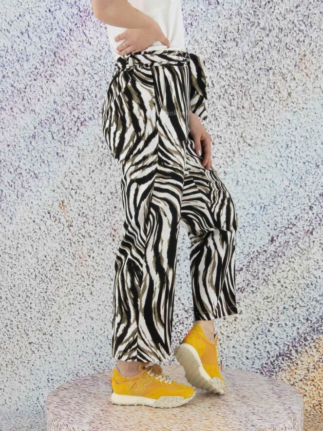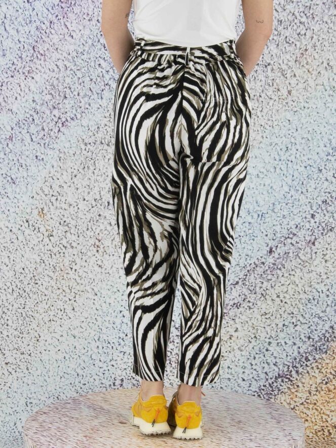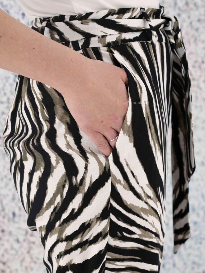 Pantalon de Joseph Ribkoff à l'imprimé zébré de couleurs vert olive, noir et blanc. Ceinture dans le même tissu que le pantalon. Élastique finement plissé dans le dos. Ce pantalon peut être lavé à la main.