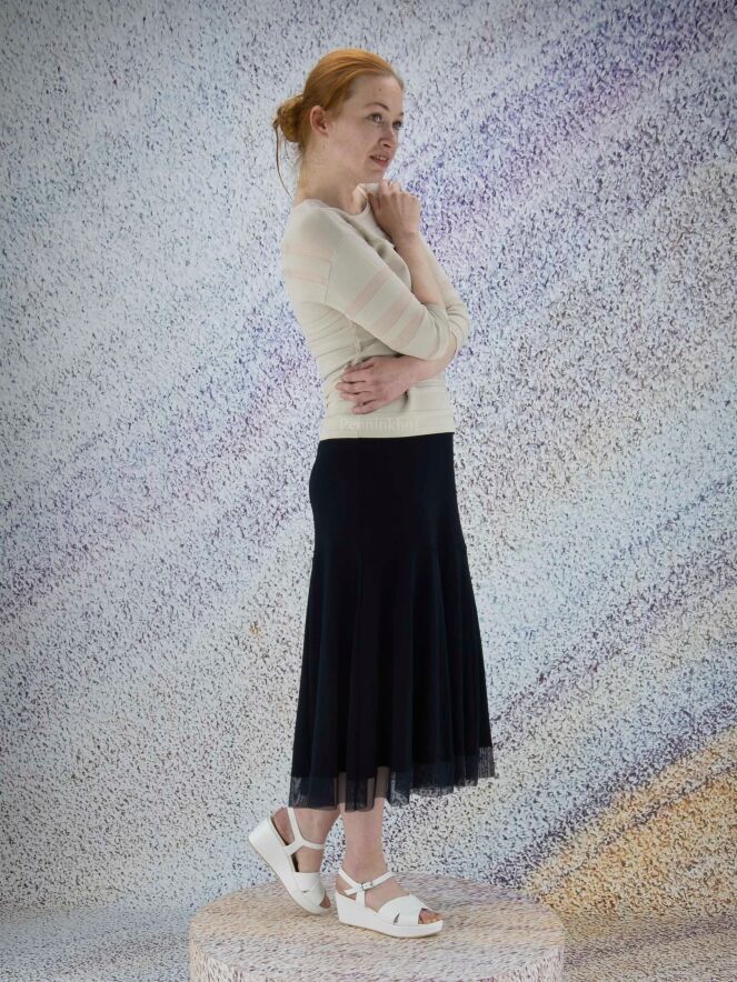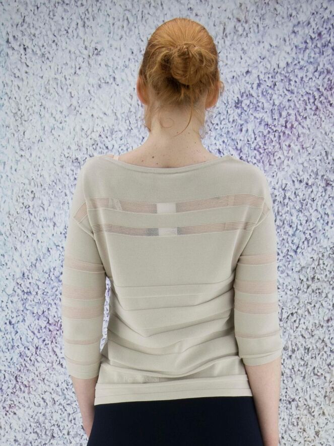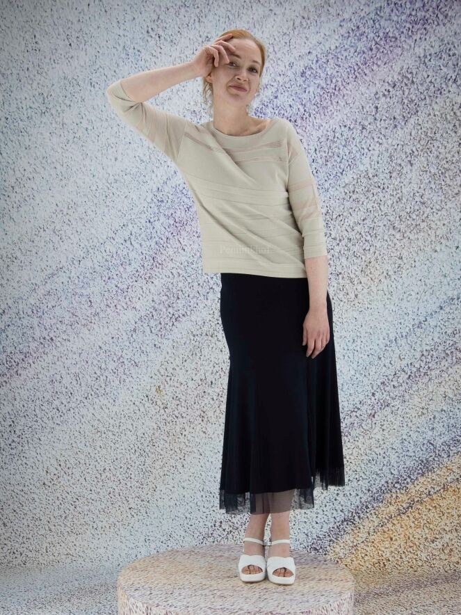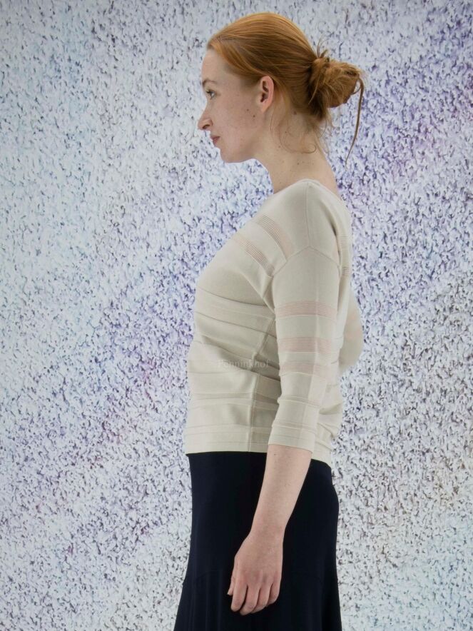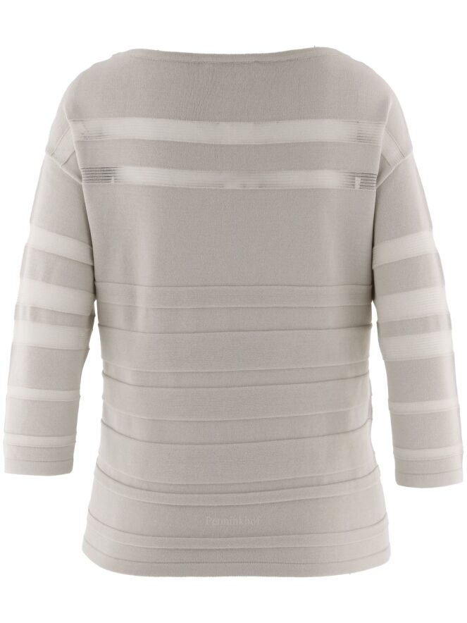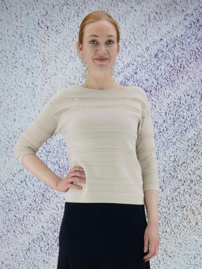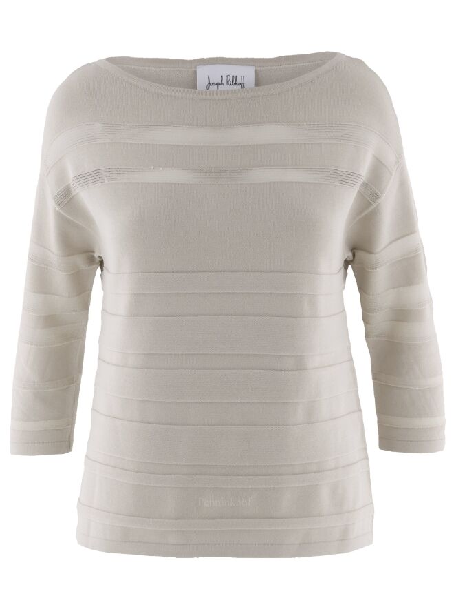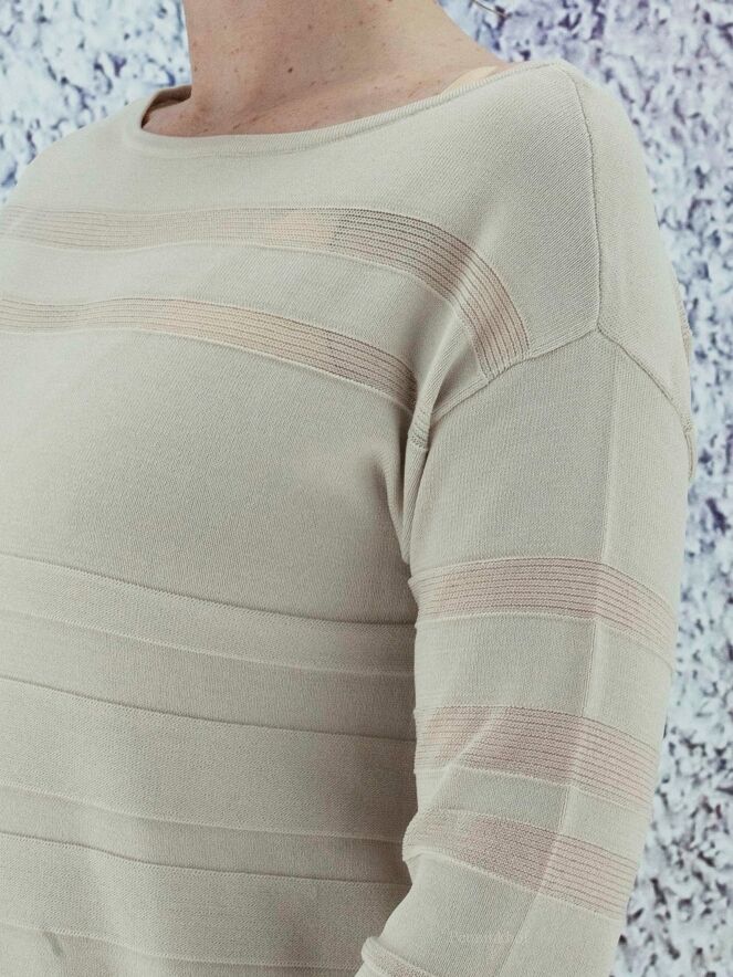 Pull de la marque Joseph Ribkoff dans une structure à rayures horizontales partiellement transparentes de couleur sable. Le pull présente une encolure large et des manches mi-longues. Lavage à la main.