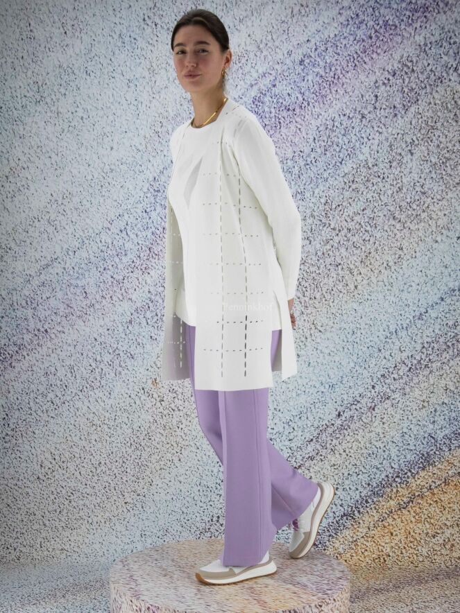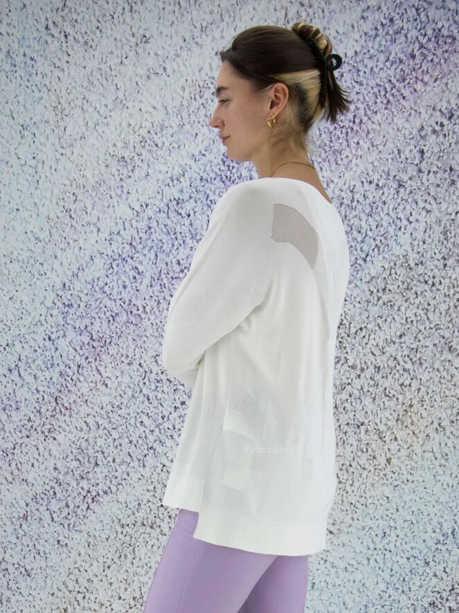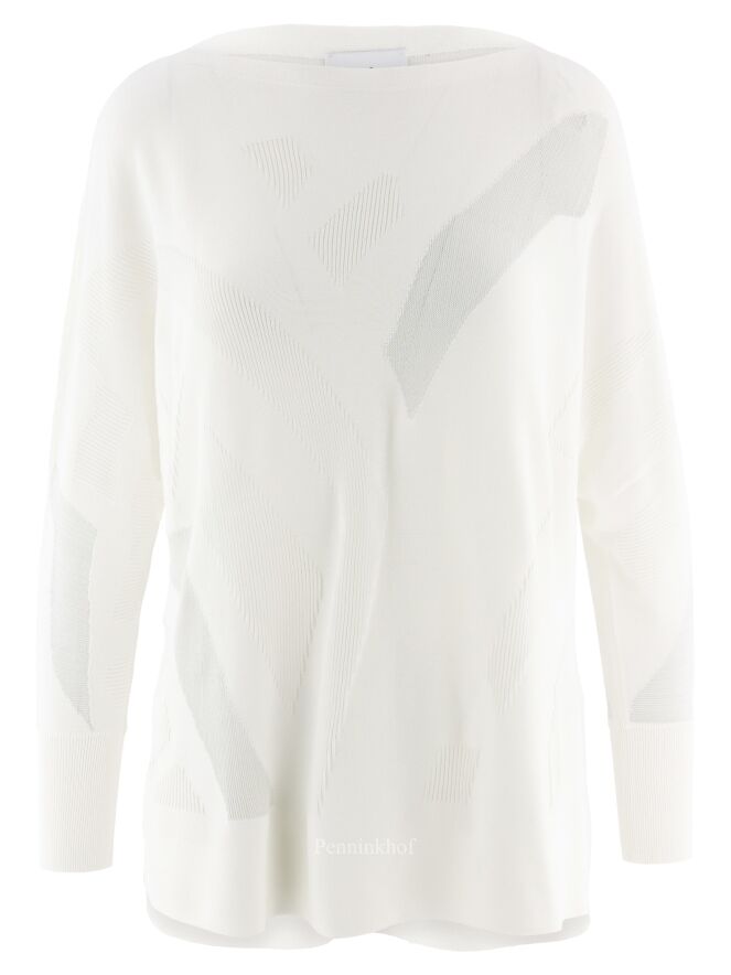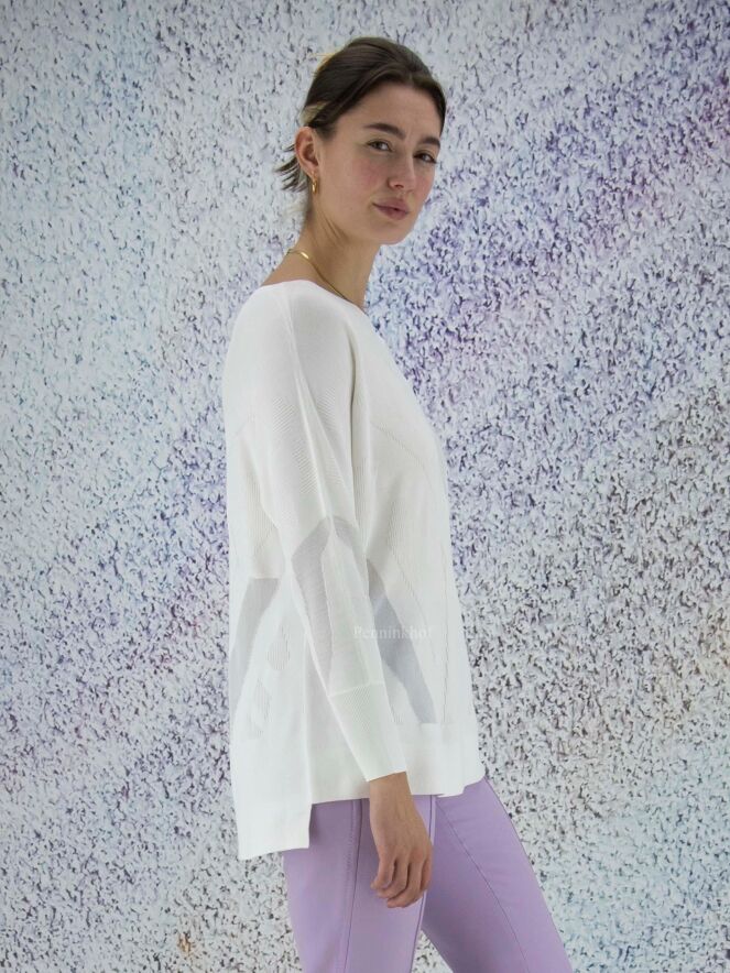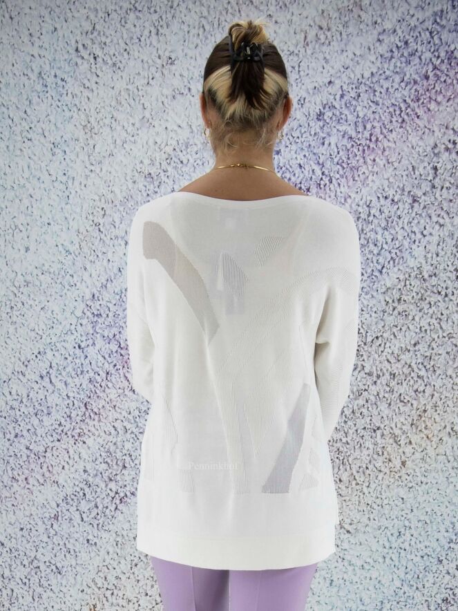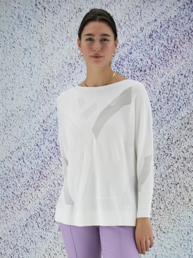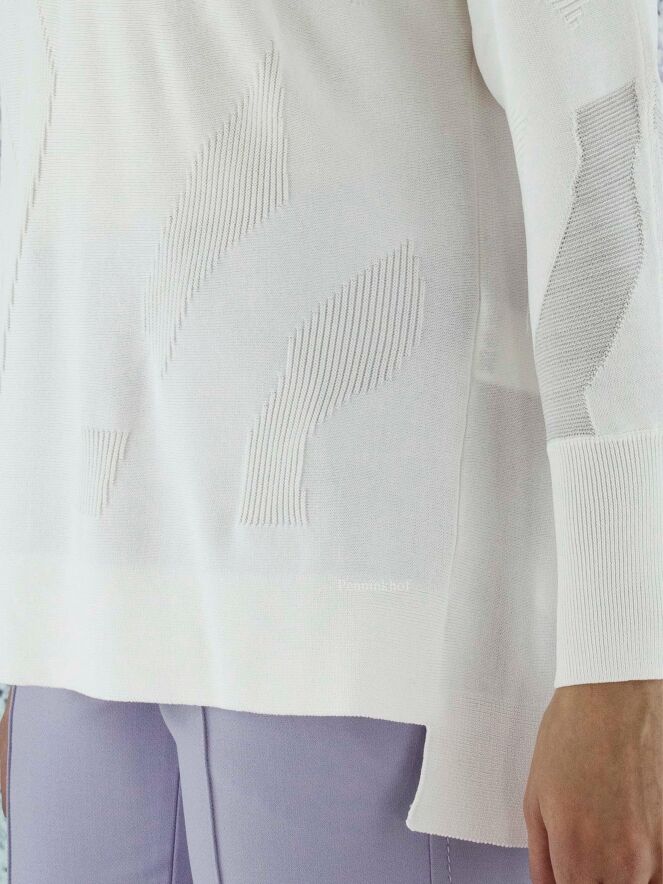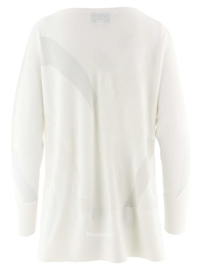 Pull de la marque Joseph Ribkoff, à imprimé graphique en relief côtelé de couleur blanc crème ton sur ton. Dans l'imprimé, deux parties transparentes ont un fil d'argent également tissé à travers le tissu. L'ourlet à l'arrière est légèrement plus long que l'ourlet à l'avant. Lavage à la main.