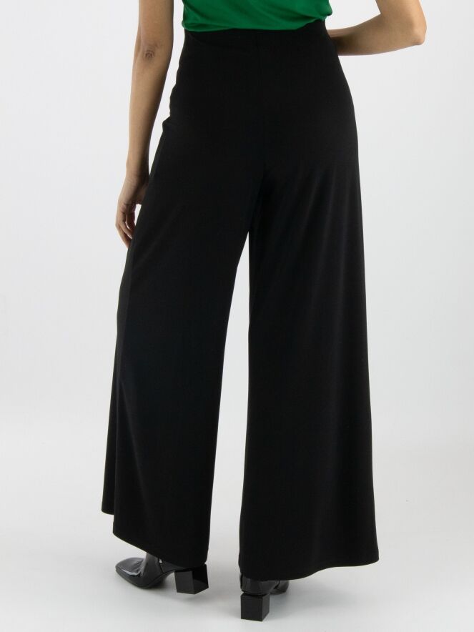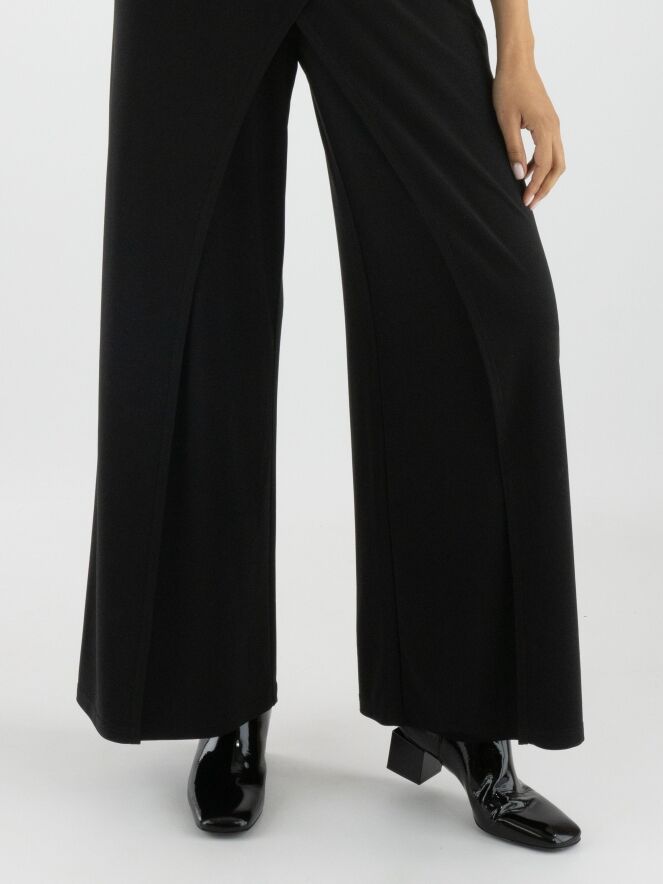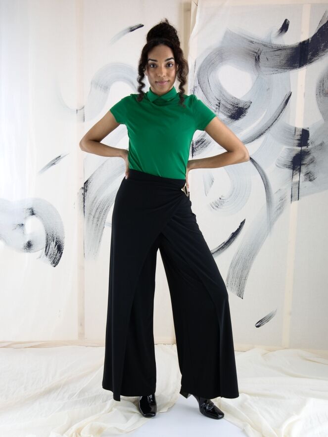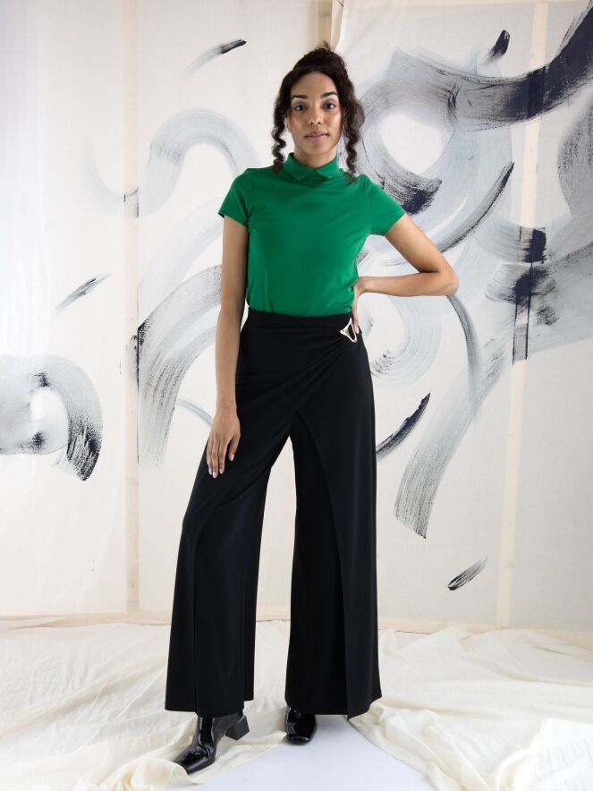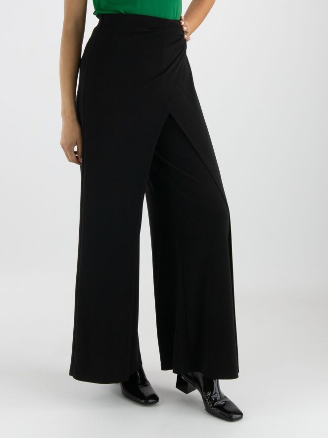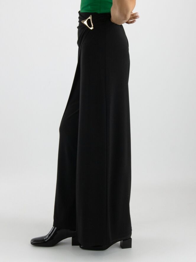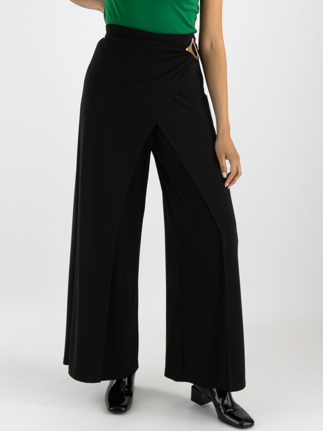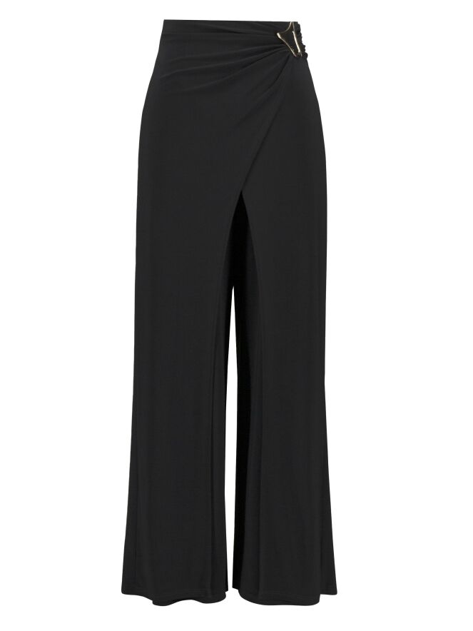Un pantalon de luxe de la marque Joseph Ribkoff en noir. Le pantalon présente une structure croisée au niveau de la hanche. En haut, il y a une boucle décorative dorée. Les jambes sont faites de tissu double dans un style croisé depuis la taille. Ce pantalon peut être lavé à la main.