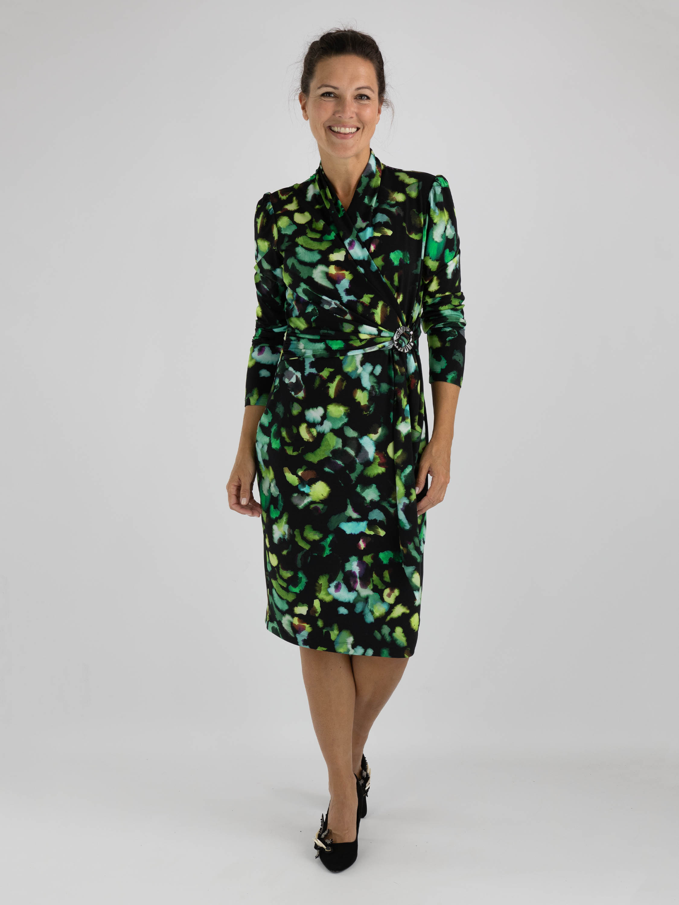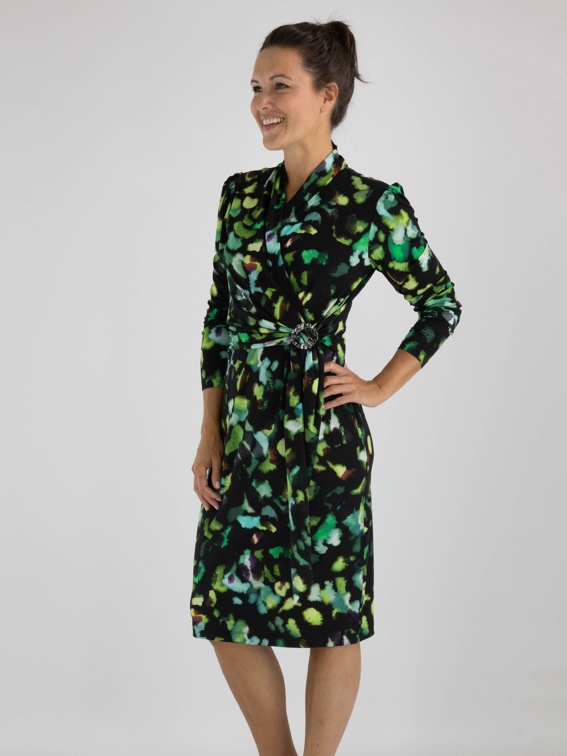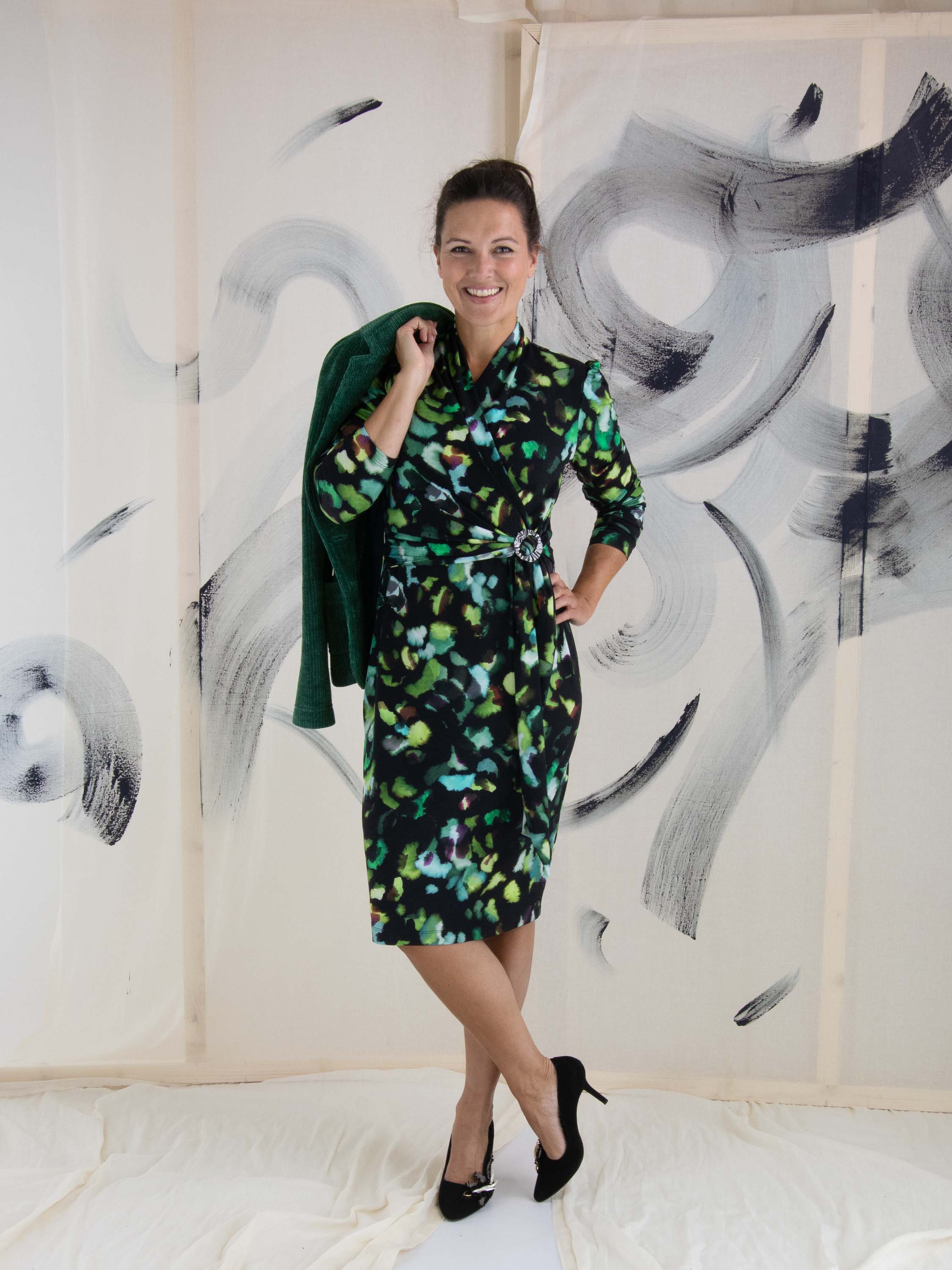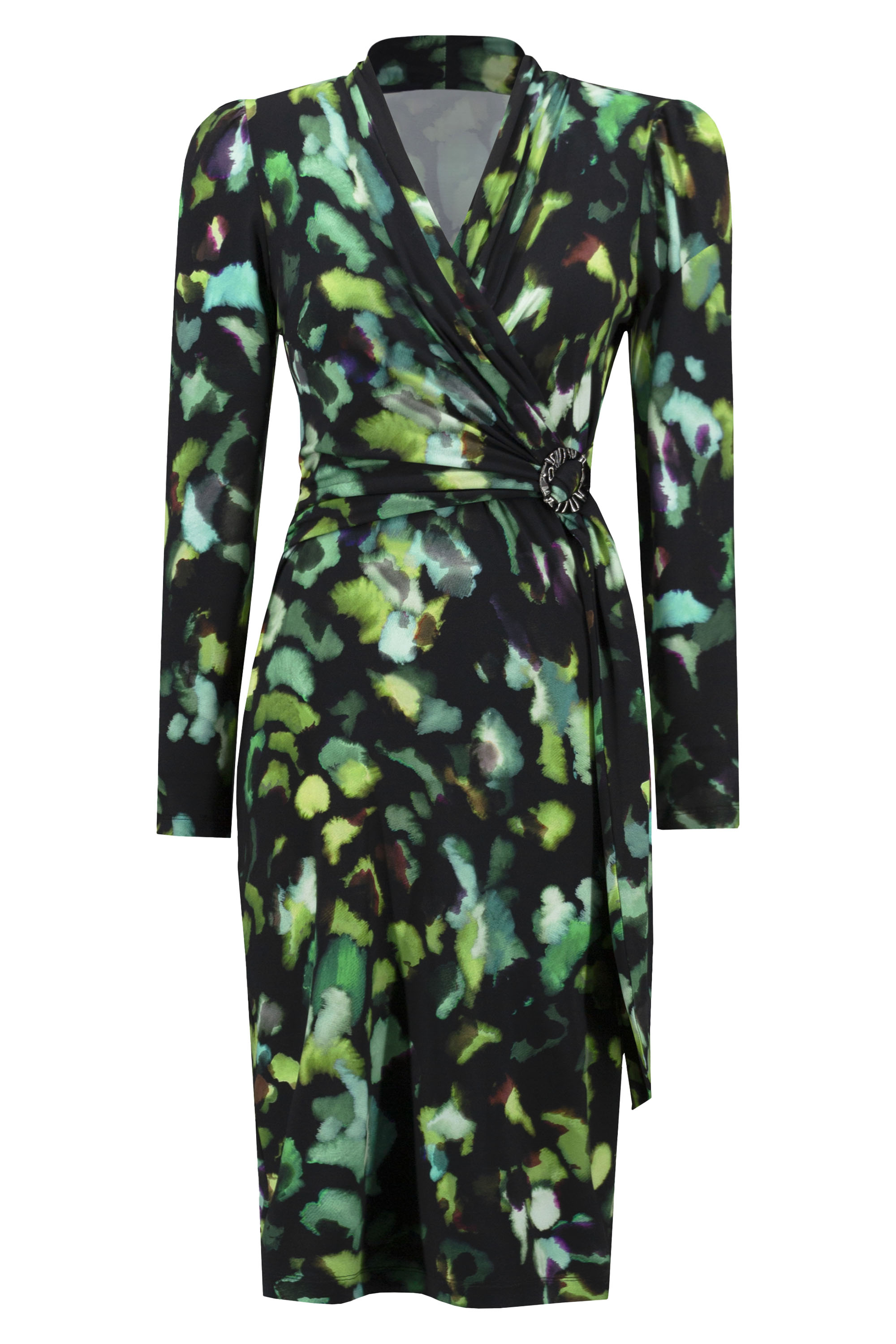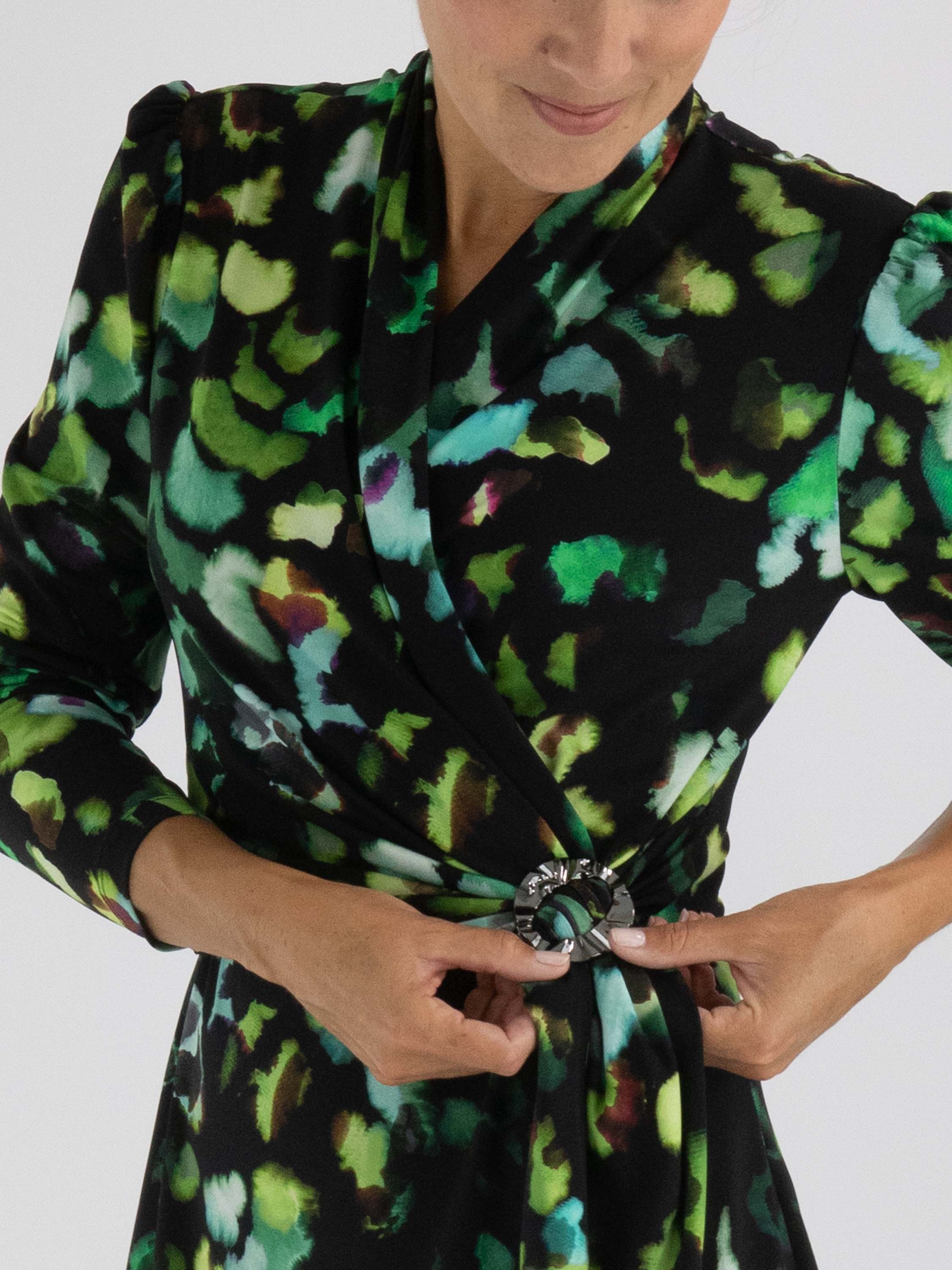 Une robe portefeuille de Joseph Ribkoff présentant un imprimé graphique avec plusieurs nuances de turquoise et vert avec du brun sur un fond noir. La fermeture de la robe portefeuille à la taille est assurée par une boucle de couleur nickel et une ceinture ruban. La robe a des manches longues et peut être lavée à la main.